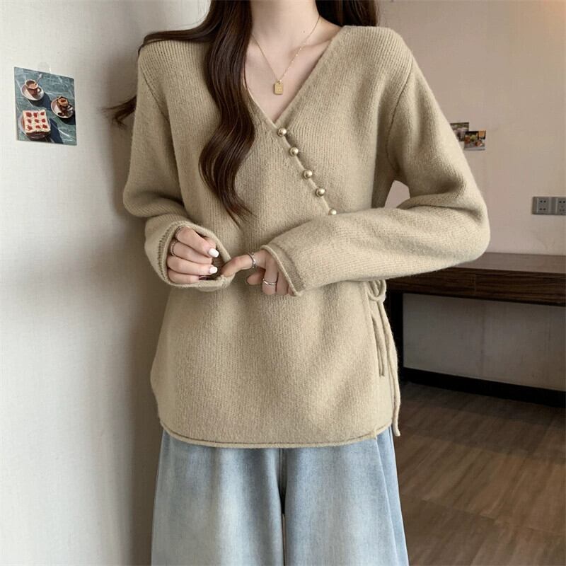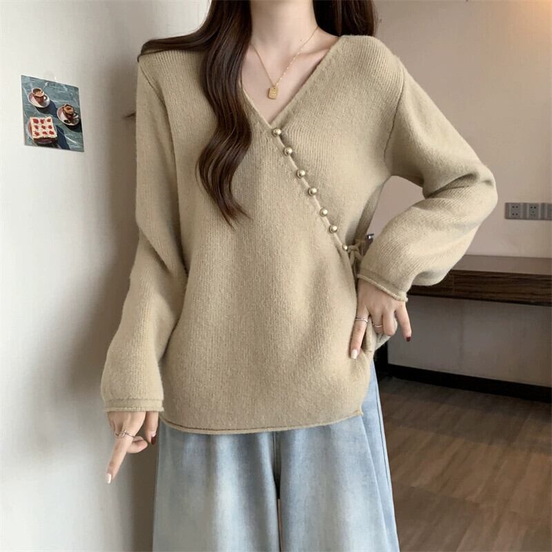 大きいサイズの秋の新しいセーター太った女性不規則な斜めボタン V ネックファッショナブルでユニークなレース カーディガン セーター トレンド 大きめサイズ オータム 秋物 Vネック 8884153882247225