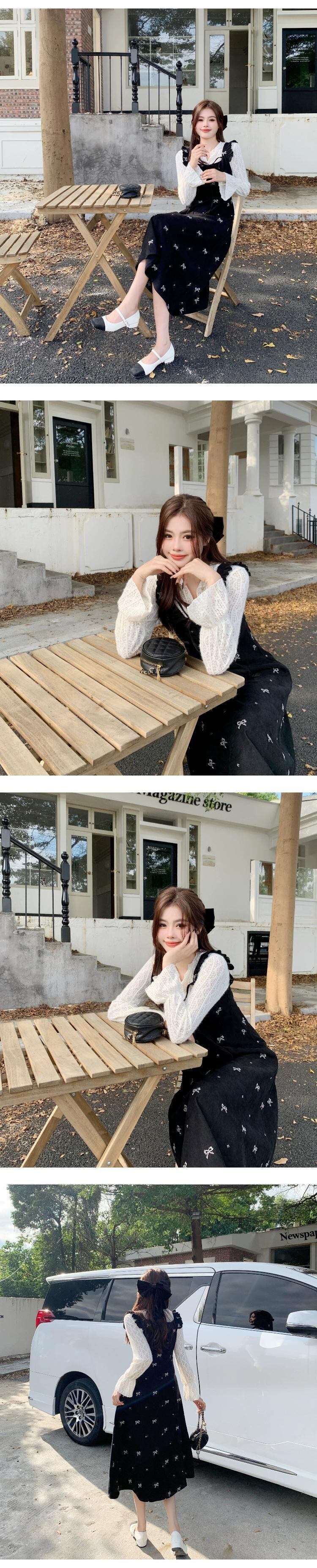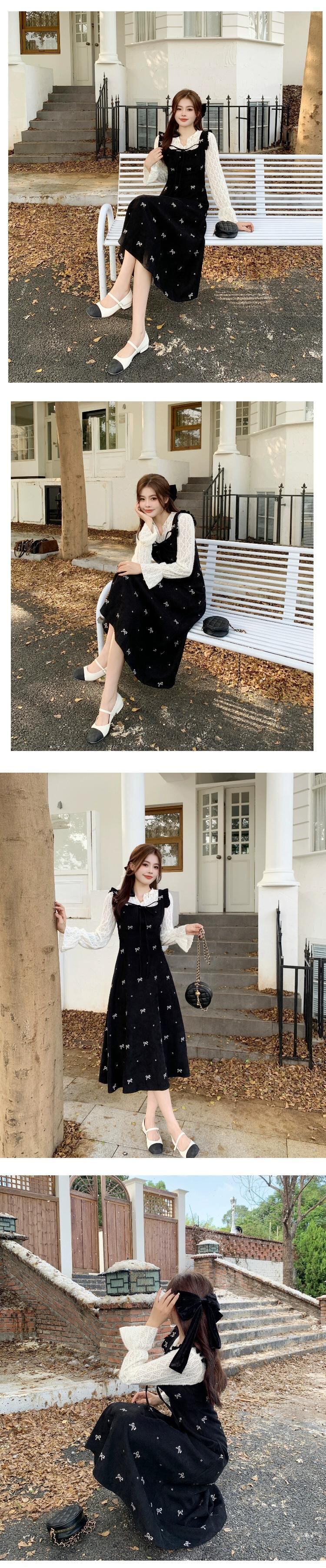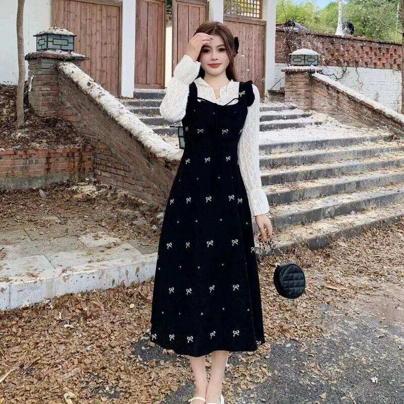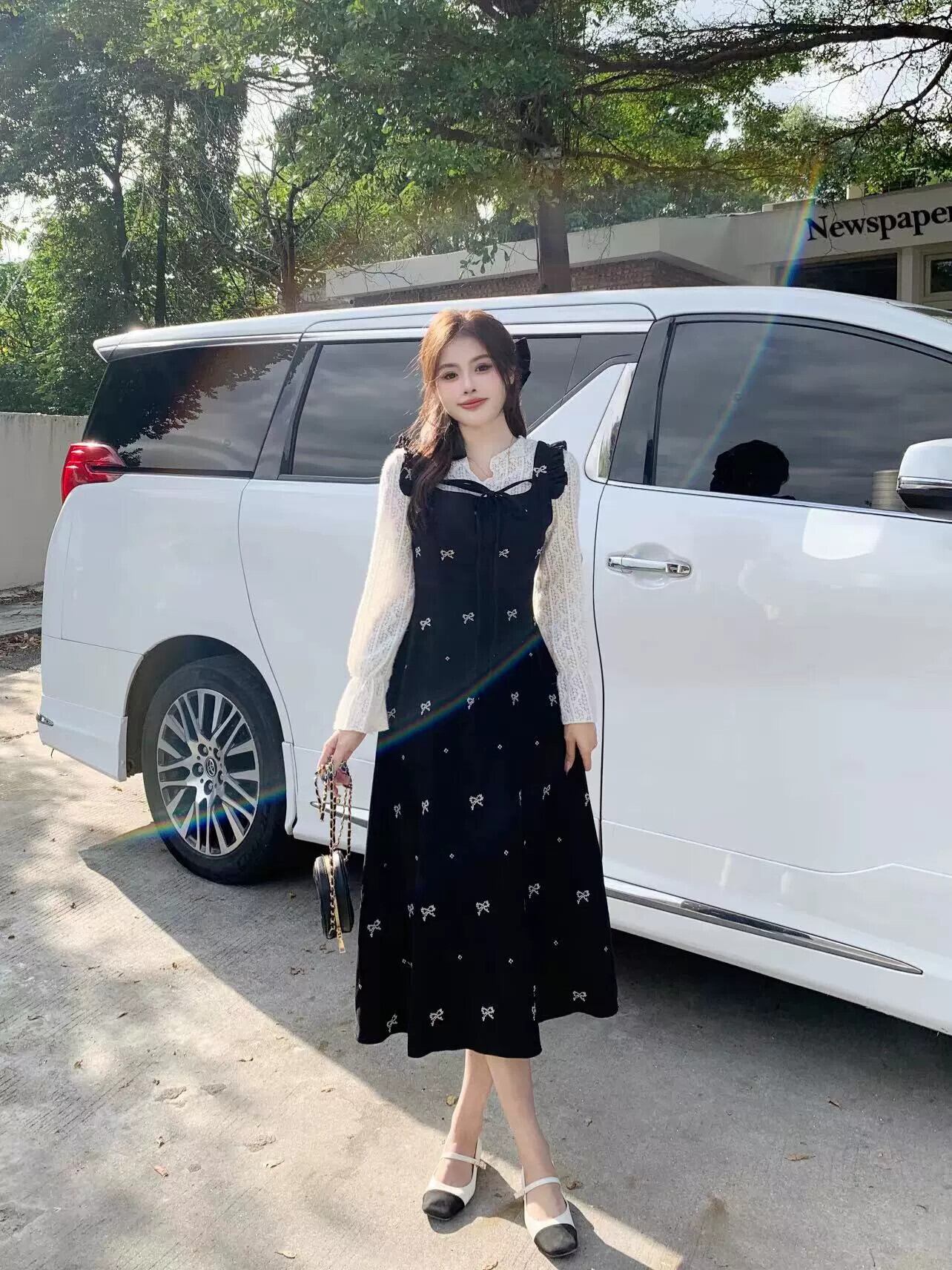 プラスサイズの婦人服 2023 トレンディな秋の新スタイルファットシスター多用途長袖レースシャツスリムサスペンダースカート 2 点セット女性 ロング 大きめサイズ オータム 秋物 8884189025717467