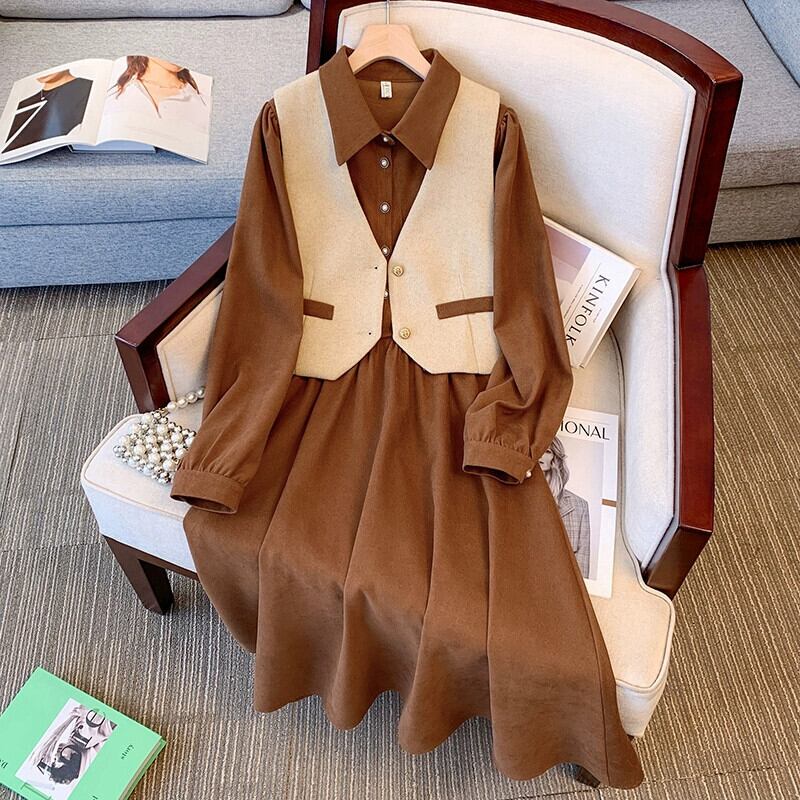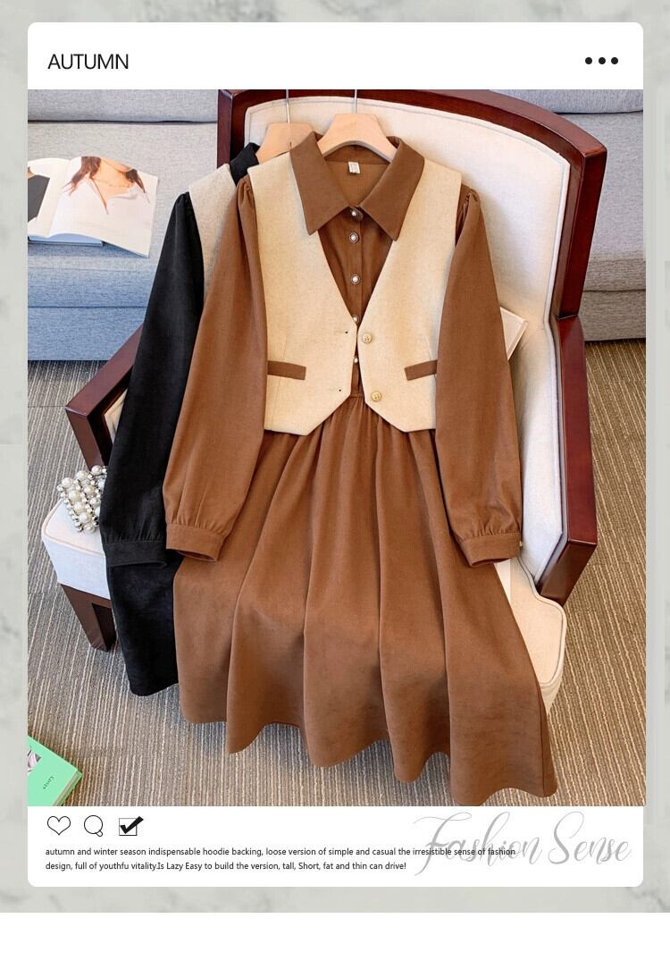 プラスサイズの女性の脂肪 mm フレンチレトロな気質冬の新 2023 スリム無地長袖ドレス 2 点セット ロング 大きめサイズ ウィンター 冬物 ソリッドカラー 8884114255956189