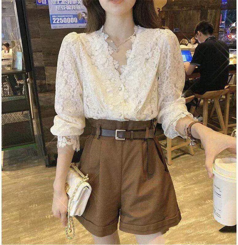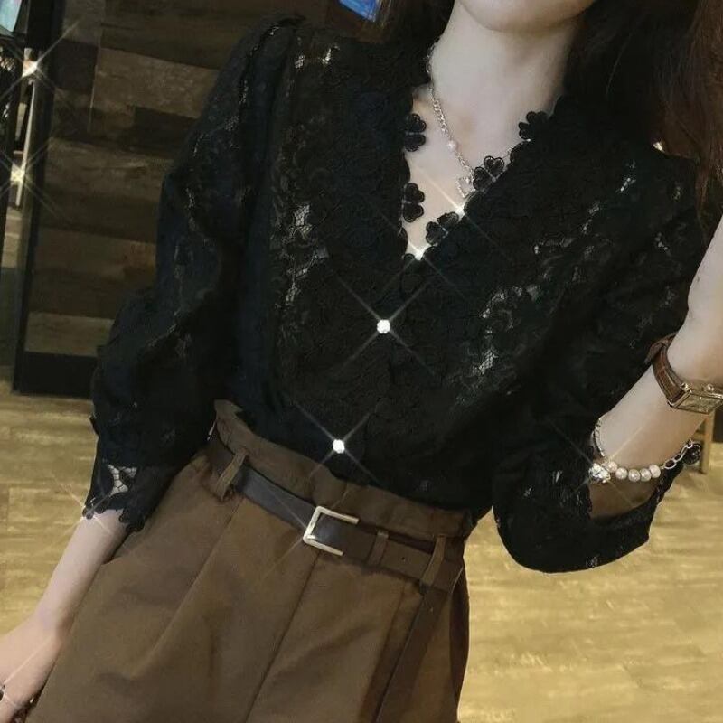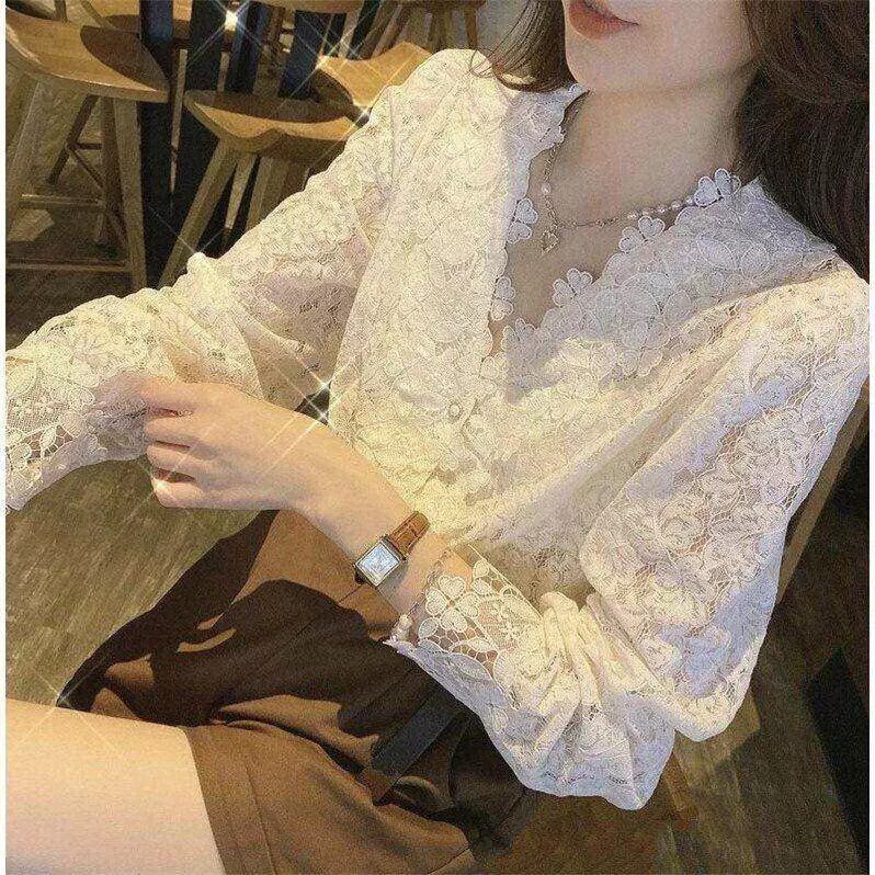 プラスサイズの女性の 2023 トレンディな秋スタイルファットシスターレース V ネックトップ西洋スタイル長袖シングルブレストシャツ ロング 大きめサイズ オータム 秋物 Vネック 8884124214205847