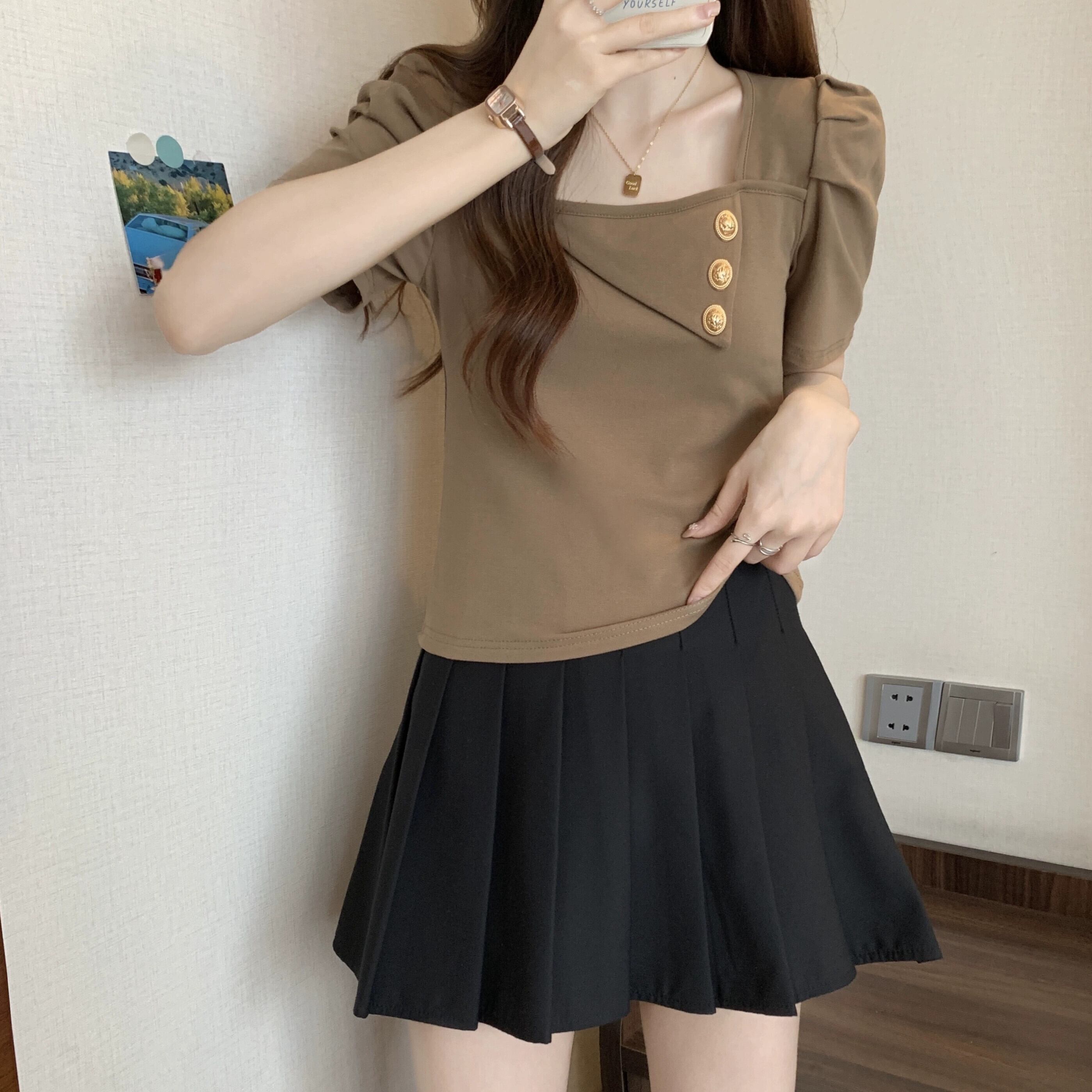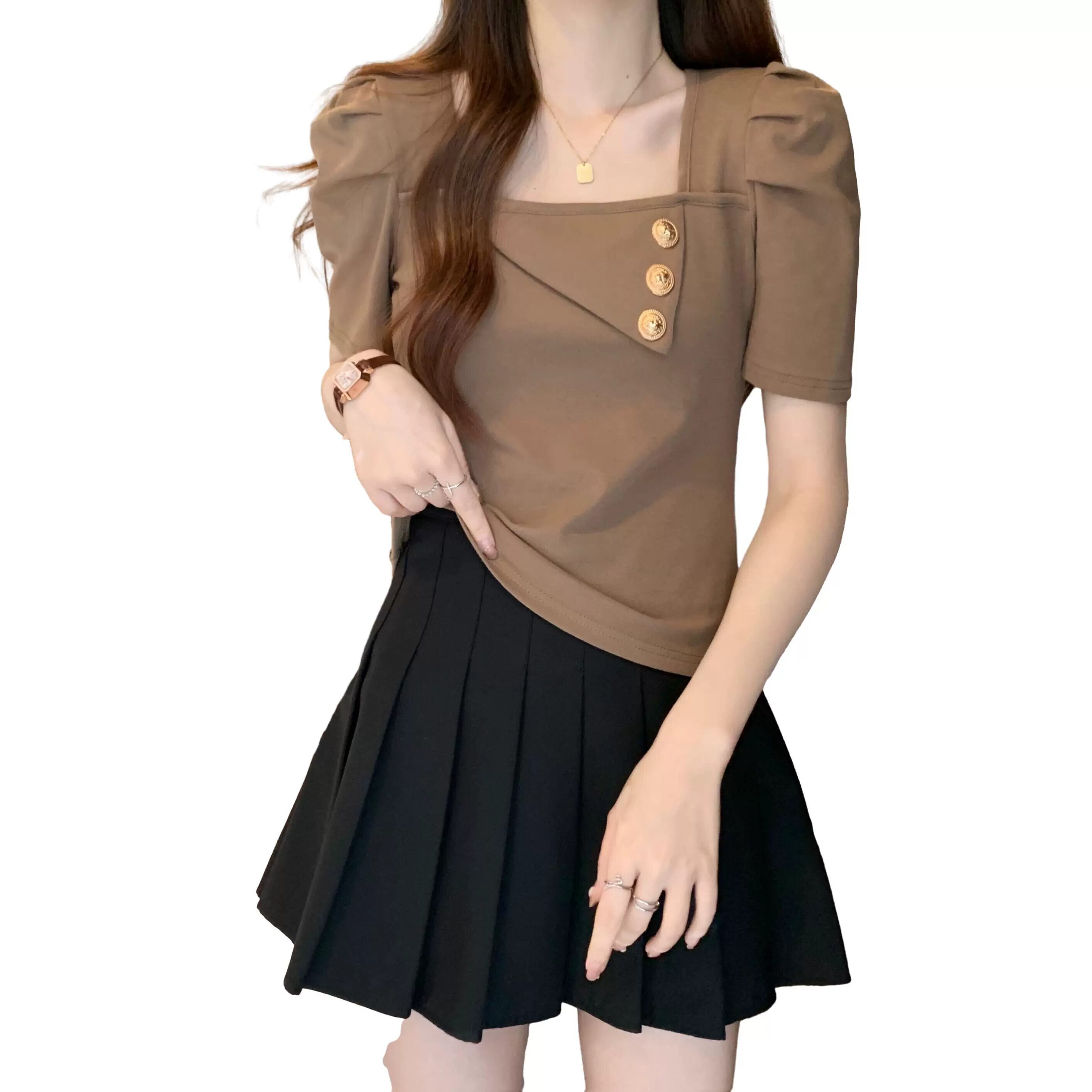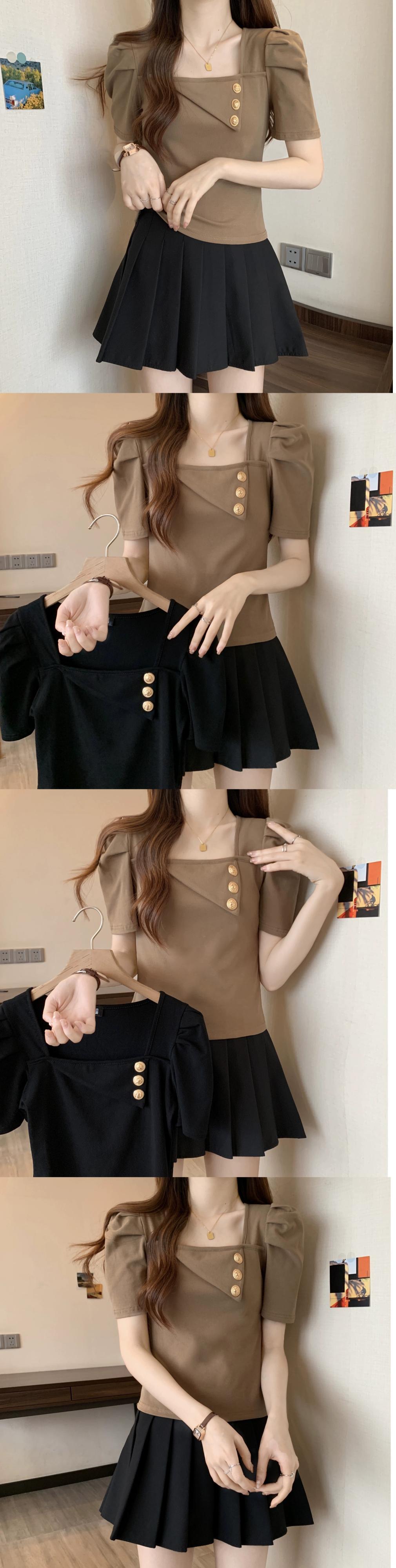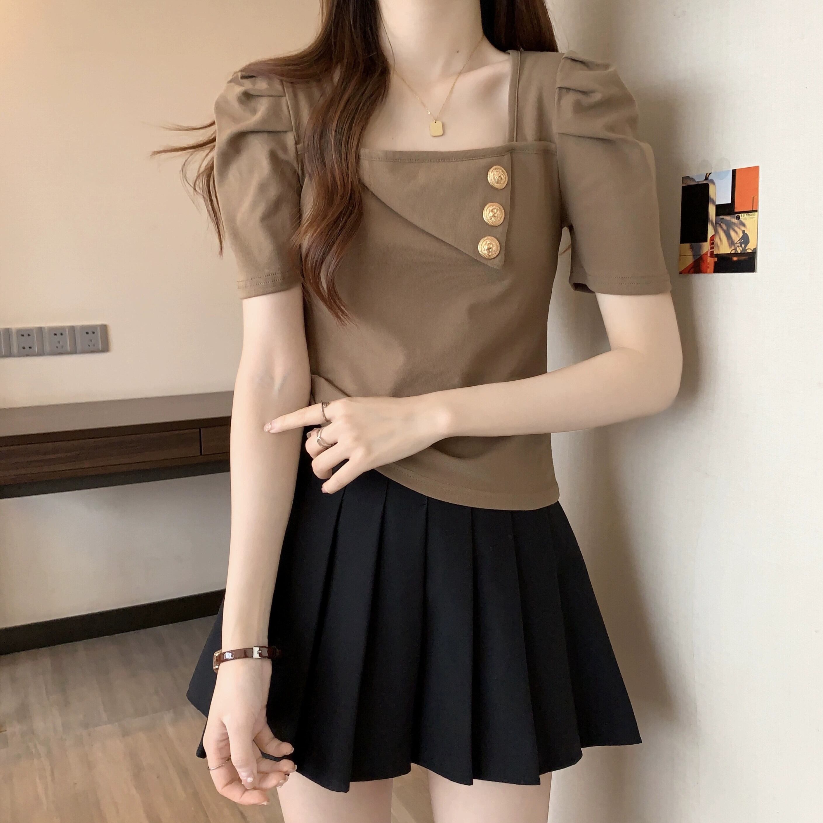 プラスサイズの女性の 2023 ファットシスター夏服シックな香港スタイルのレトロなスクエアネックトップ半袖 Tシャツ ショート ハーフスリーブ 大きめサイズ サマー 夏物 スクウェア 8884190139760146