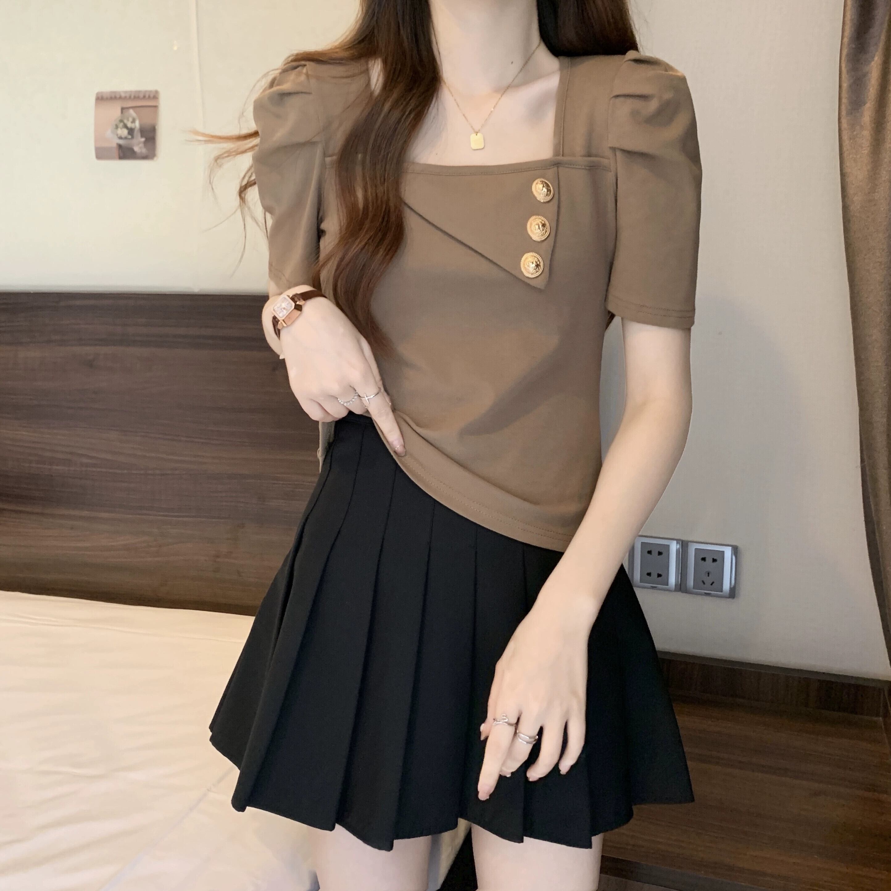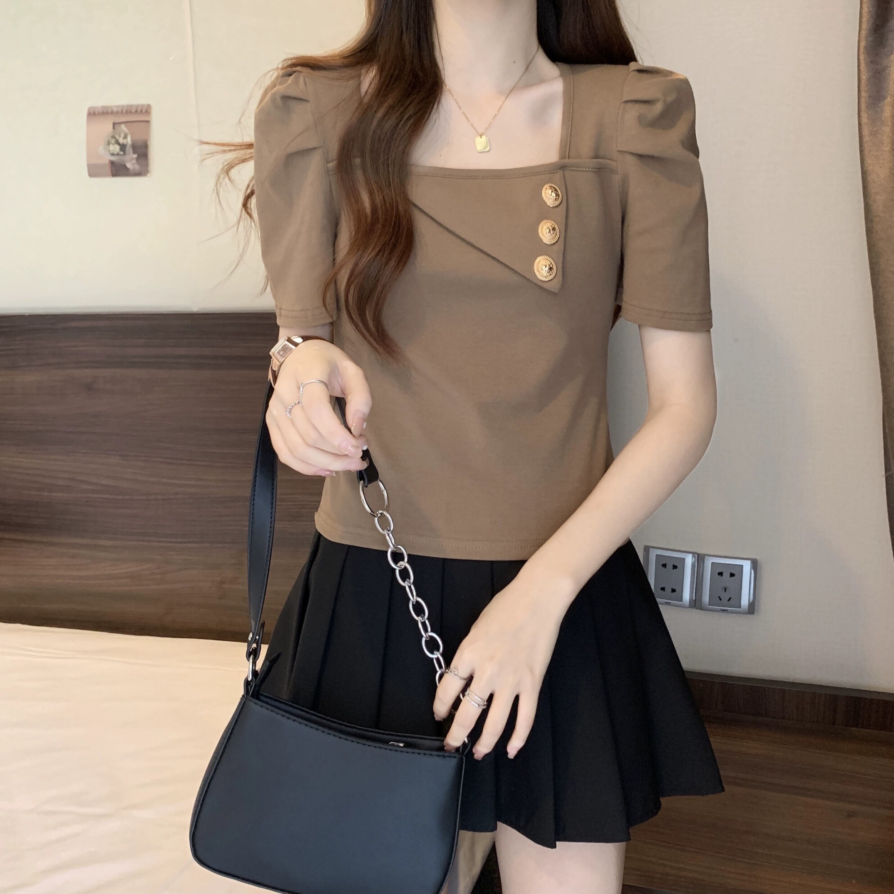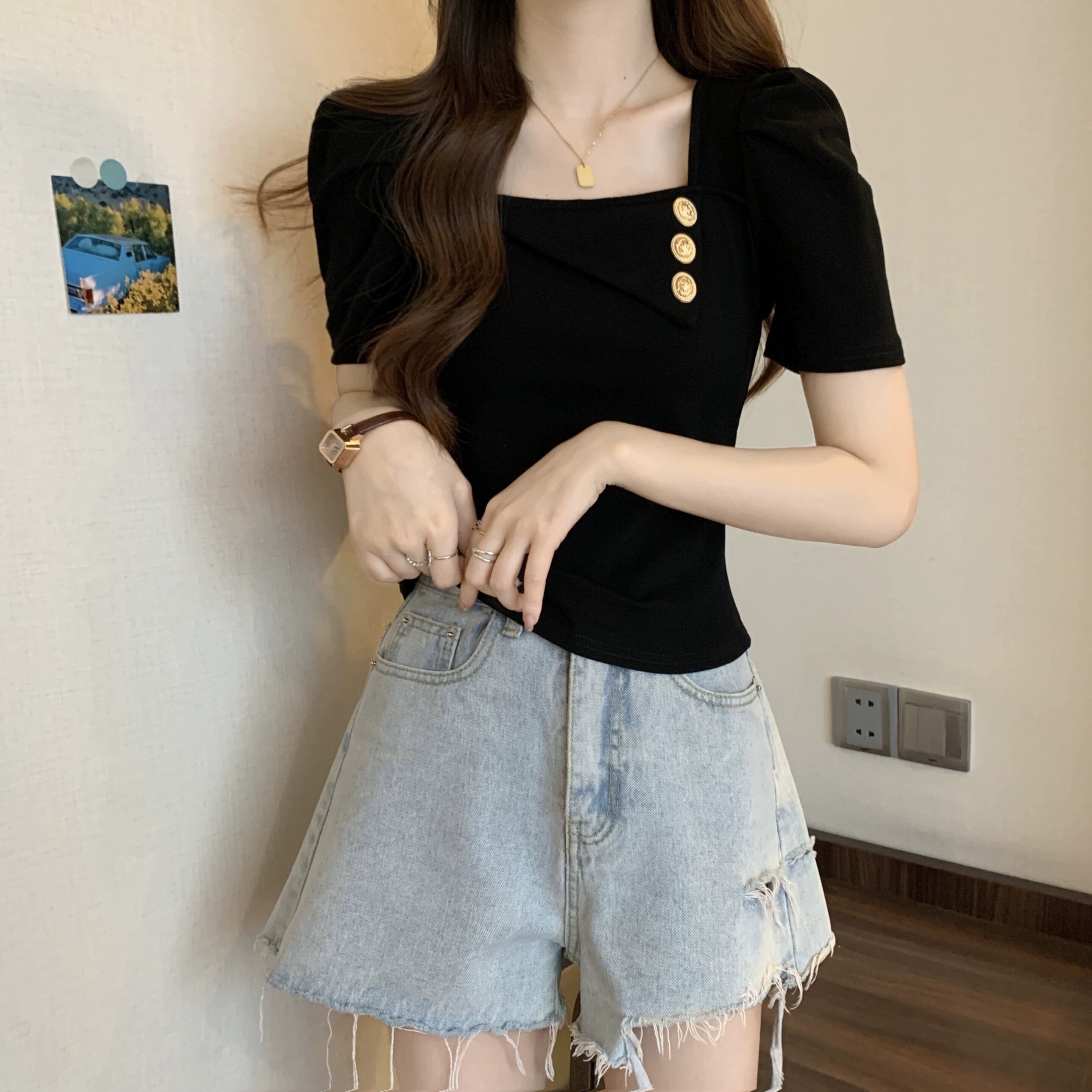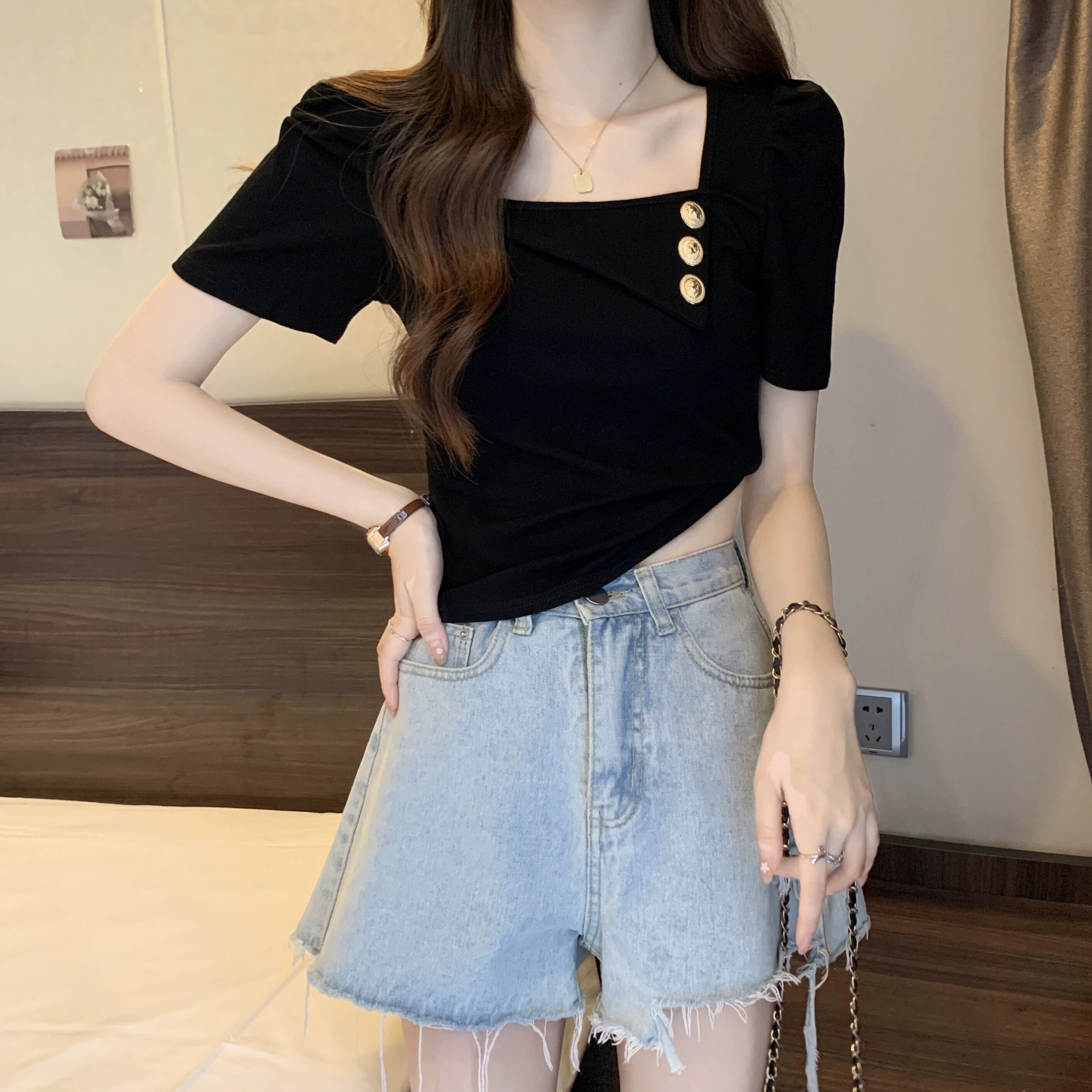 プラスサイズの女性の 2023 ファットシスター夏服シックな香港スタイルのレトロなスクエアネックトップ半袖 Tシャツ ショート ハーフスリーブ 大きめサイズ サマー 夏物 スクウェア 8884190139760146