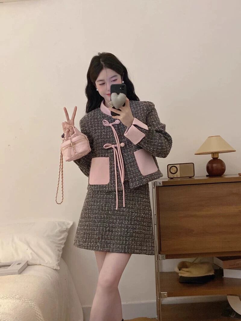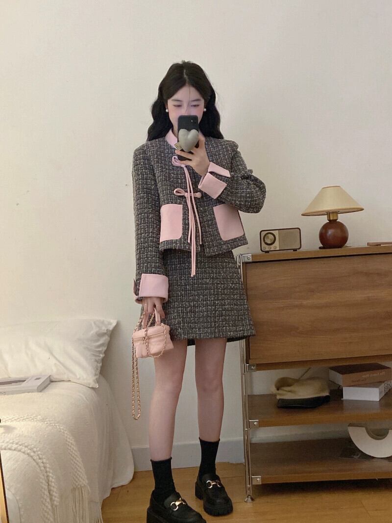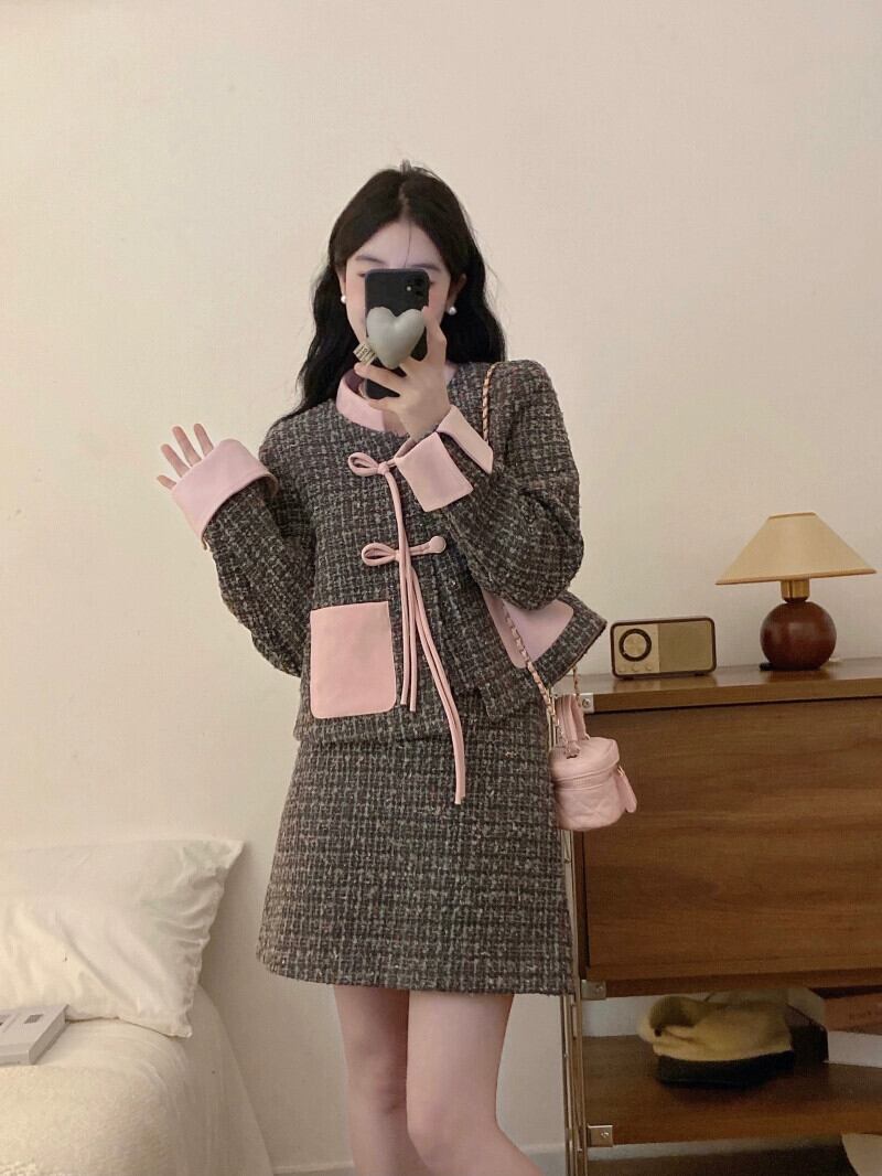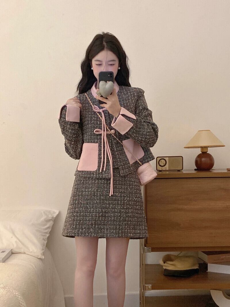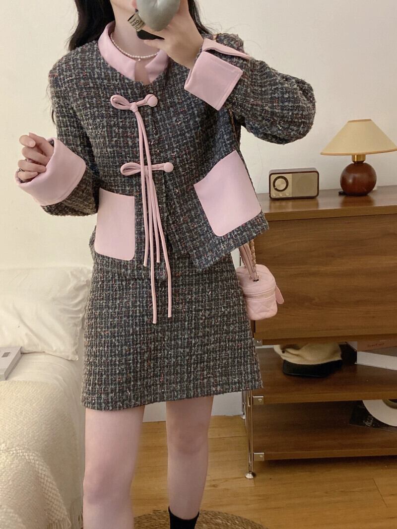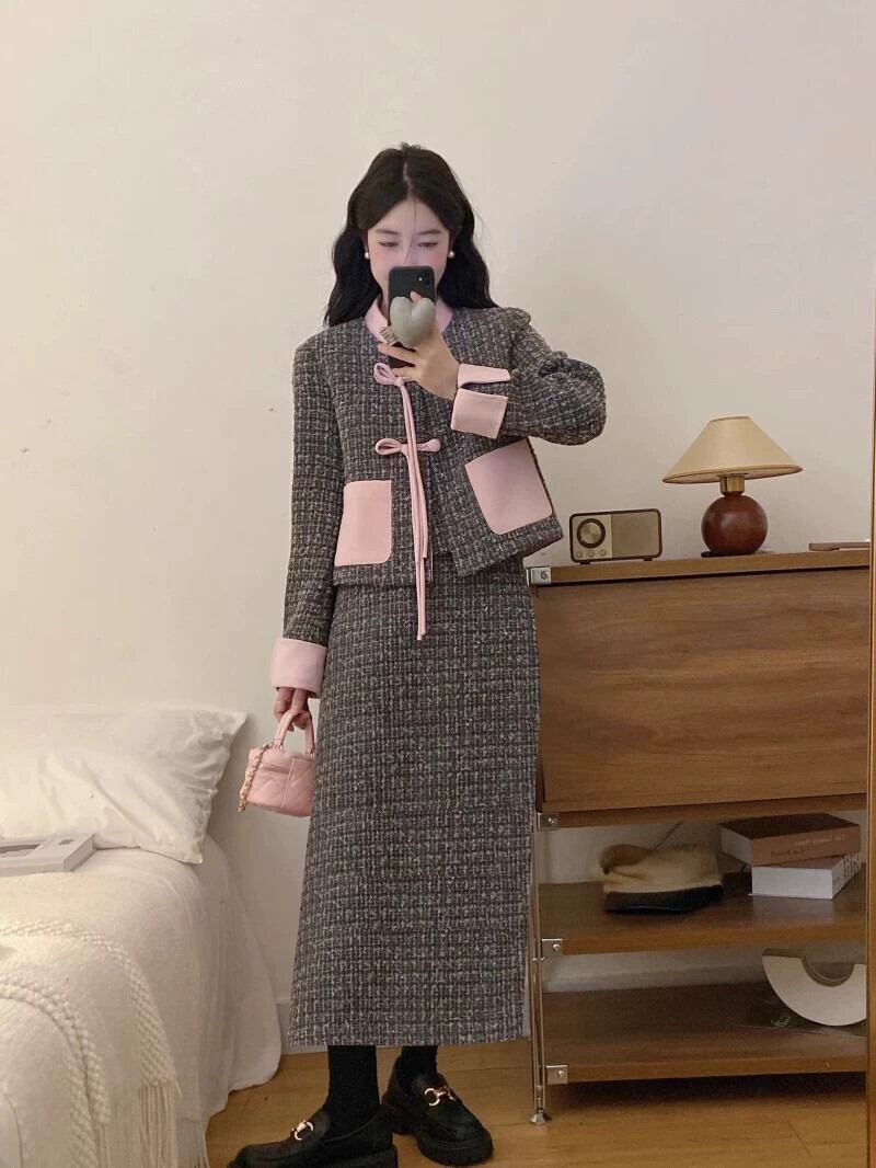 プラスサイズのファッションスーツの女性の新しい秋のレトロなディスクバックル小さな香りのスタイル長袖ジャケット気質スカートツーピースセット ロング 大きめサイズ オータム 秋物 8884130785646350