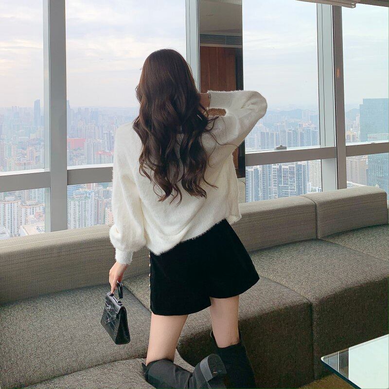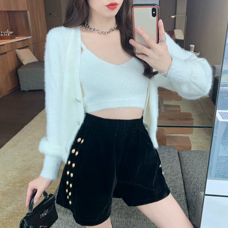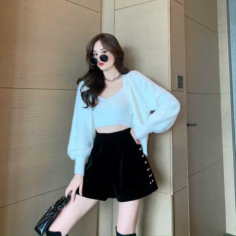プラスサイズ 2023 秋の新しいファット MM ソリッドカラー ハイウエスト スリム カジュアル ワイドレッグ A ライン ベルベット ショート パンツ ブーツとパンツを外で着用します ハイウェスト 靴 シューズ 大きめサイズ オータム 秋物 ショーツ ブルマー Aライン ワイドパンツ 8884125373302724