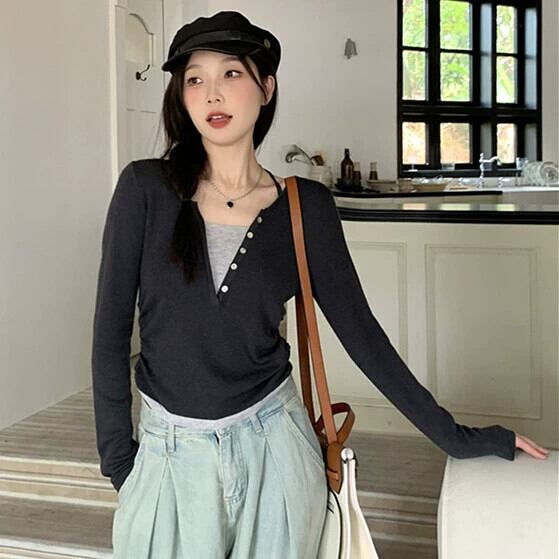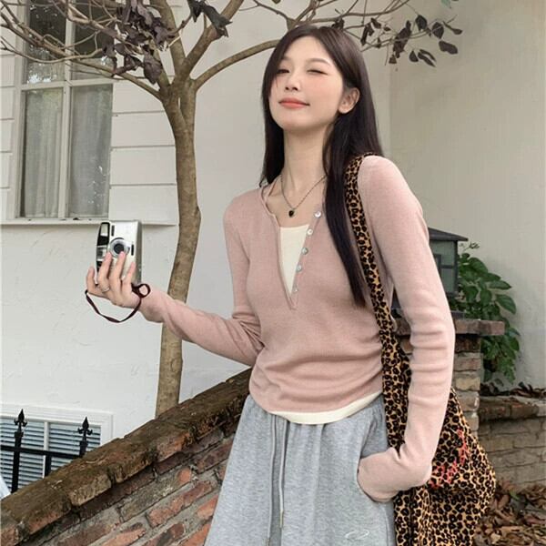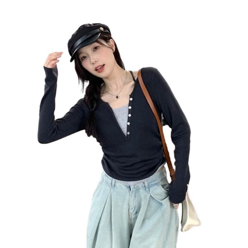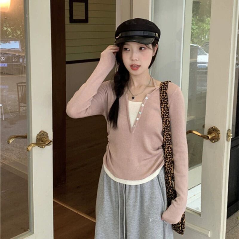 プラスサイズの婦人服 2023 トレンディな秋の新ファットシスター V ネックデザイン偽ツーピーストップス多目的痩身セーター 大きめサイズ オータム 秋物 Vネック 8884168015964913