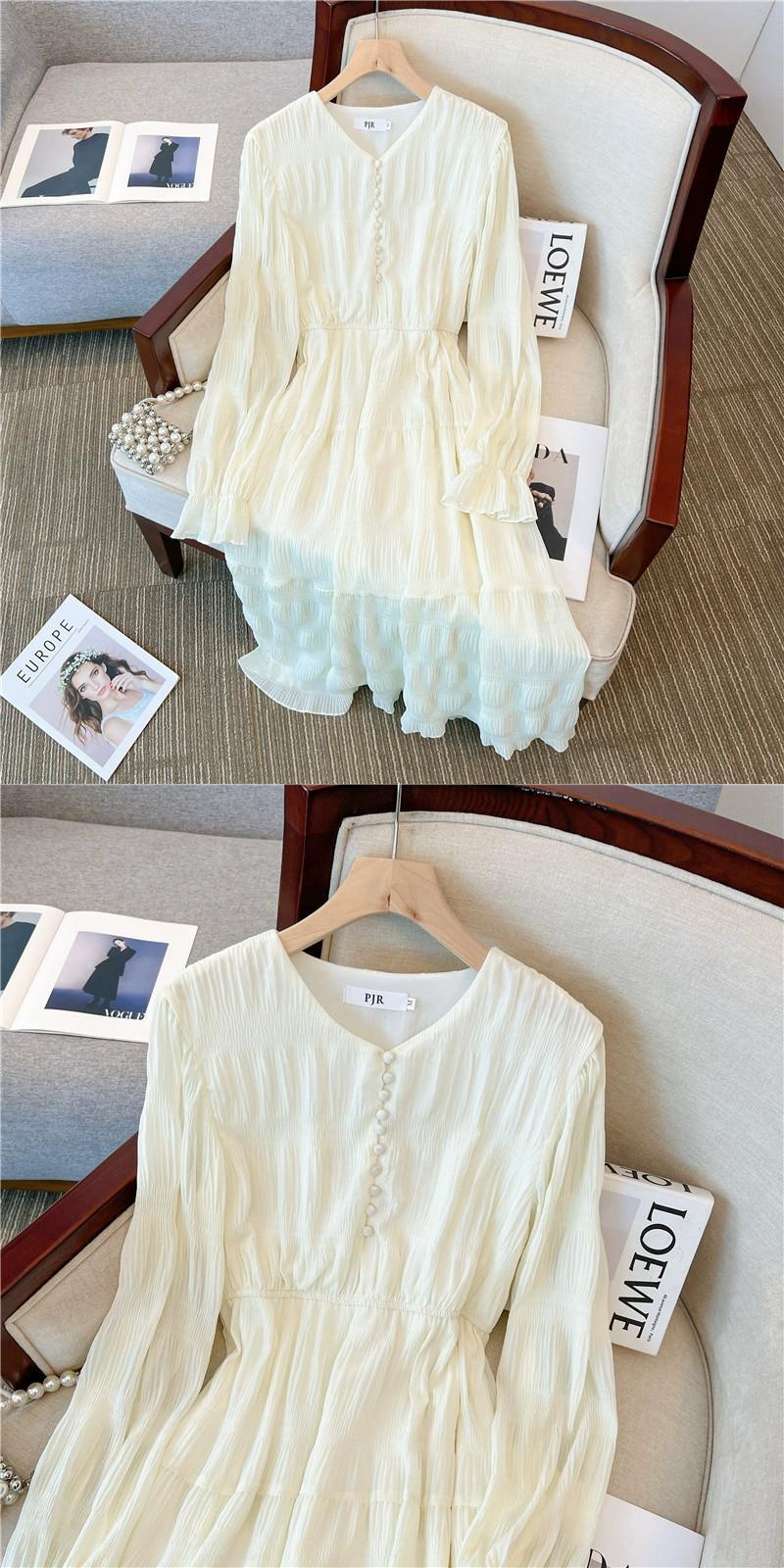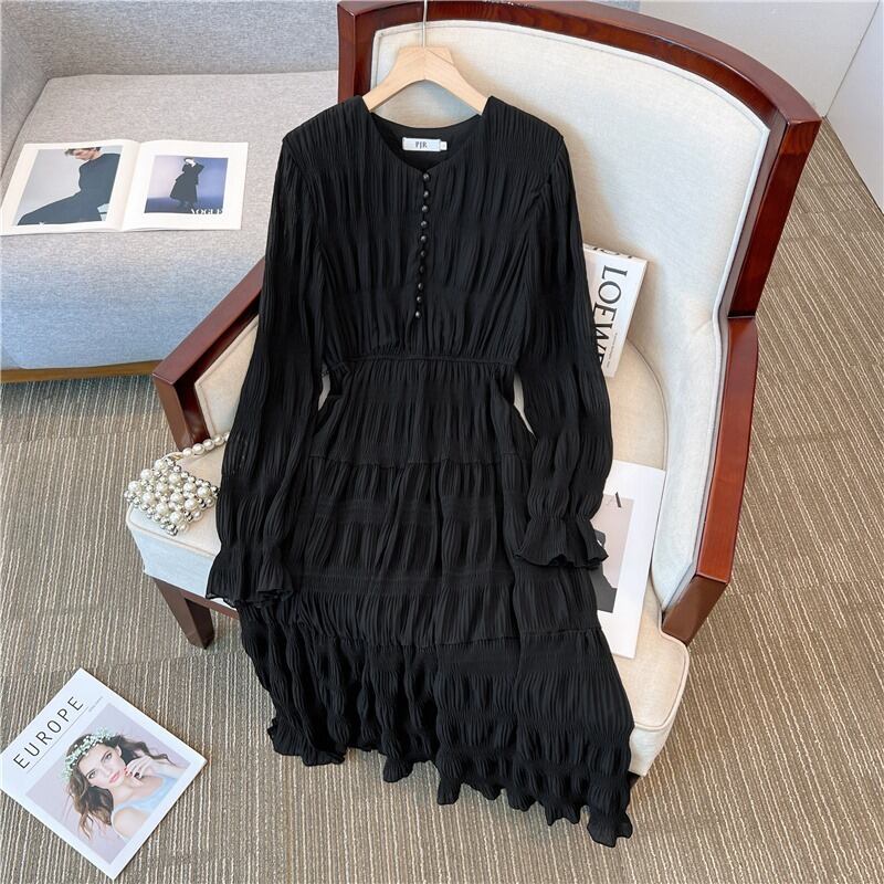 大きいサイズの婦人服 2023 トレンドの秋の新作太い V ネックのフレンチドレス、肉をカバーし、スリムに見えるデザインのミモレ丈スカート 大きめサイズ オータム 秋物 Vネック 8884129373422586