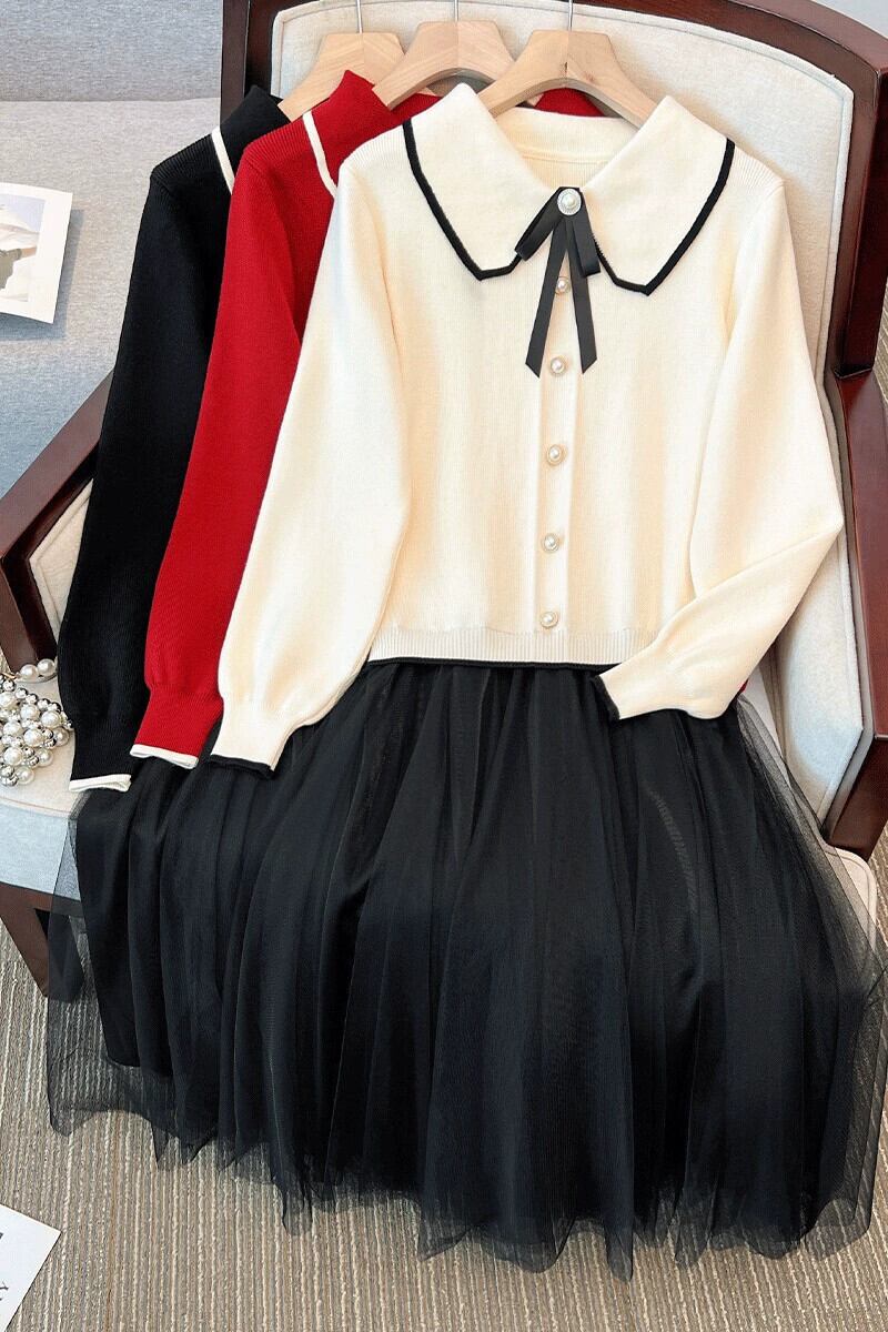 プラスサイズの女性の脂肪 mm 秋の新 2023 年齢軽減人形襟 a ラインスカート偽ツーピーススプライシングメッシュドレス 大きめサイズ オータム 秋物 Aライン 8884198748622295