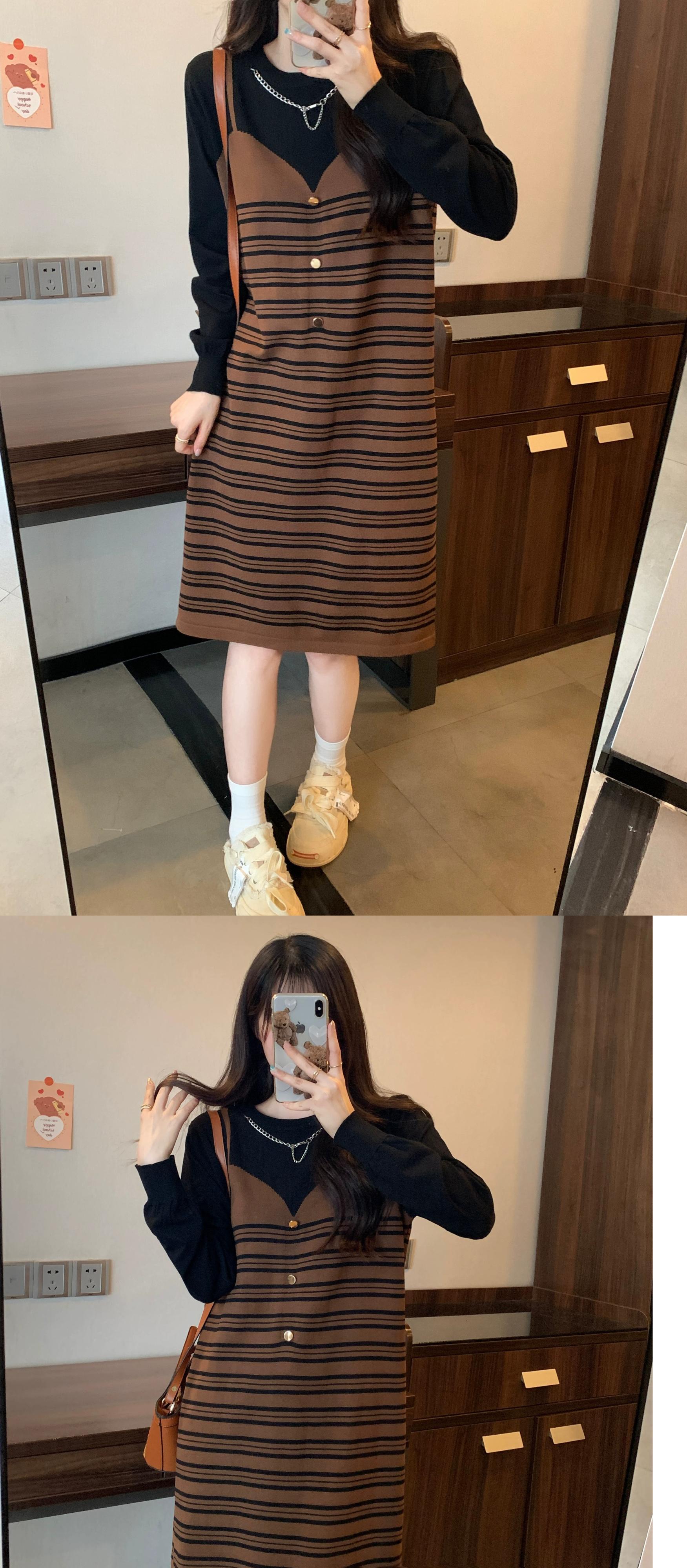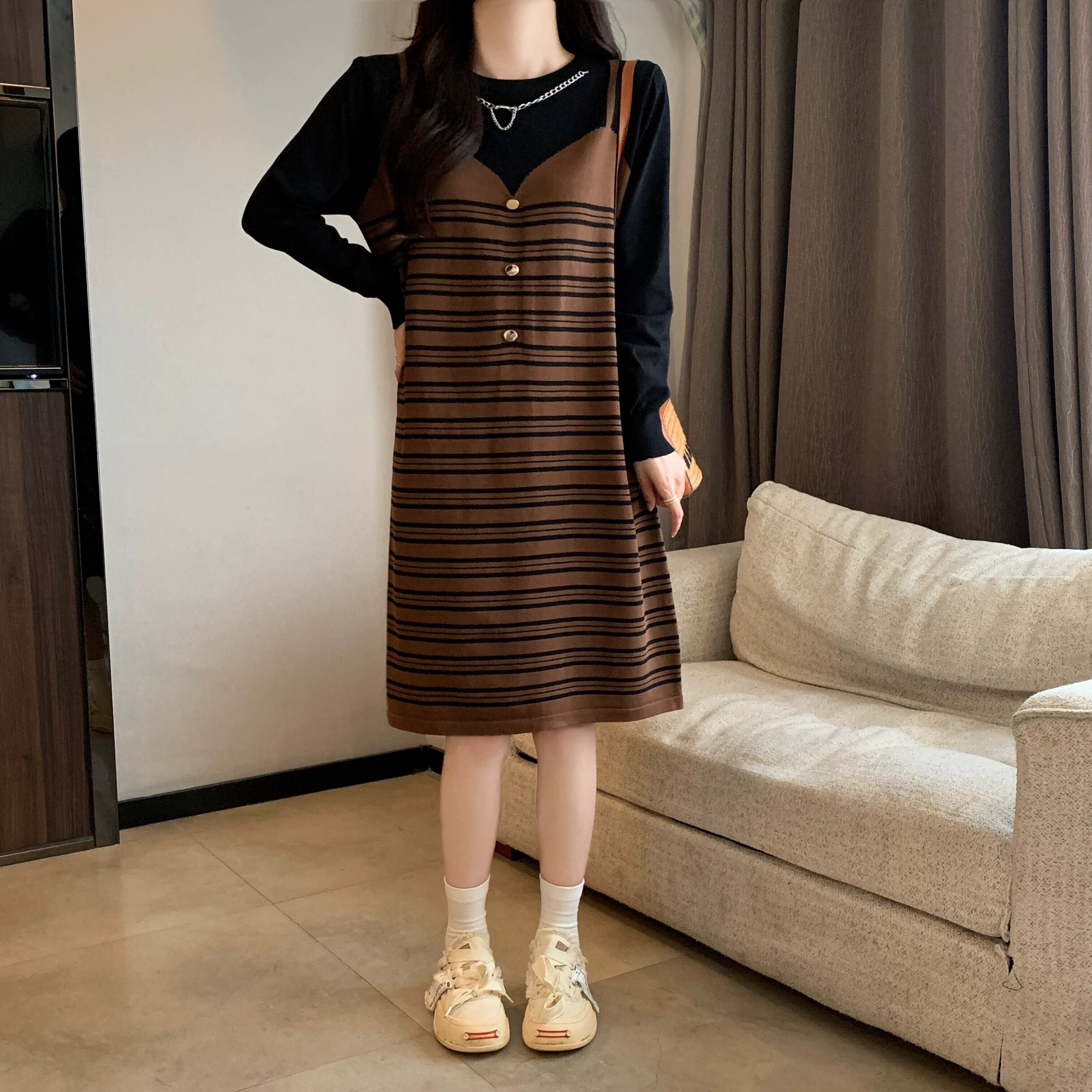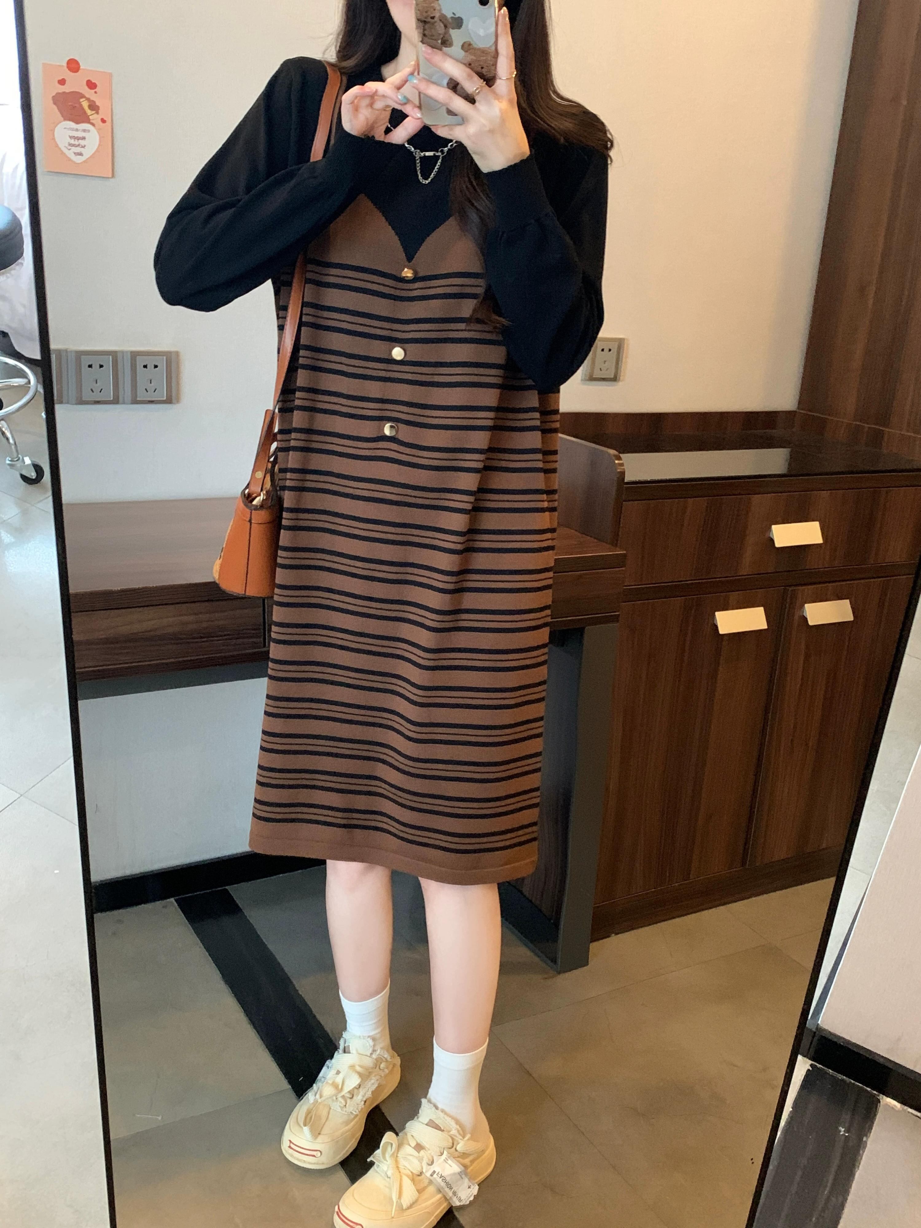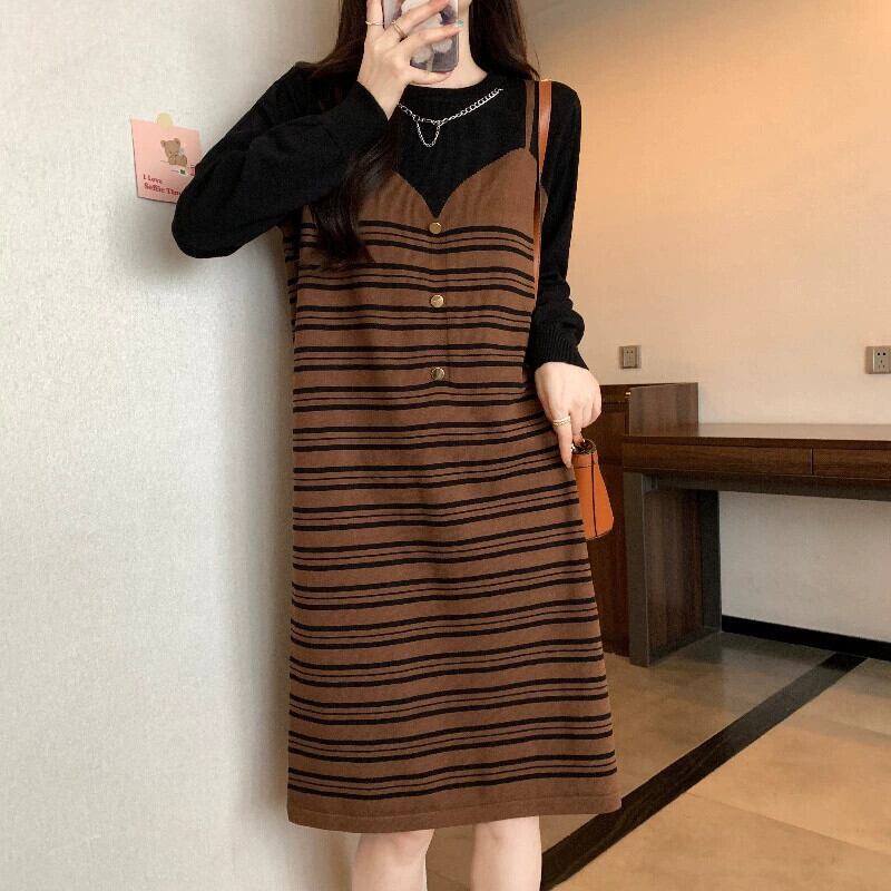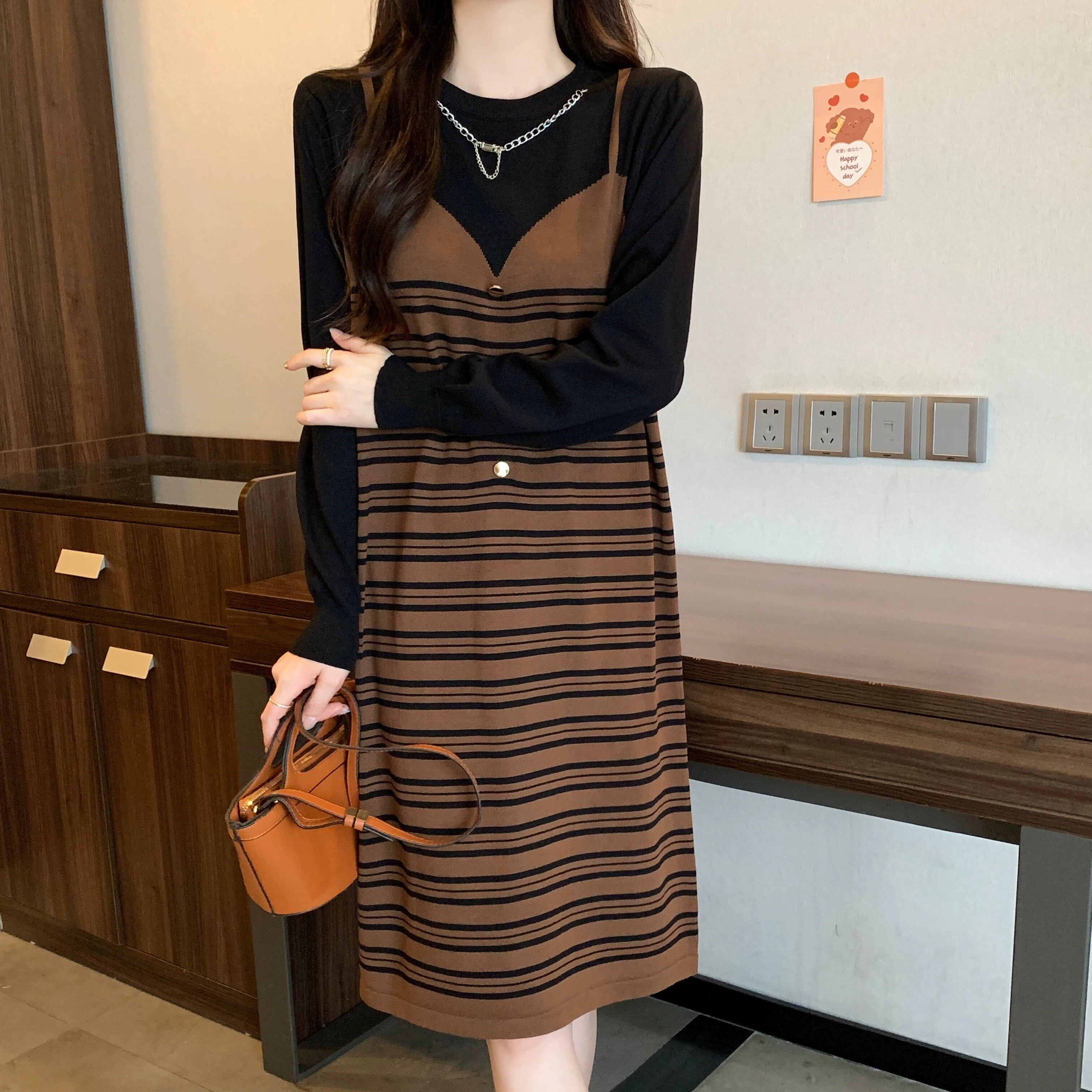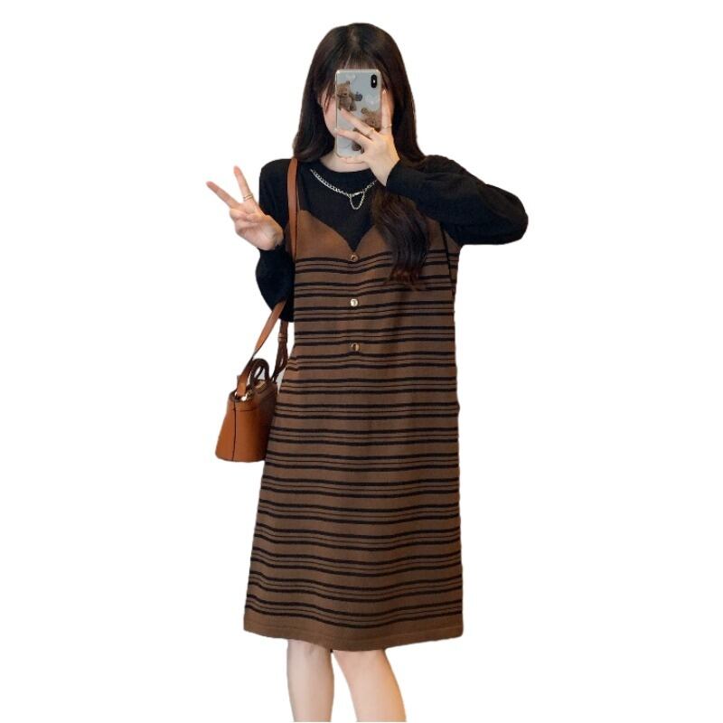 プラスサイズの女性の 2023 秋服ファットシスター多用途偽ツーピース長袖 A ラインスカート股をカバーニッチストライプドレス ロング 大きめサイズ オータム 秋物 Aライン 8884199818427769
