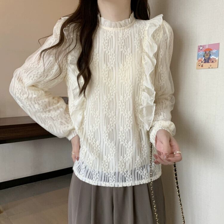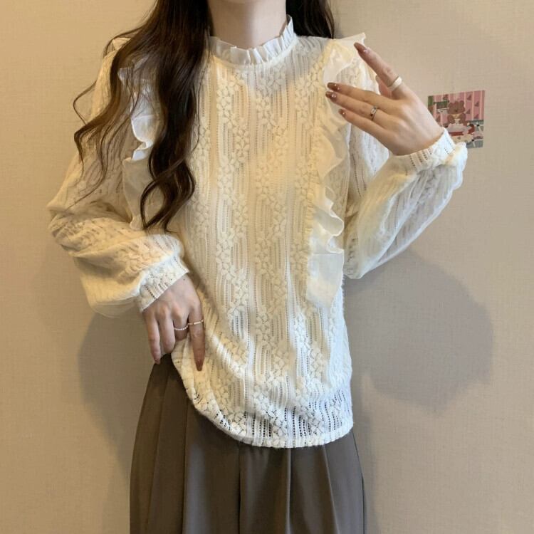 プラスサイズの女性の秋の服太さmm、スリムで優しいスタイル、かぎ針編みレース、ハーフタートルネック、イヤリング付き長袖ボトムシャツ ロング 大きめサイズ オータム 秋物 指輪 888411676075723