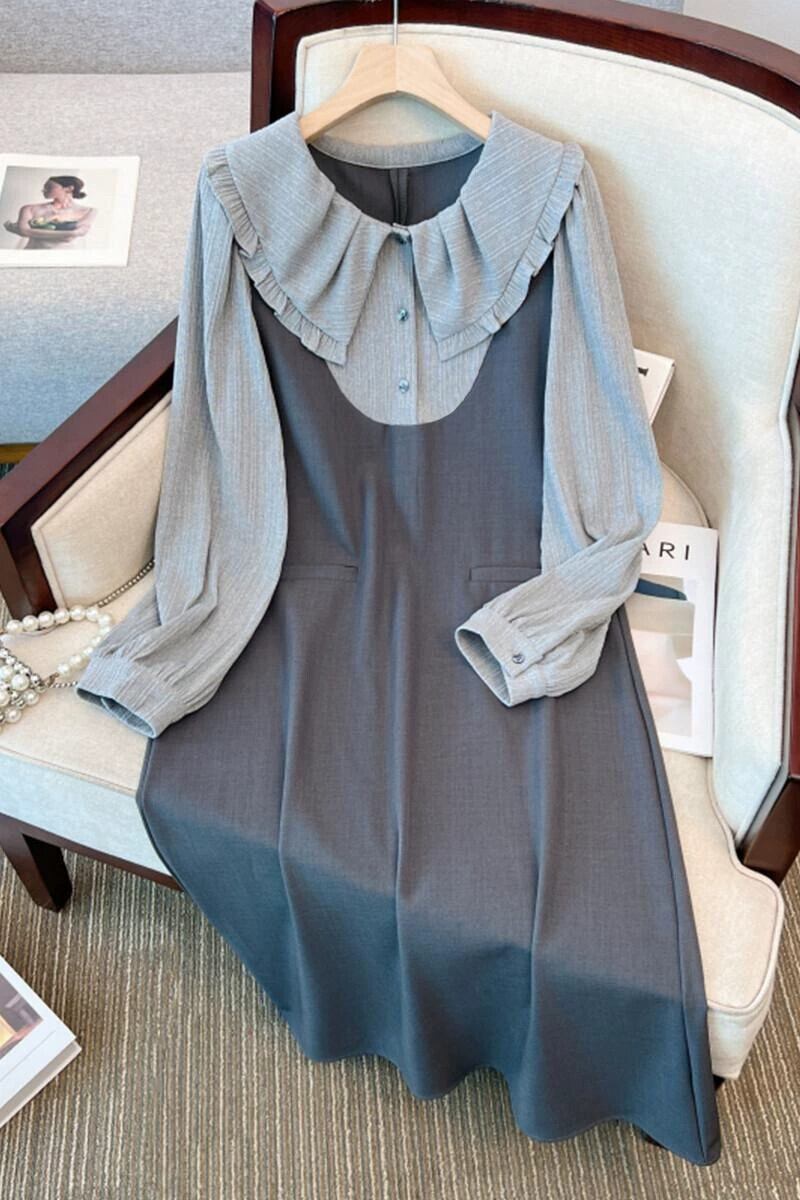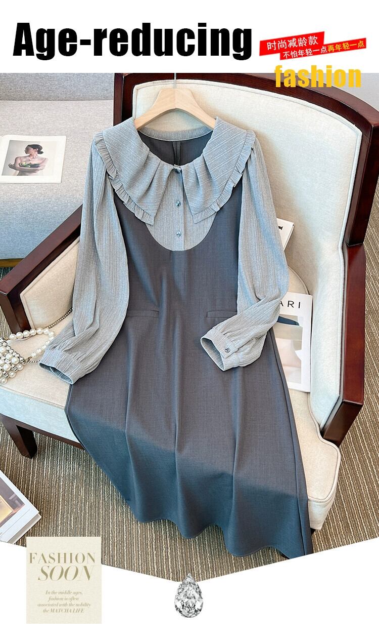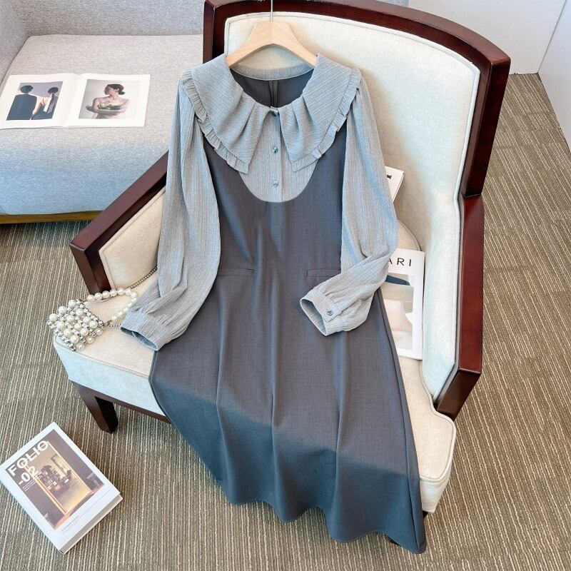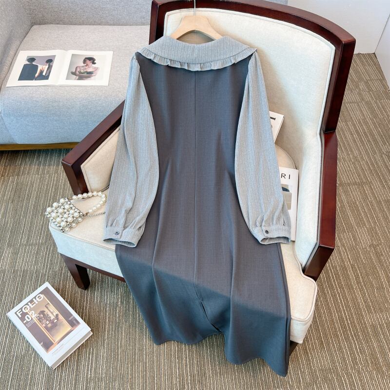プラスサイズの女性の秋と冬の新しい脂肪mmフレンチドールカラー長袖ファッション対照的な色のお腹を覆うドレス、痩身気質 ロング 大きめサイズ オータム 秋物 ウィンター 冬物 888412304609576