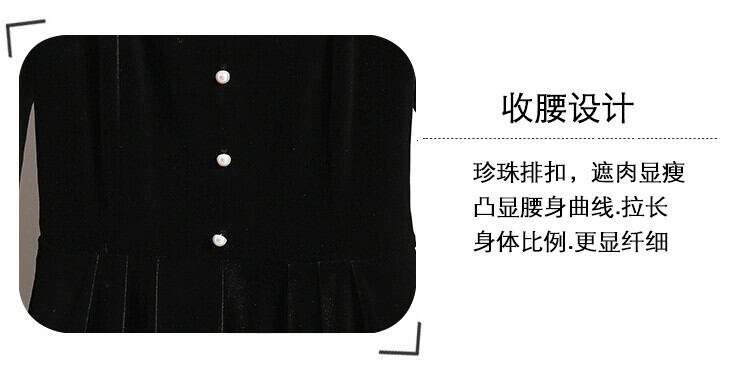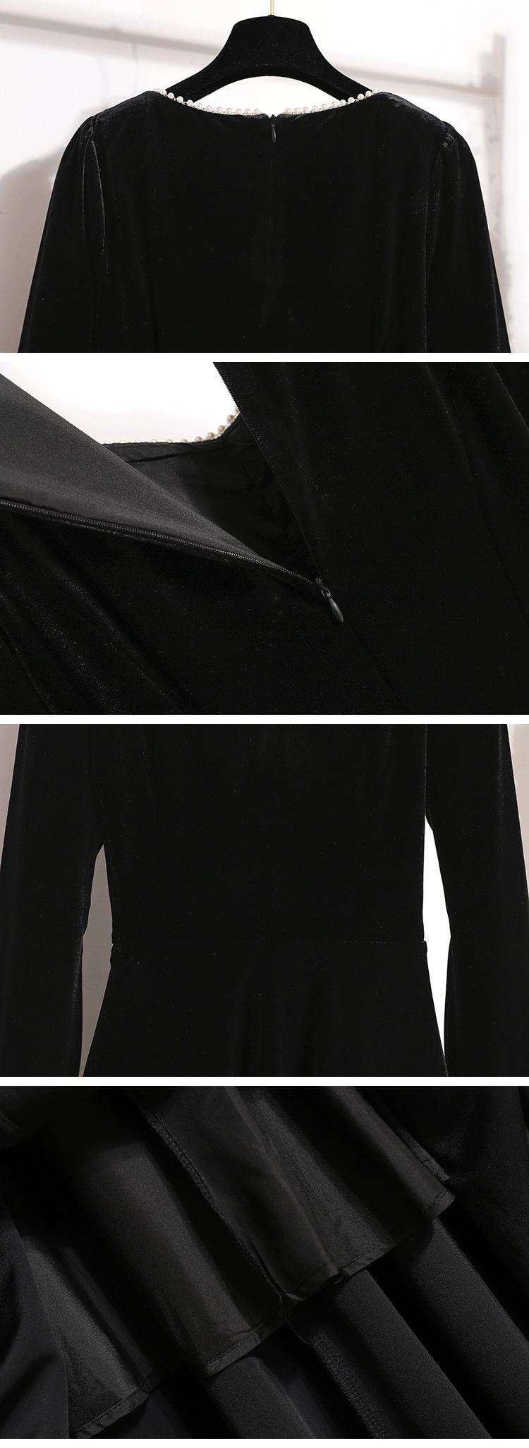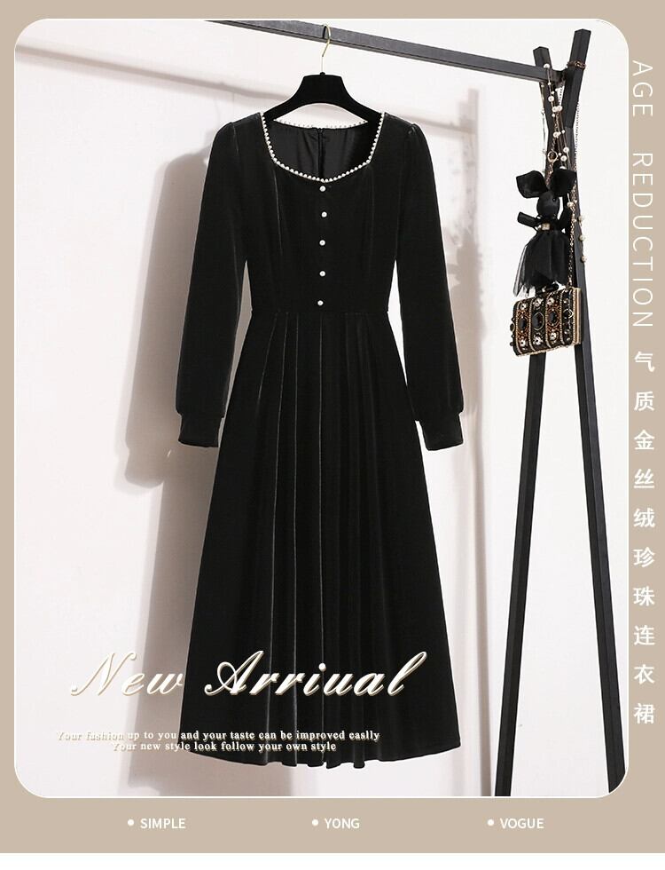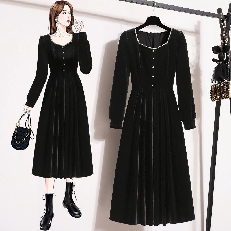 プラスサイズ 2023 新しい秋の脂肪姉妹女性のスクエアカラーシックなウエスト痩身気質黒長袖ドレス ロング ブラック 大きめサイズ オータム 秋物 スクウェア 8884149975711069