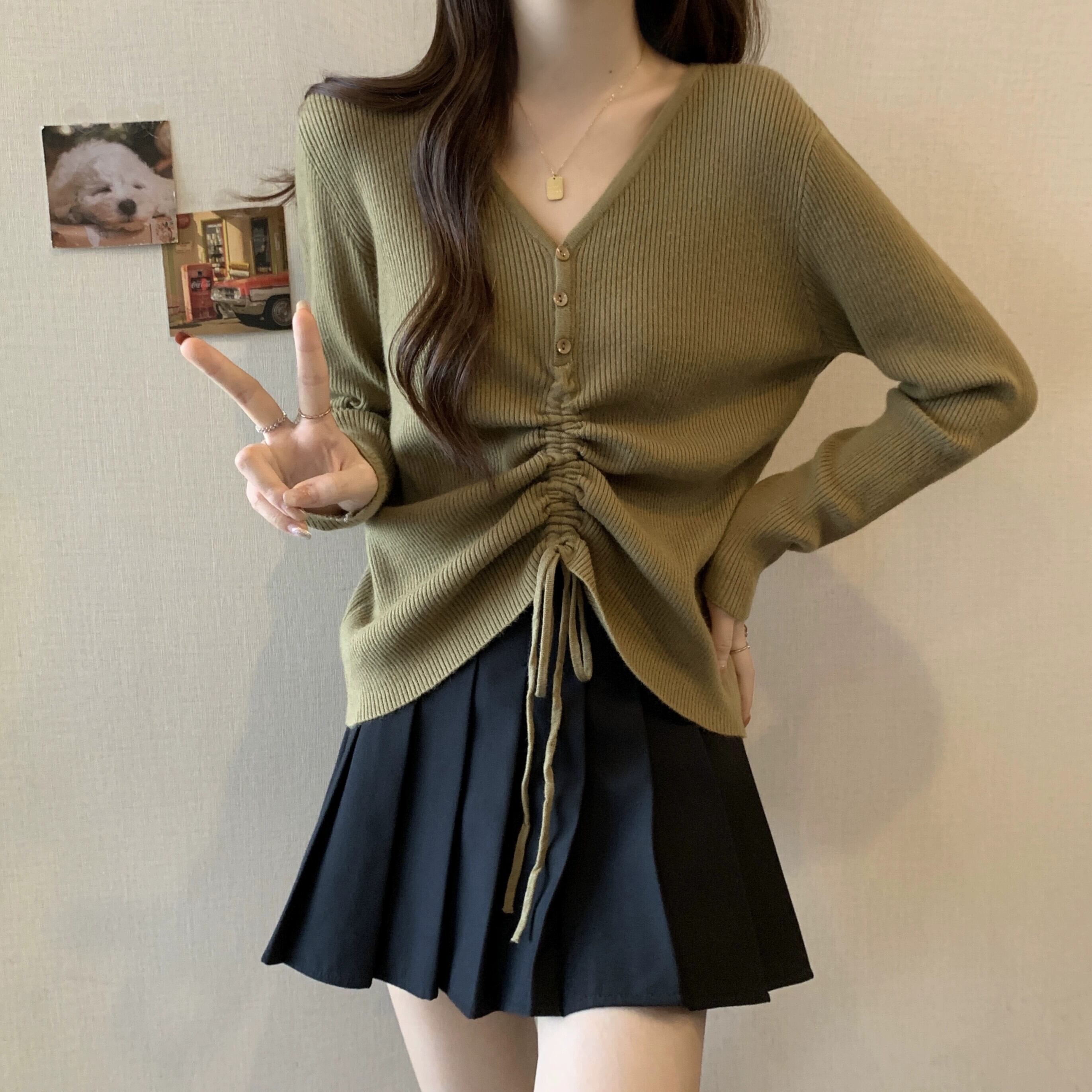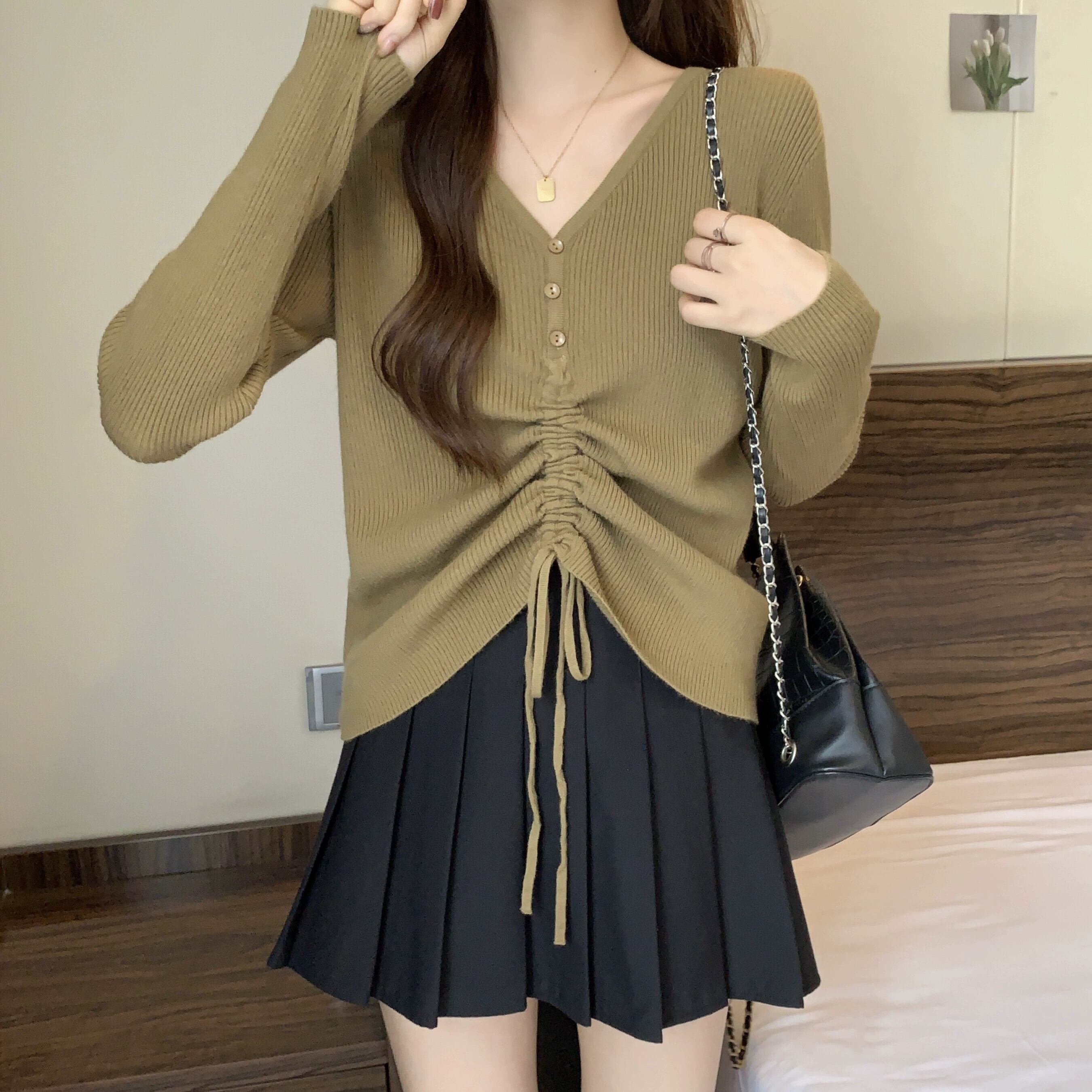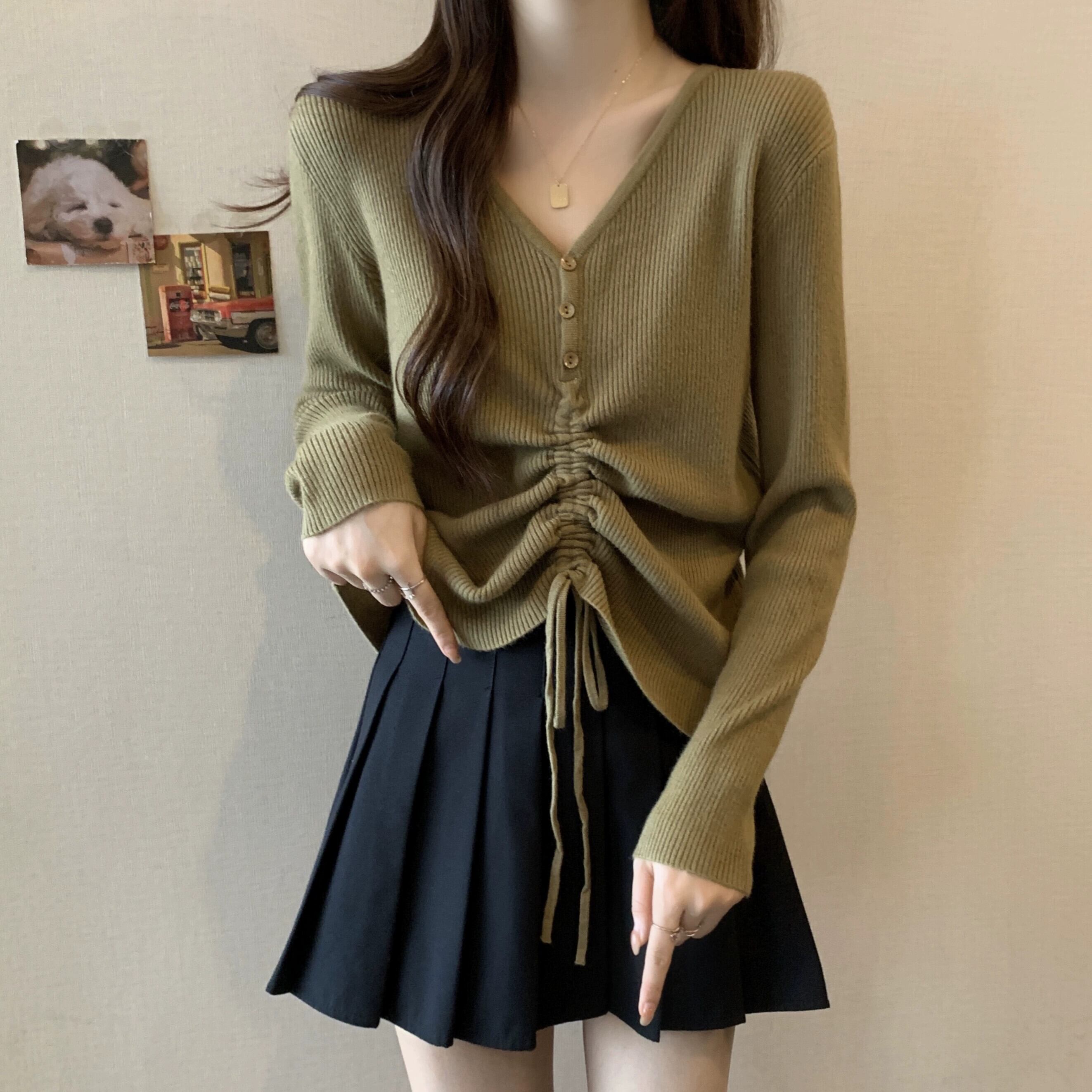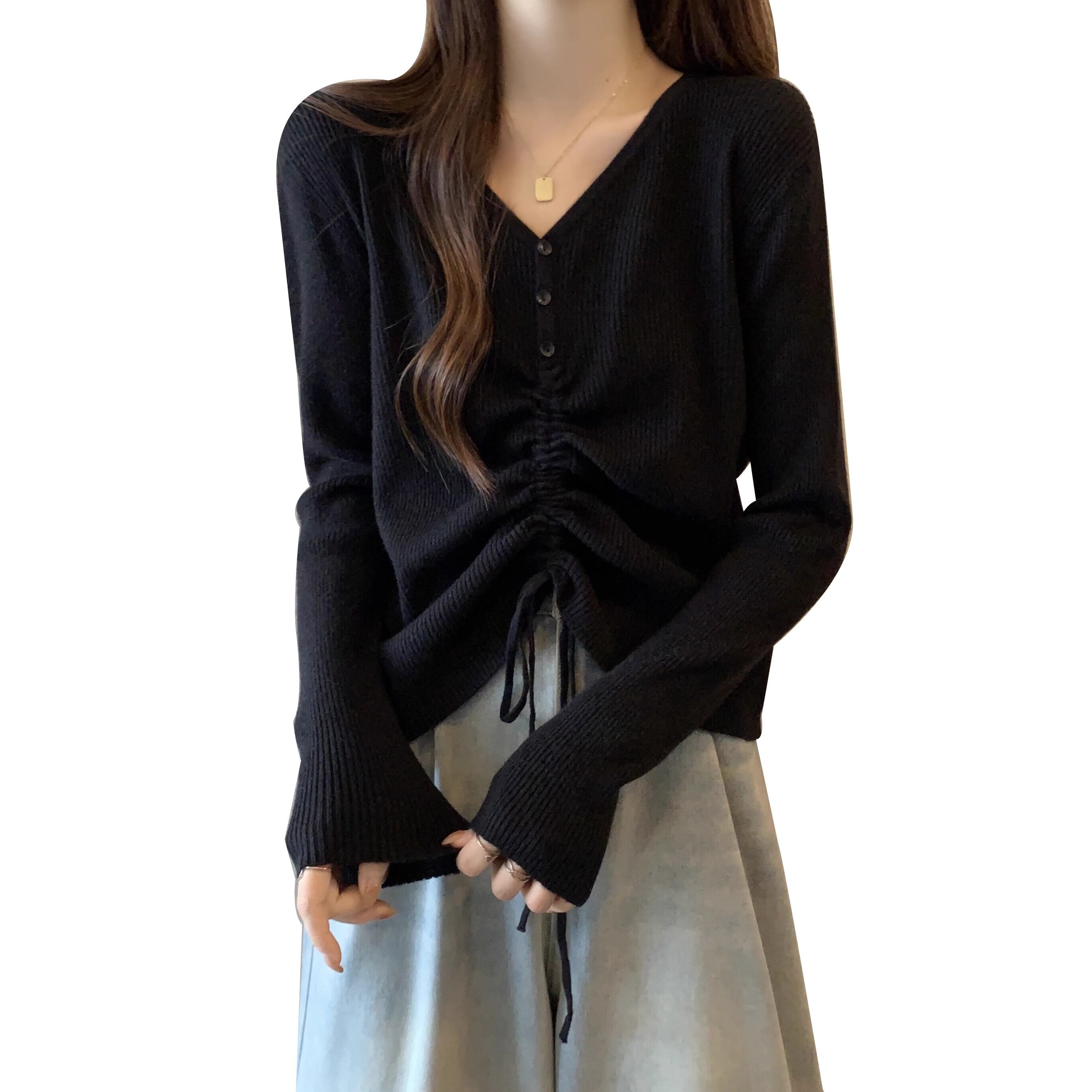 ニットセーター女性プラスサイズファットMM秋の新デザインファッショナブルなVネック長袖無地巾着スリムセータートレンド ロング 大きめサイズ オータム 秋物 ソリッドカラー 88841955762687