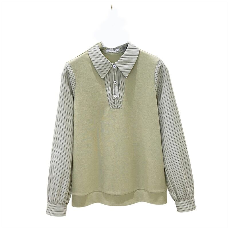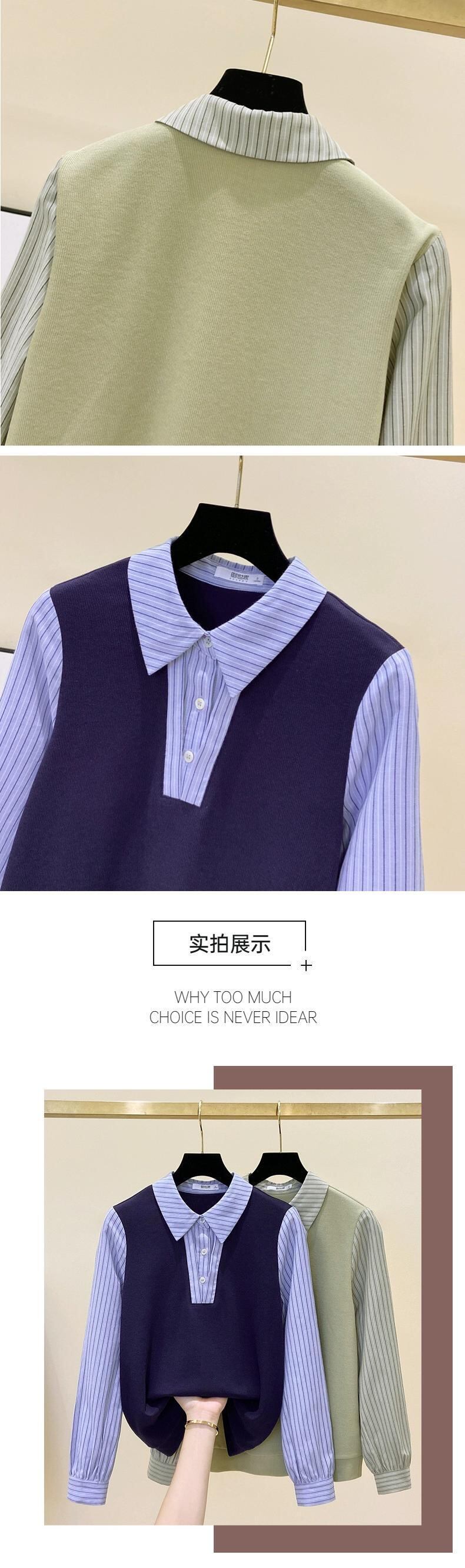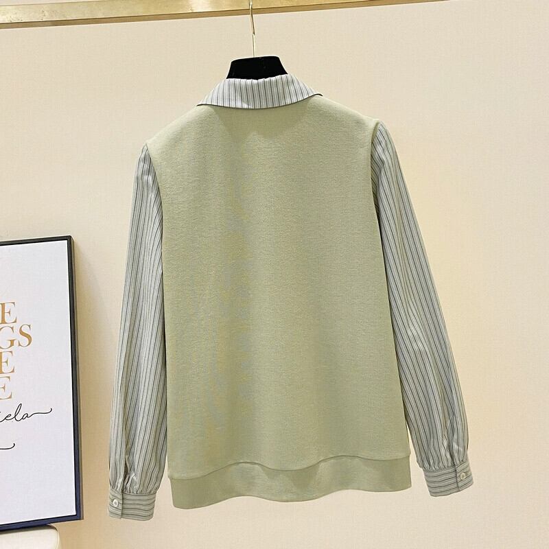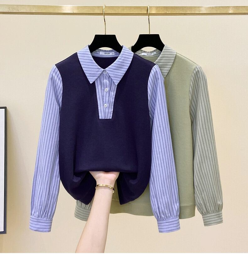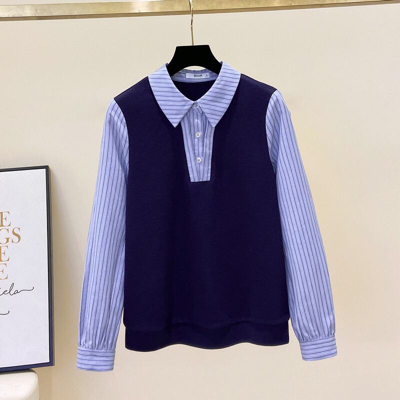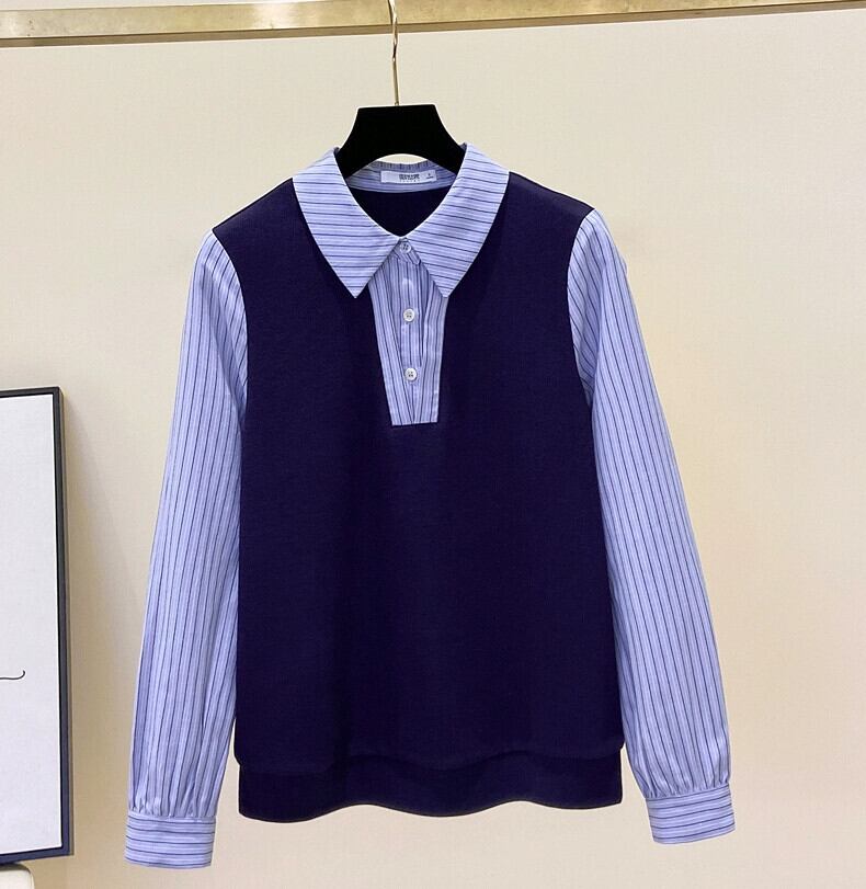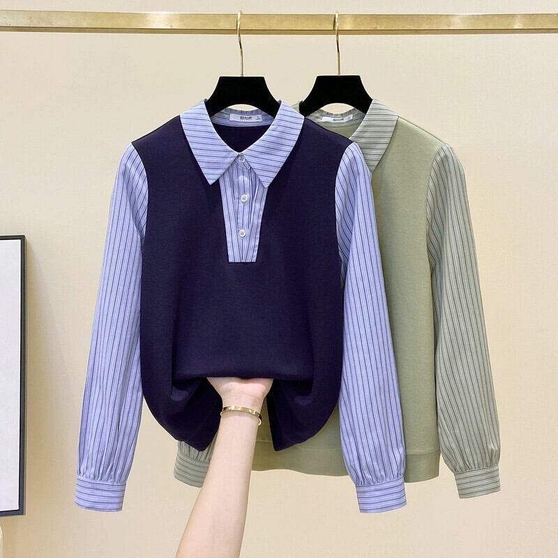 プラスサイズの女性の秋冬の新スタイル 2023 フレンチフェイクツーピースコントラストストライプ長袖シャツスプライスニットトップ ロング 大きめサイズ オータム 秋物 ウィンター 冬物 8884130283836917