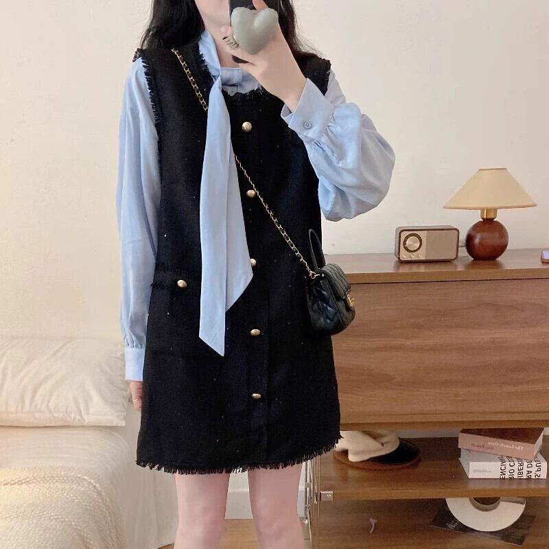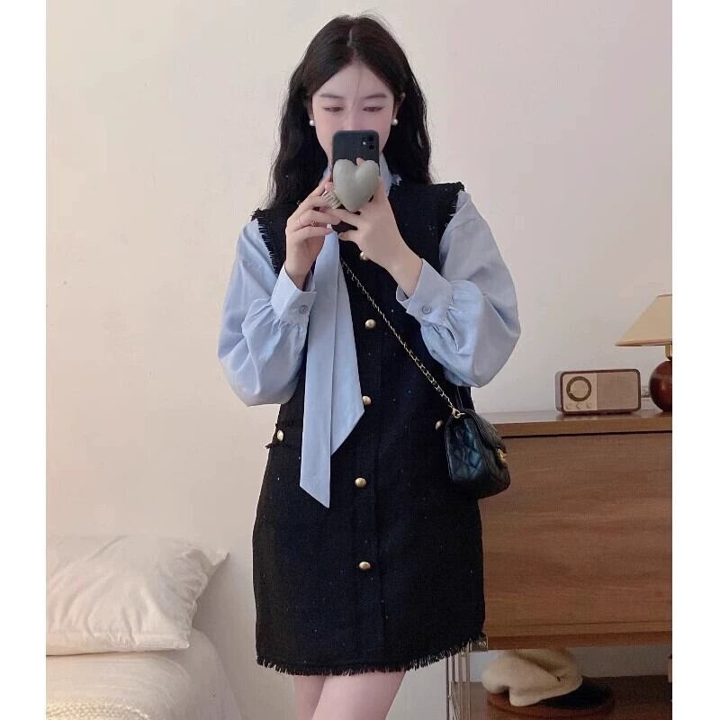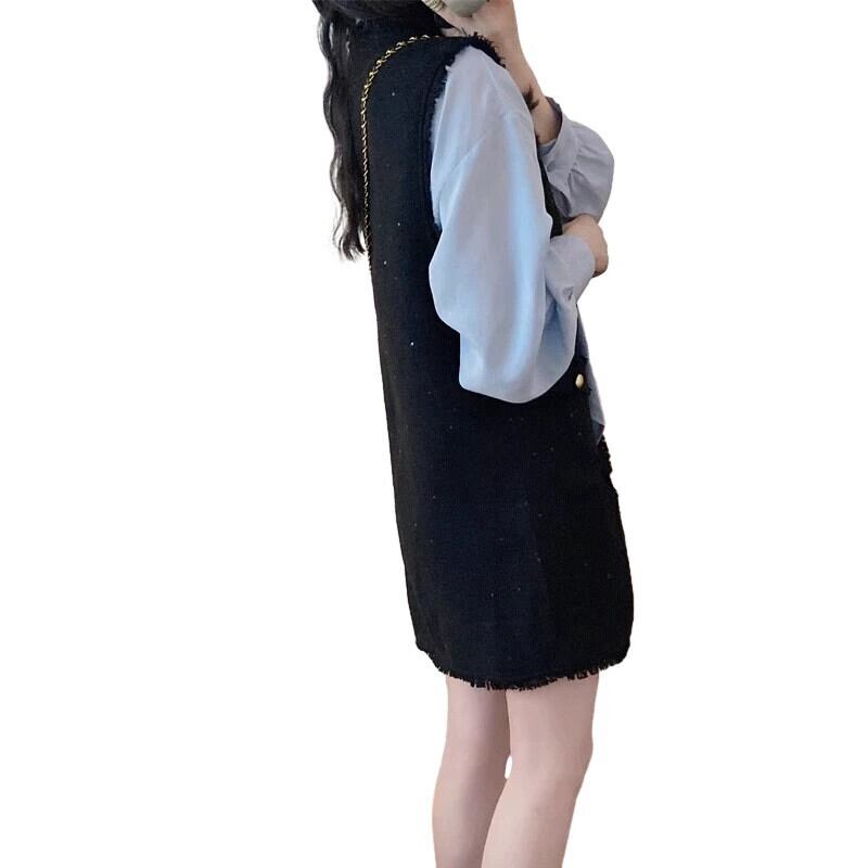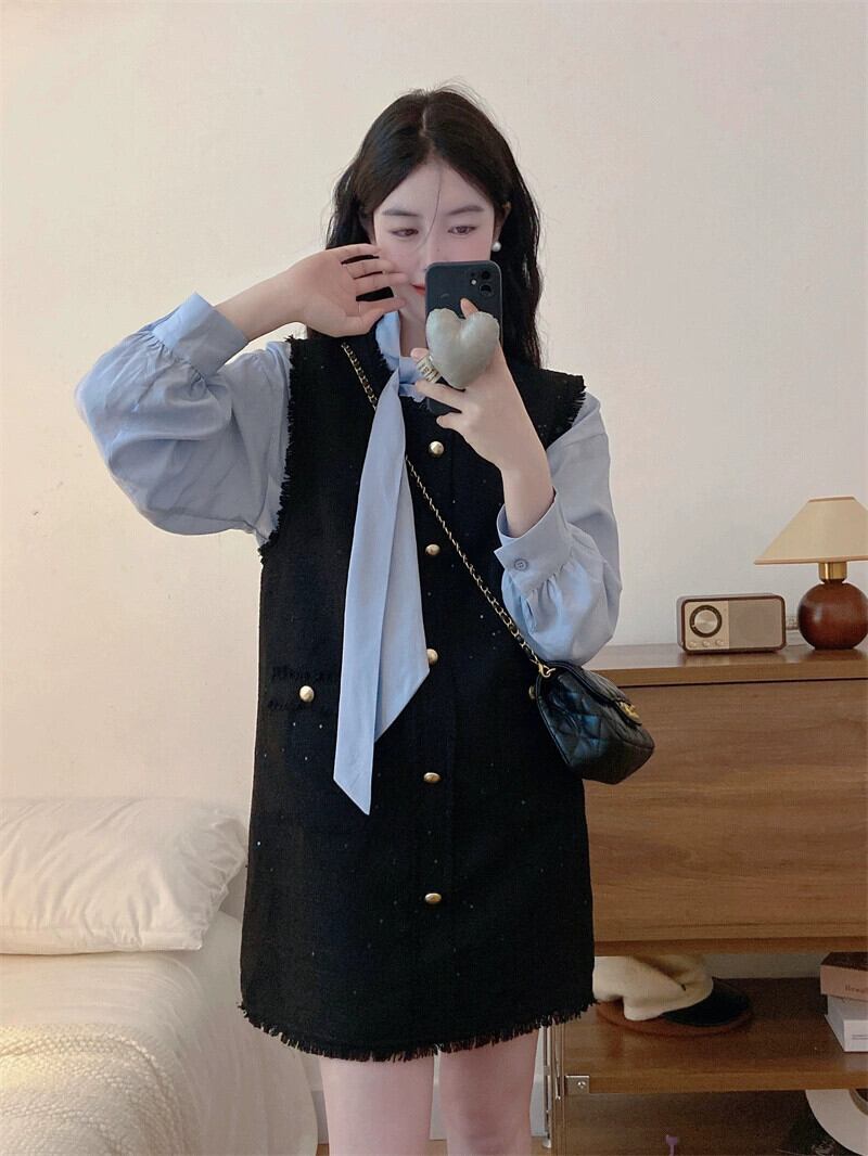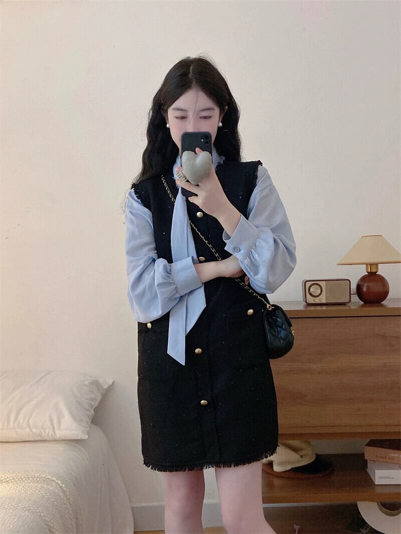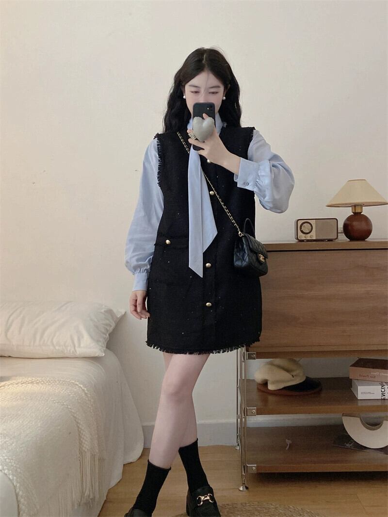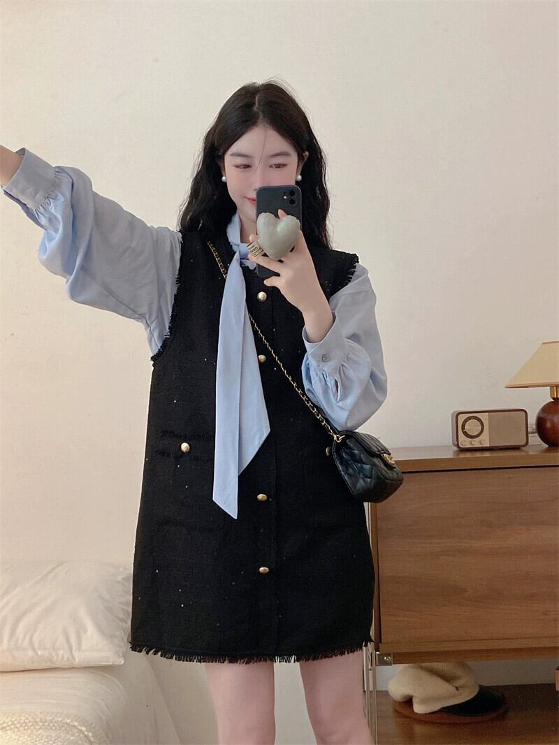 大きいサイズのレースアップ無地シャツ + スクエアカラー小さな香りのベストドレスツーピーススーツ女性の秋の痩身 大きめサイズ オータム 秋物 ソリッドカラー スクウェア 8884119440862966