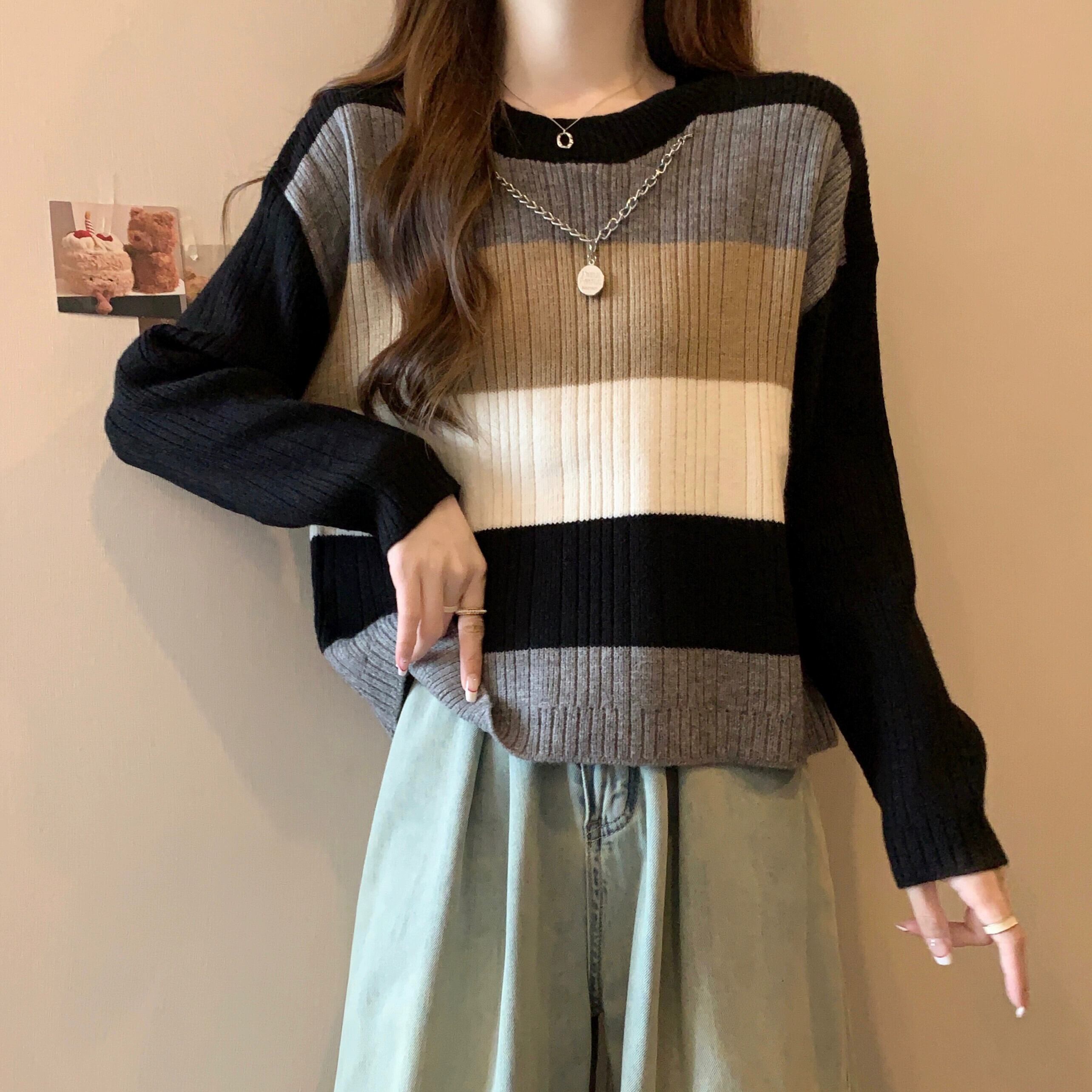 プラスサイズの女性の 2023 秋と冬の新しいストライプセータートップス脂肪 mm 、痩身、年齢削減、西洋スタイルのボトリングインナーセーター 大きめサイズ オータム 秋物 ウィンター 冬物 8884182941563292