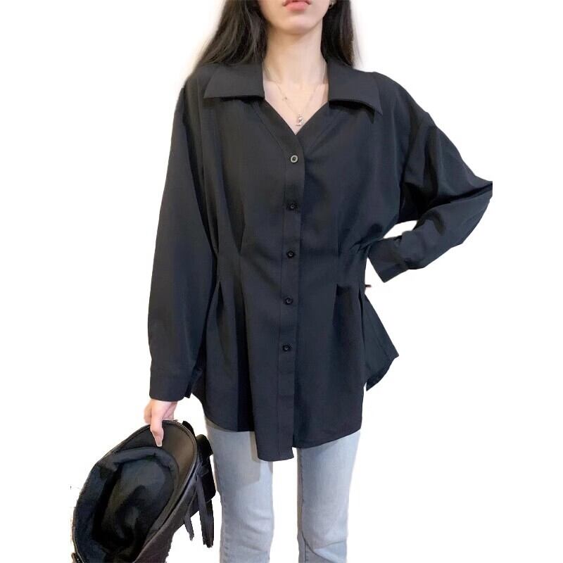 大きいサイズの秋のソリッドカラーデザインの長袖シャツトップス、ファット、シックなウエストライン、汎用性の高いニッチシャツ ロング 大きめサイズ オータム 秋物 8884143281797753