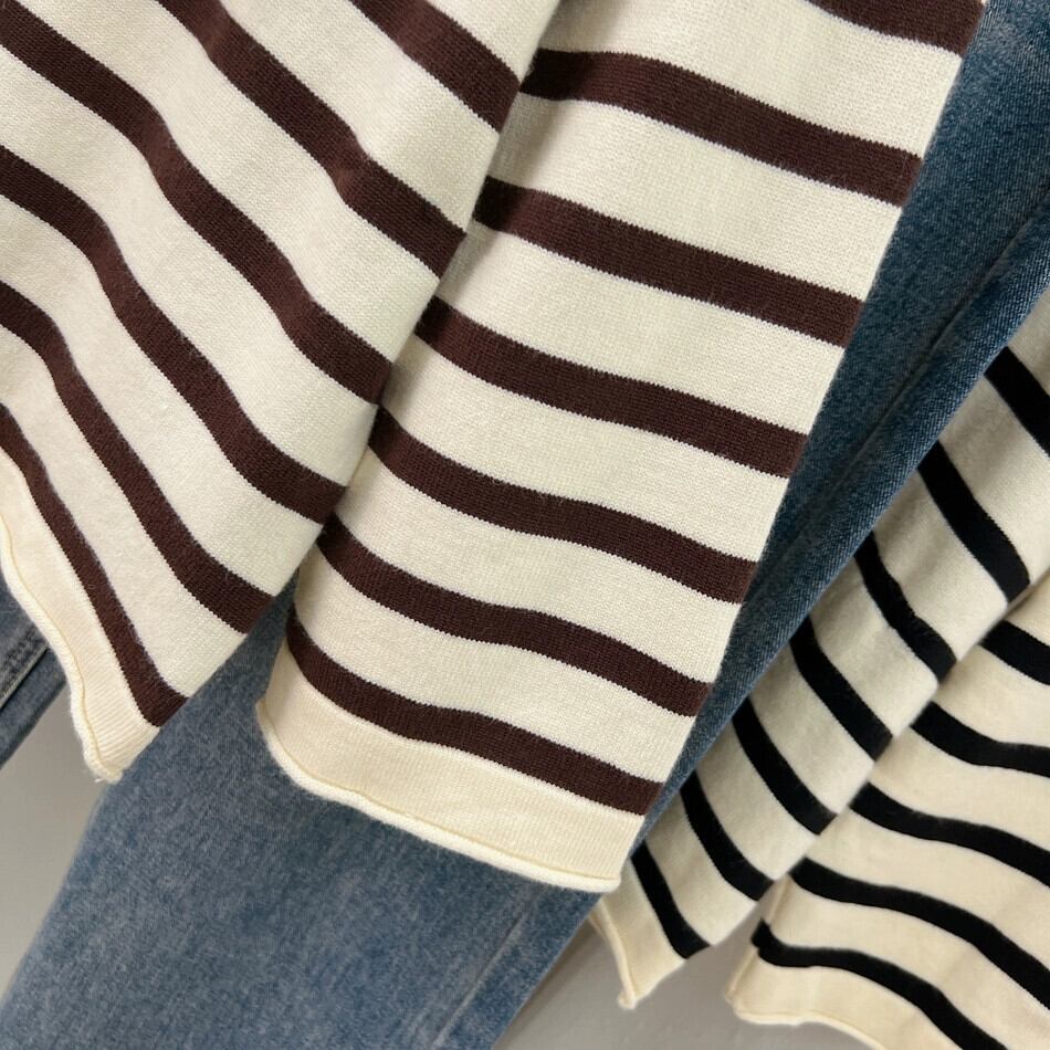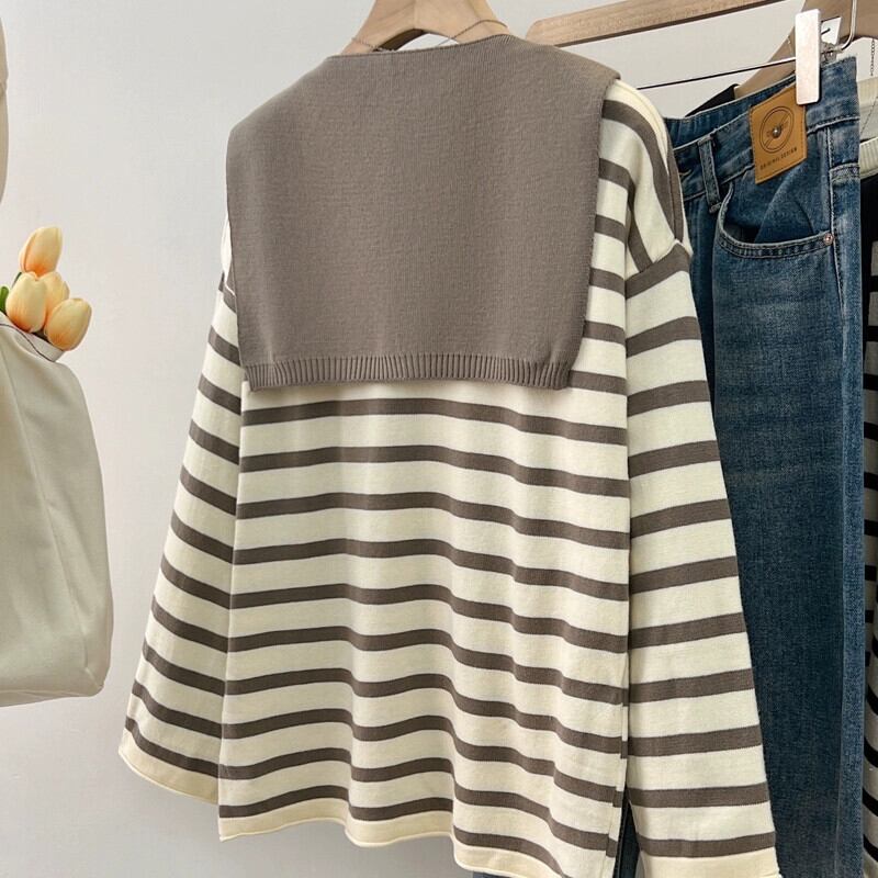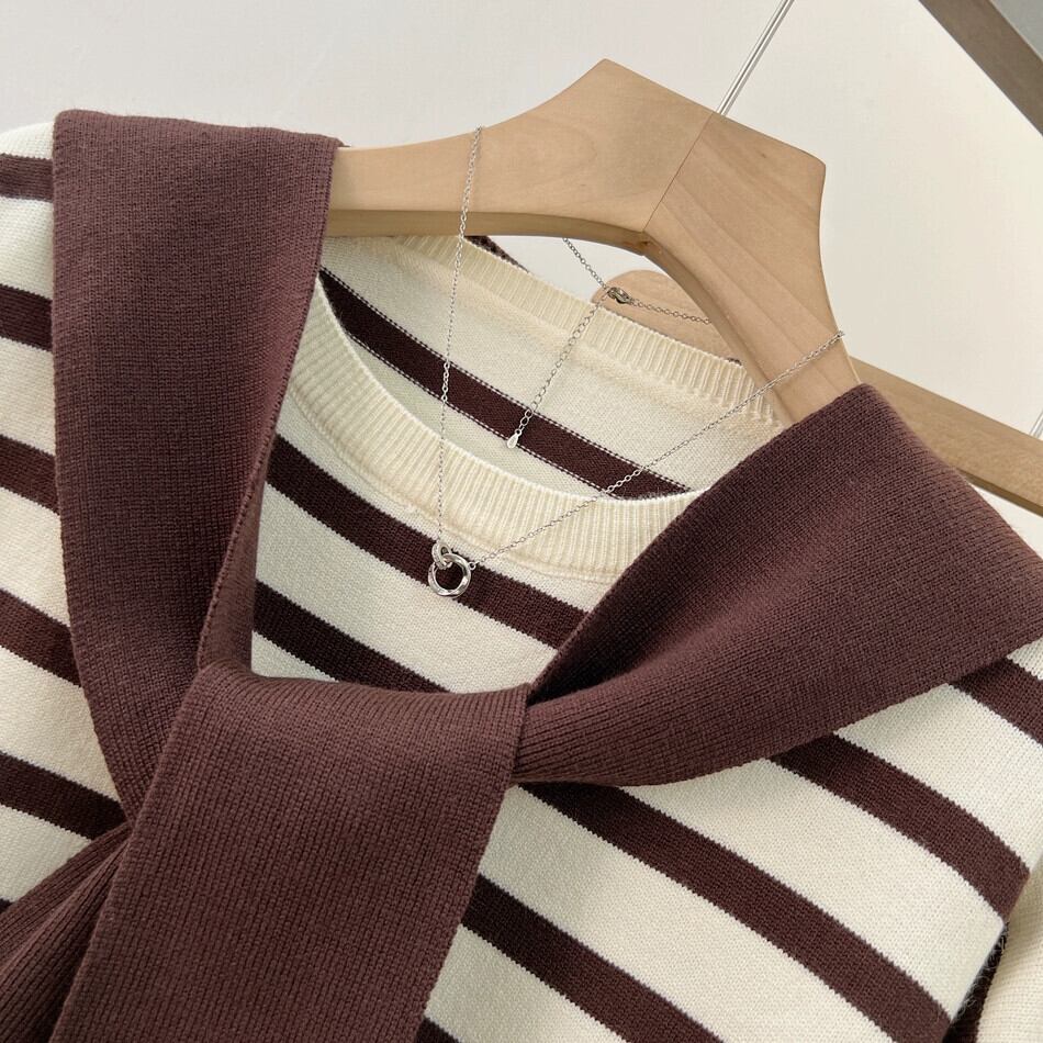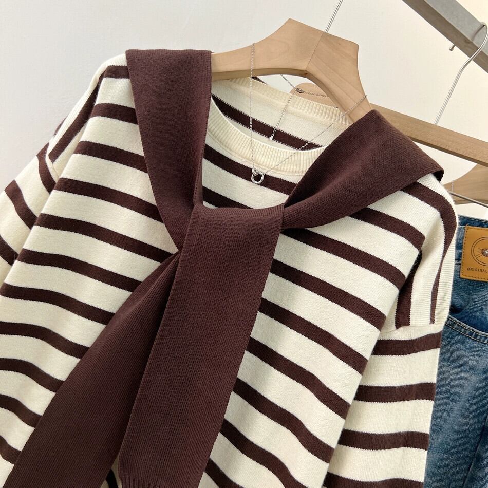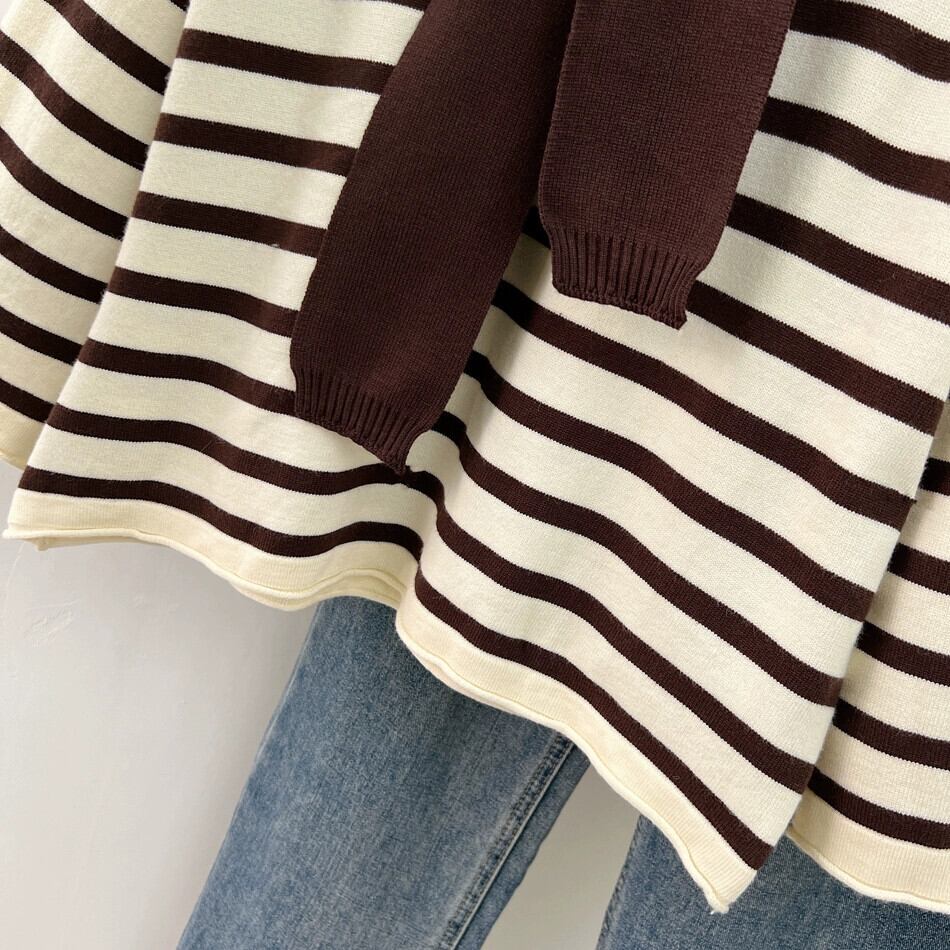 プラスサイズの女性の秋の新 2023 セーターショールストライプ長袖プルオーバールーズ痩身ボトミングシャツトップ ロング 大きめサイズ オータム 秋物 8884127902468964