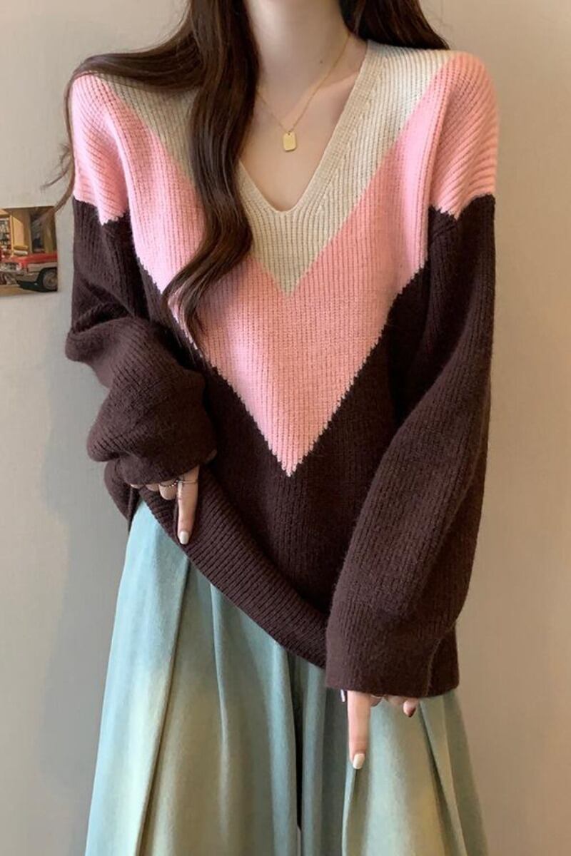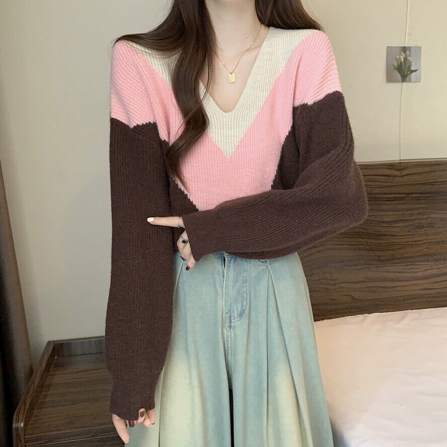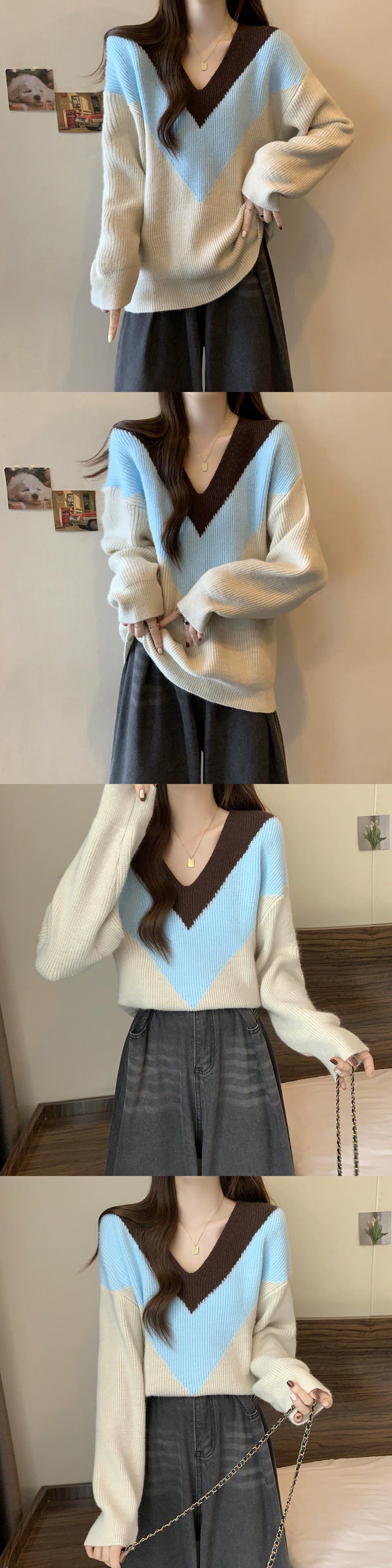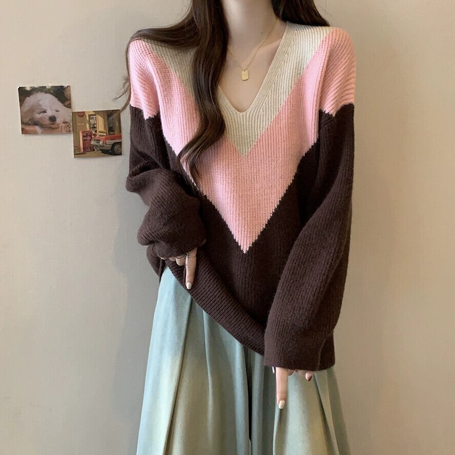 大きいサイズ 2023 秋の新しいファットシスター女性の多用途 V ネック長袖カラーブロックルーズ痩身セーターセーター ロング 大きめサイズ オータム 秋物 Vネック 8884178105381512