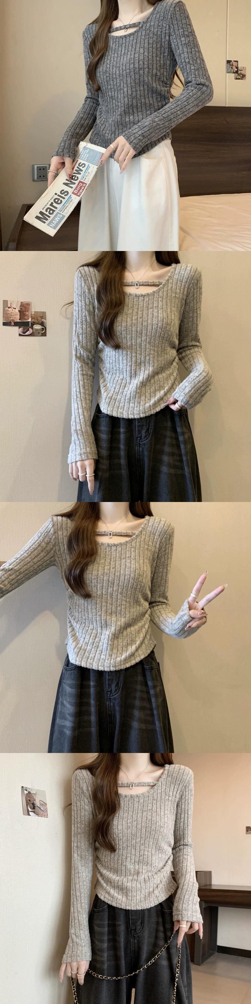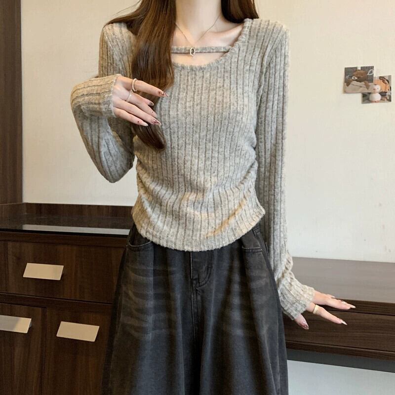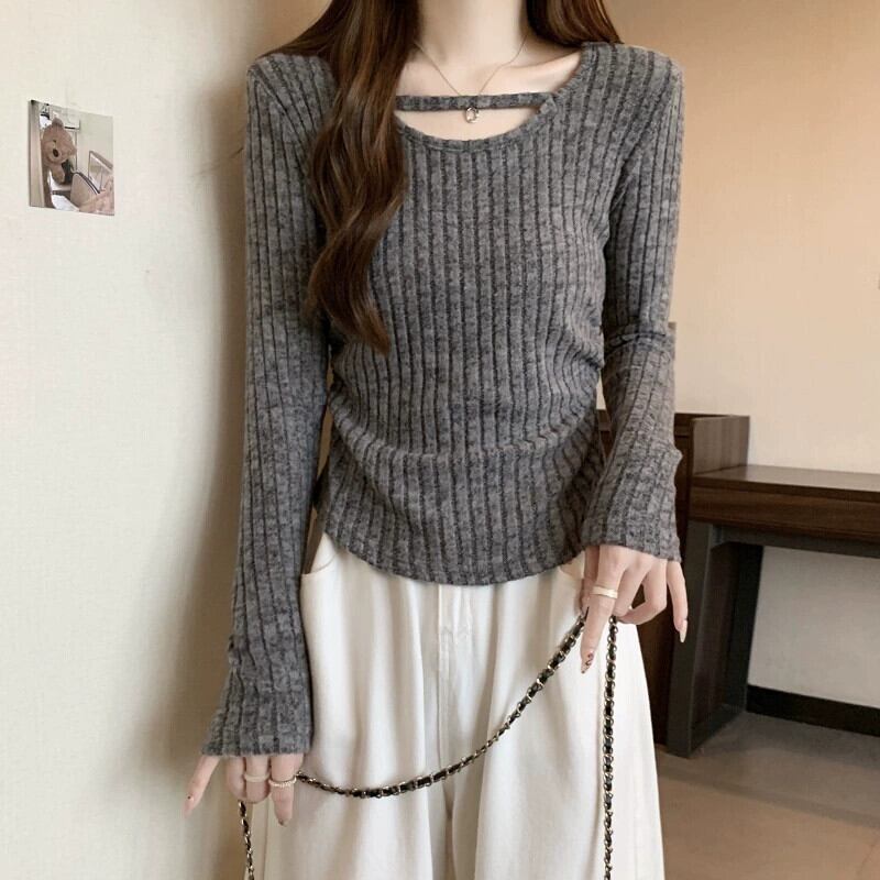 大きいサイズの秋と冬のニットインナーボトリングシャツ女性 2023 新しいスクエアネック長袖裾不規則なショートトップ ロング 大きめサイズ オータム 秋物 ウィンター 冬物 スクウェア 8884197271815089