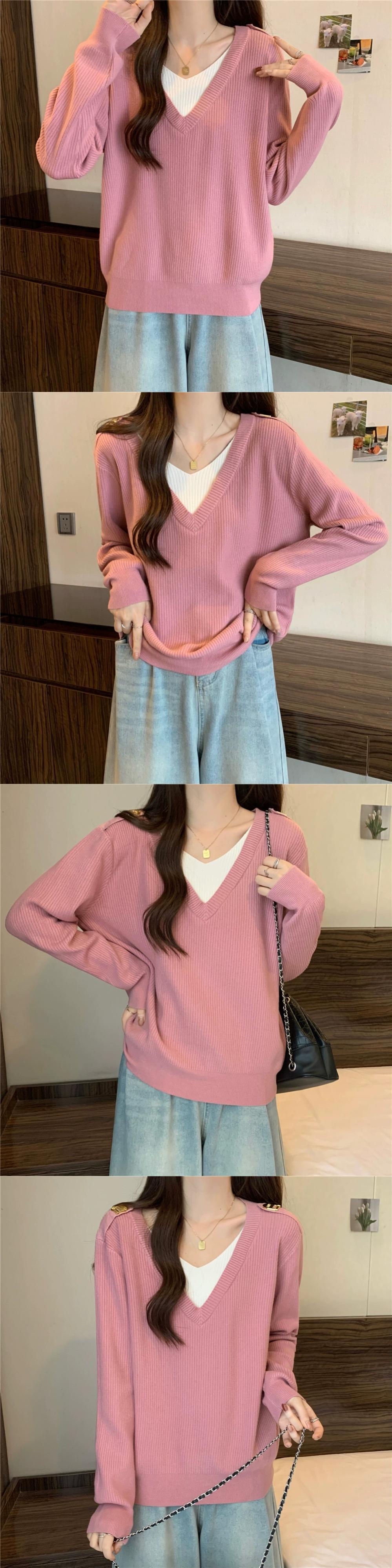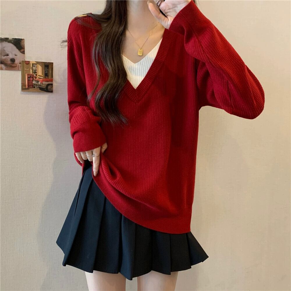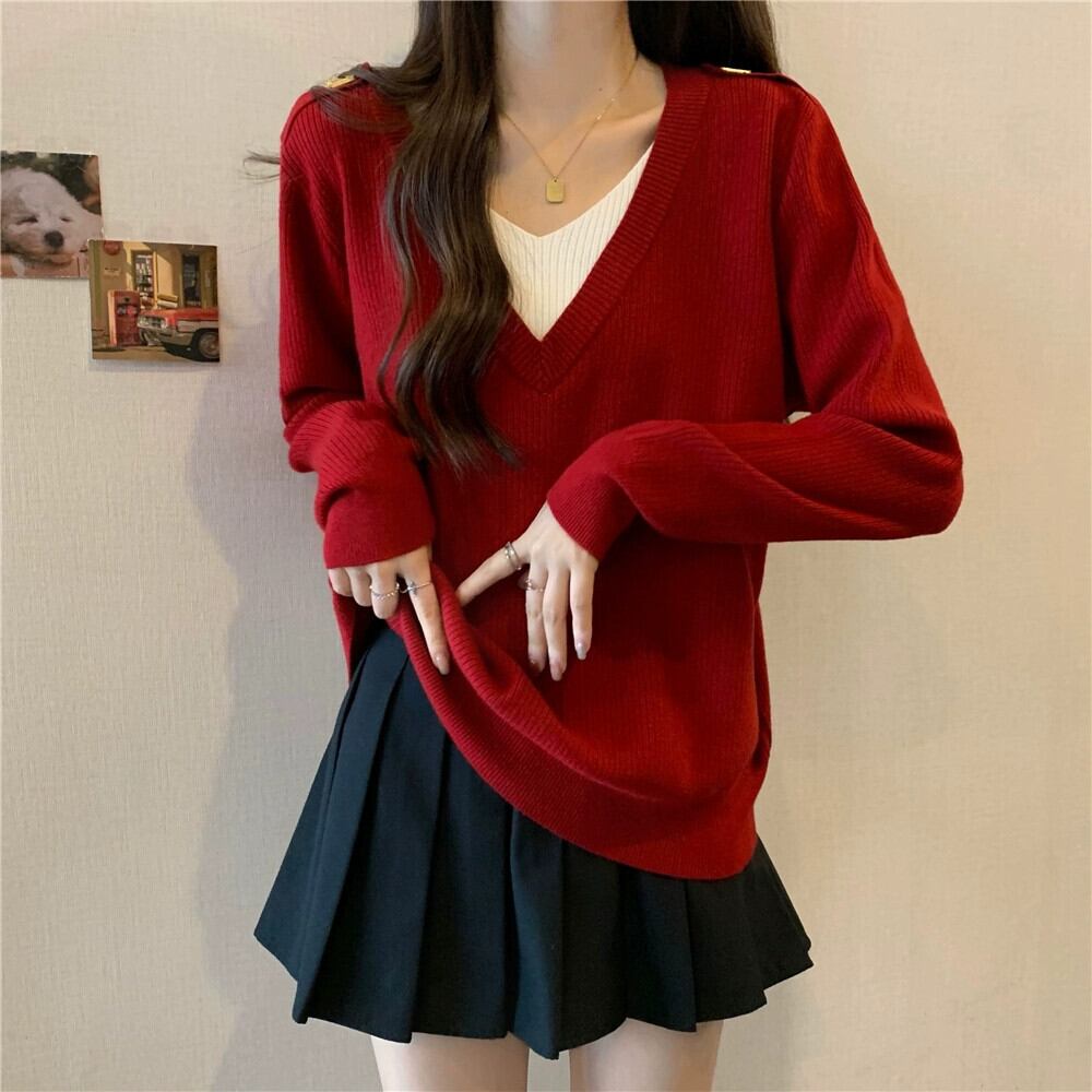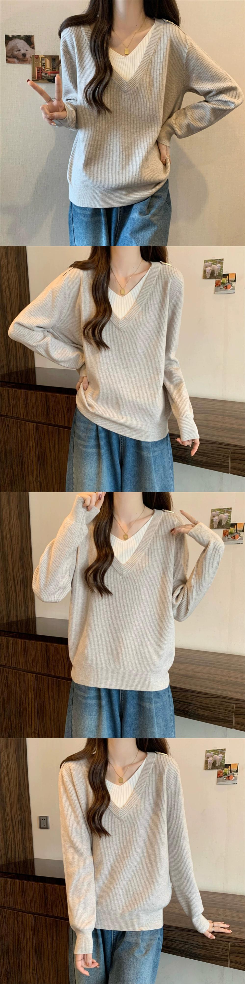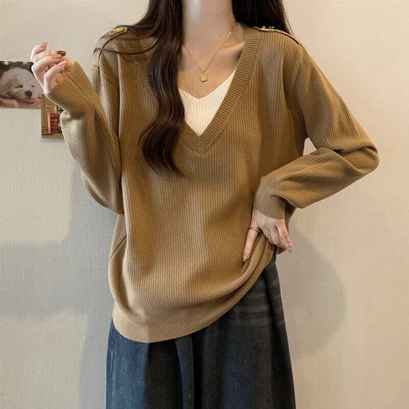 プラスサイズの女性の 2023 新しいスタイルニットセーターフェイクツーピース V ネック長袖脂肪 MM 痩身西洋スタイル年齢を減らすボトリングシャツトップ ロング 大きめサイズ Vネック 8884178319081703