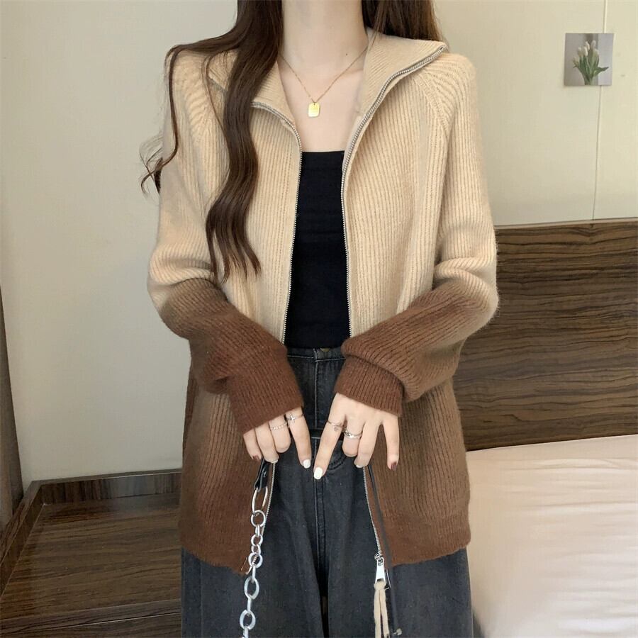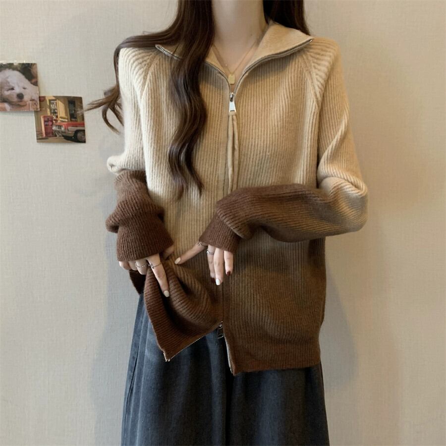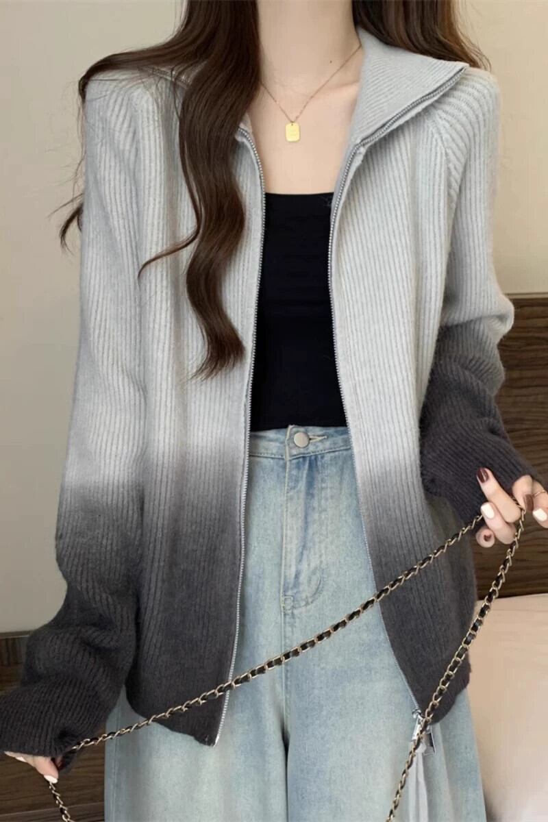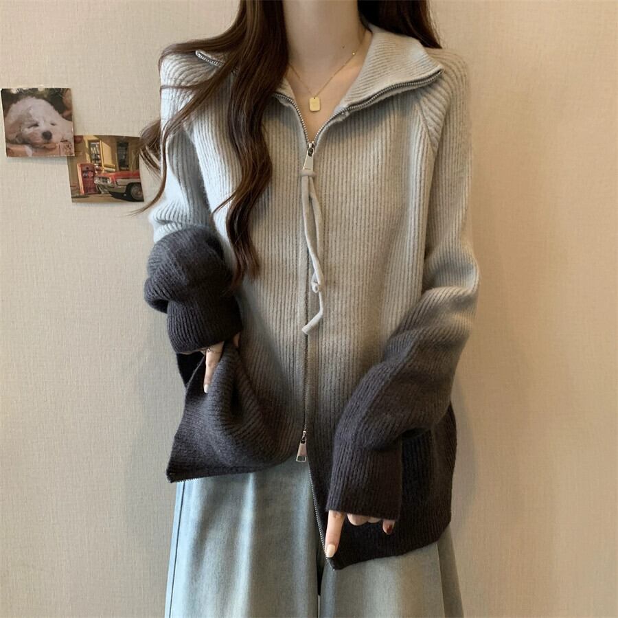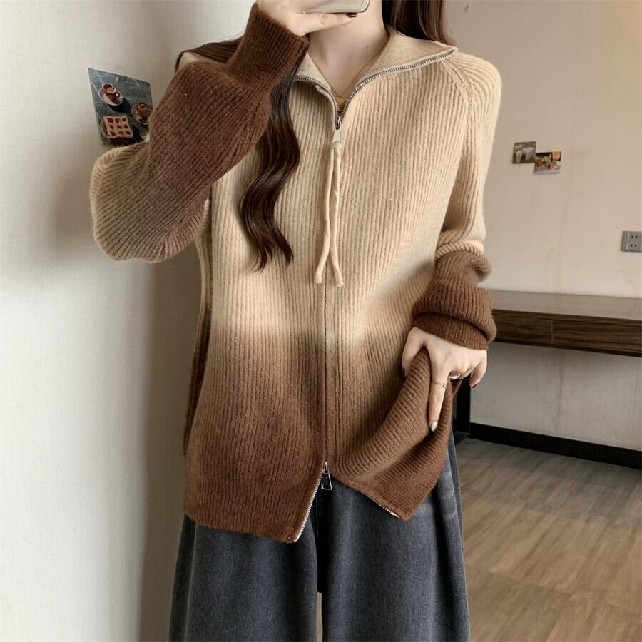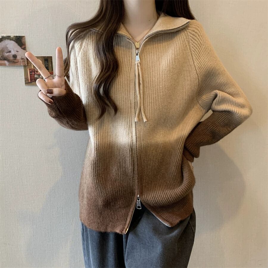プラスサイズの女性のセーターカーディガン女性の 2023 新しいコートカジュアルスリムレトログラデーションダブルジッパーラペルトレンディな 大きめサイズ 8884175277682162