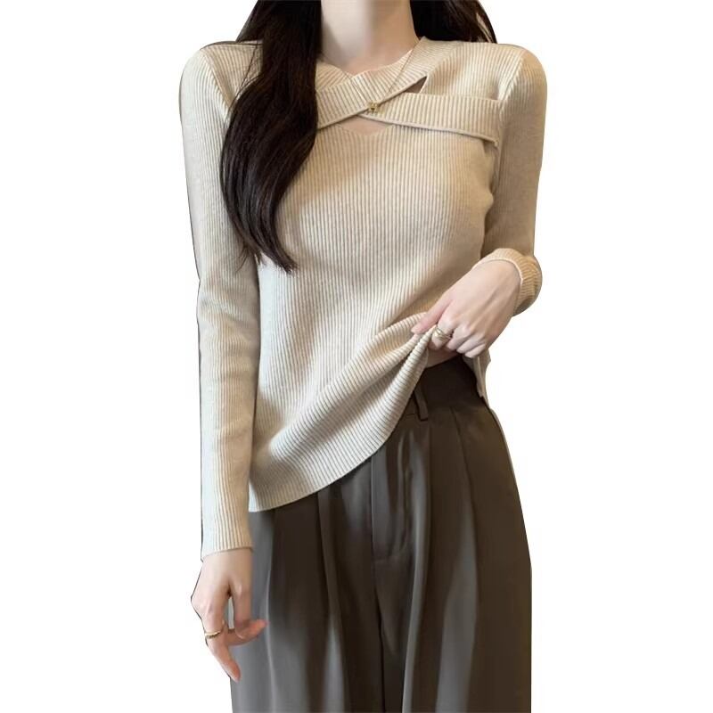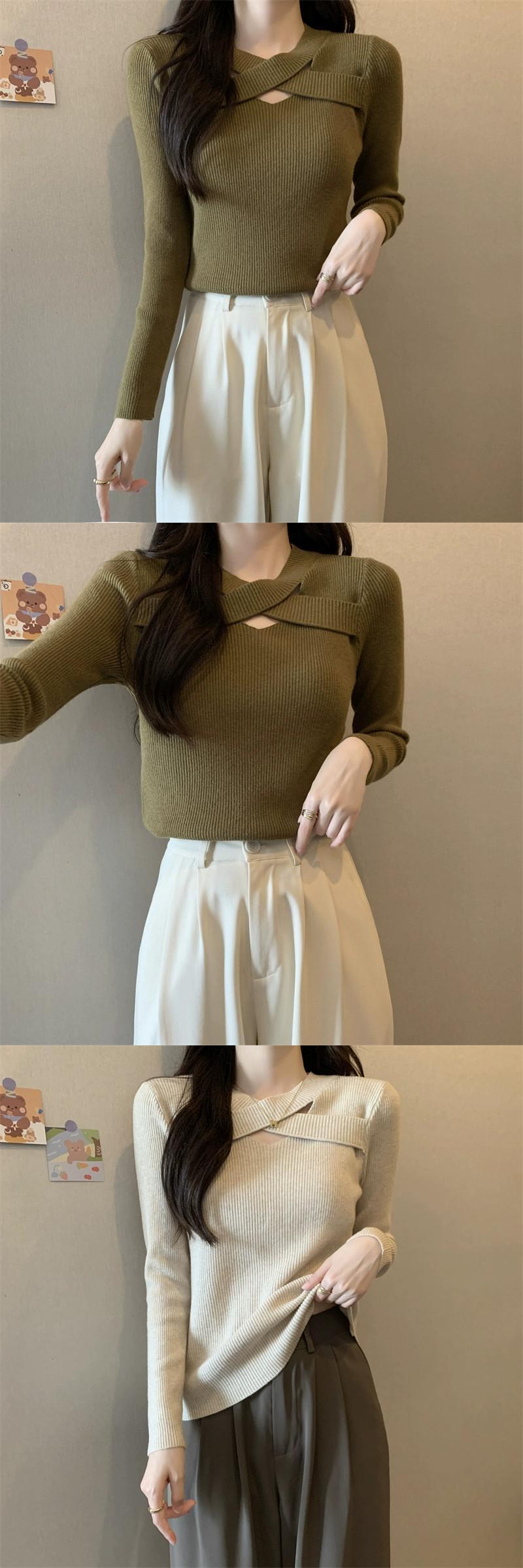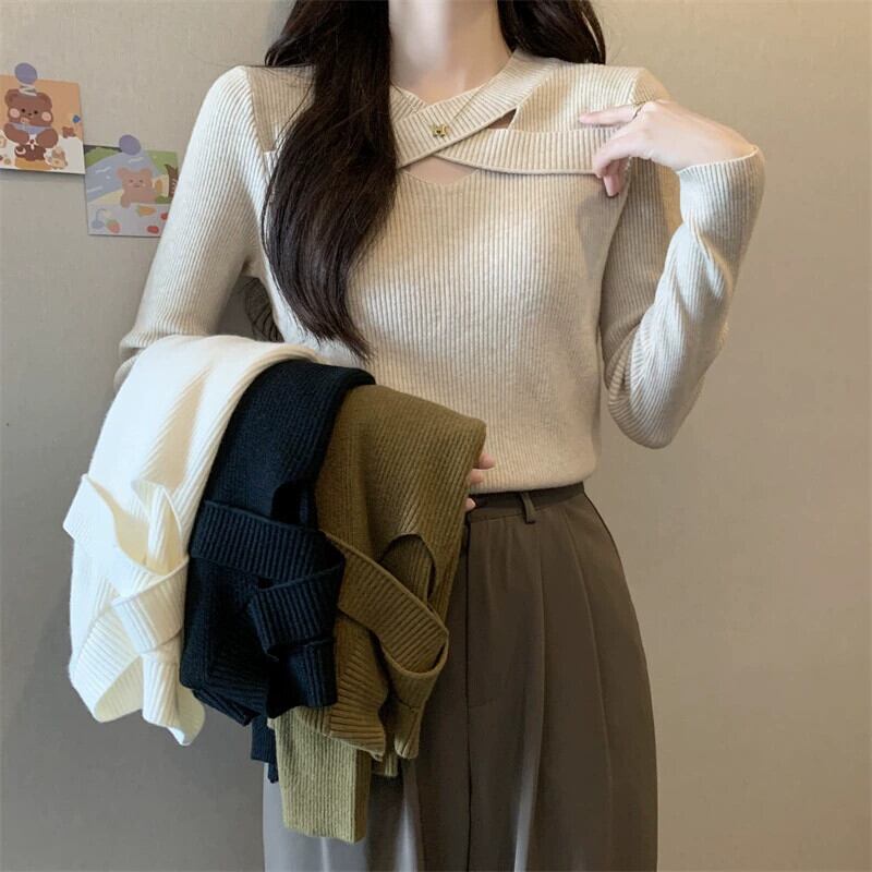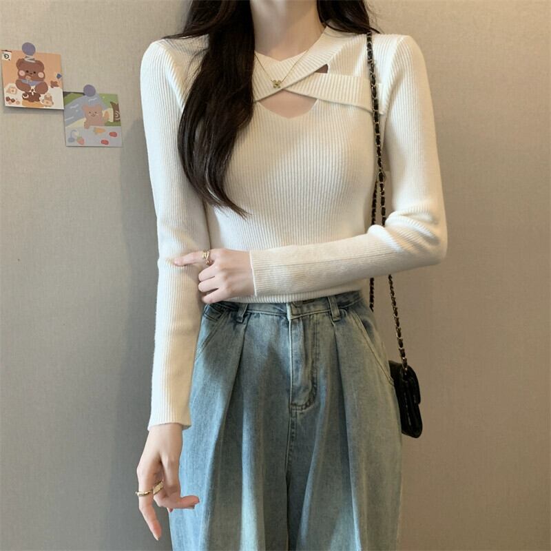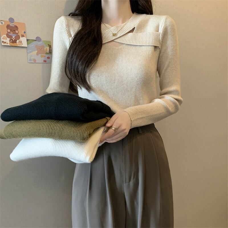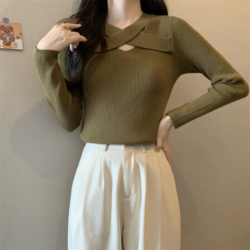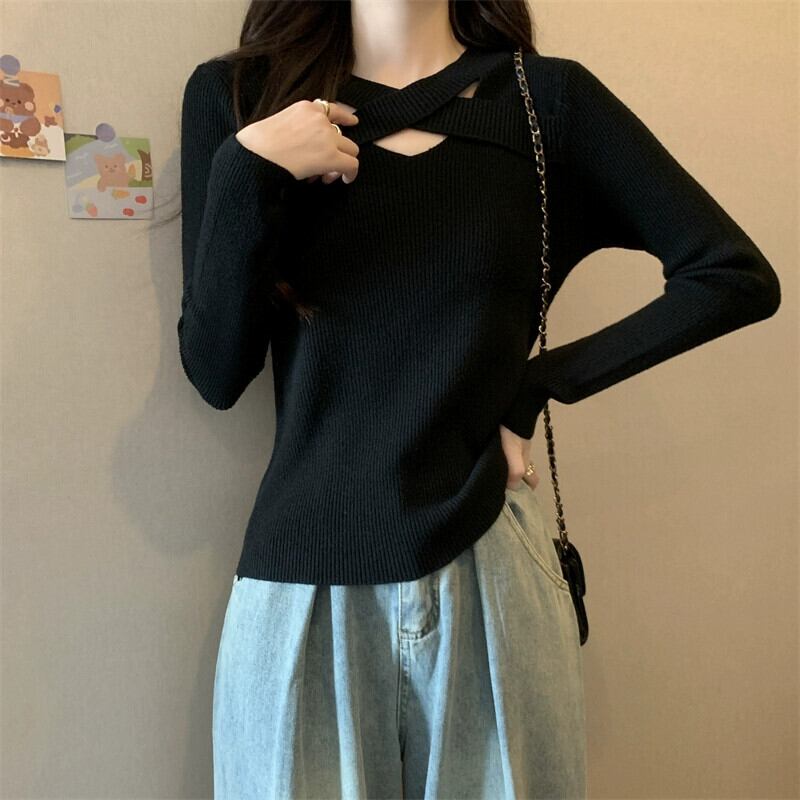 プラスサイズの秋の新ソリッドカラーデザイン中空長袖セーター女性脂肪ミリメートル痩身ボトミングシャツ多用途トップ ロング 大きめサイズ オータム 秋物 8884181181131728