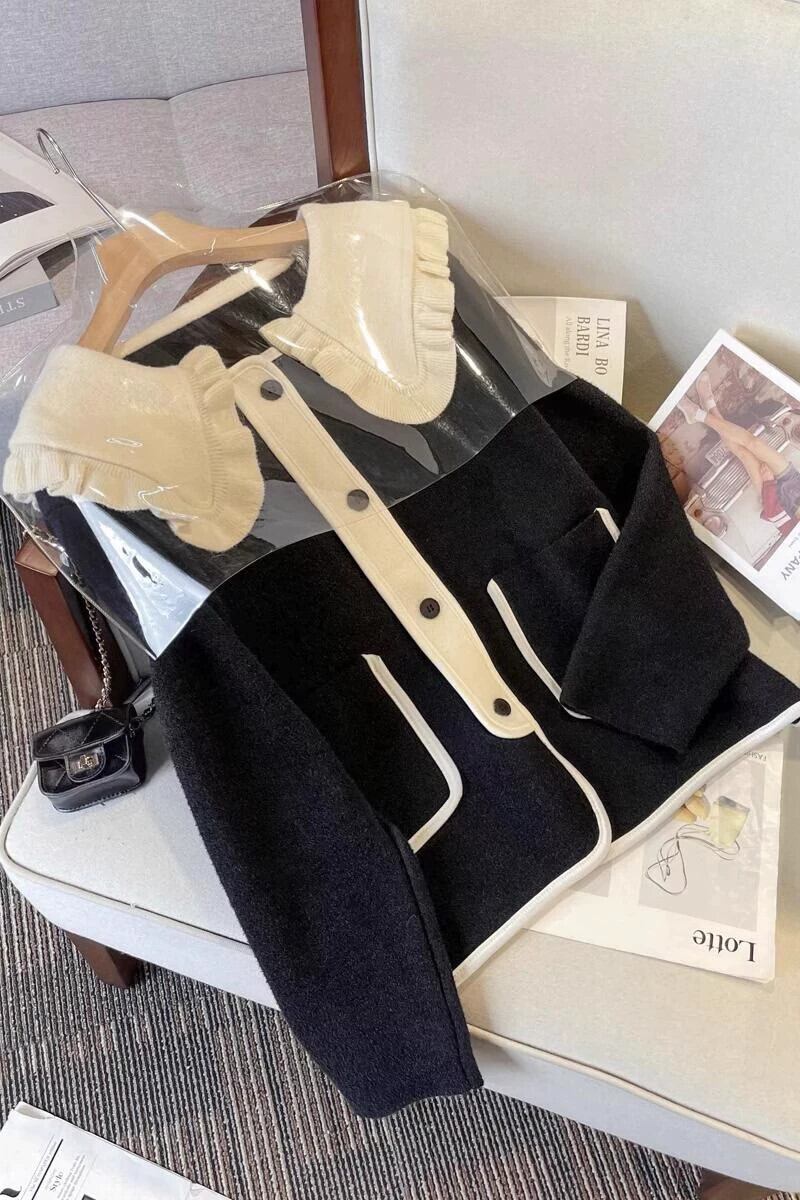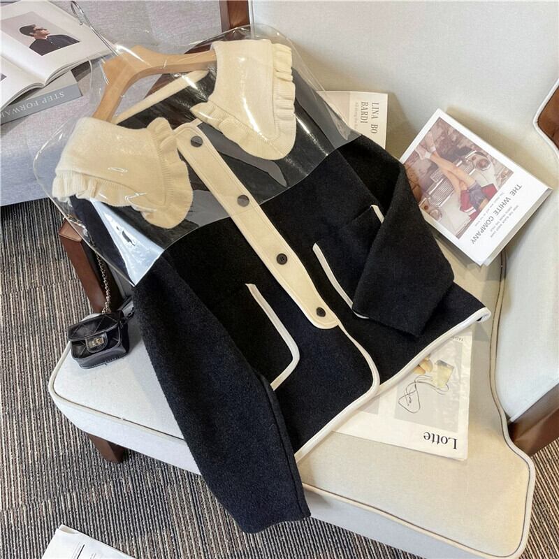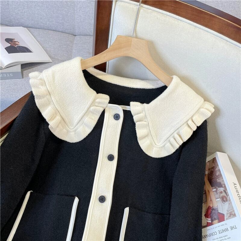 プラスサイズの女性の 2023 秋と冬の新しいセーター人形の襟長袖カーディガン対照的な色多用途ファッショナブルなウールジャケットトレンド ロング 大きめサイズ オータム 秋物 ウィンター 冬物 8884148929995477