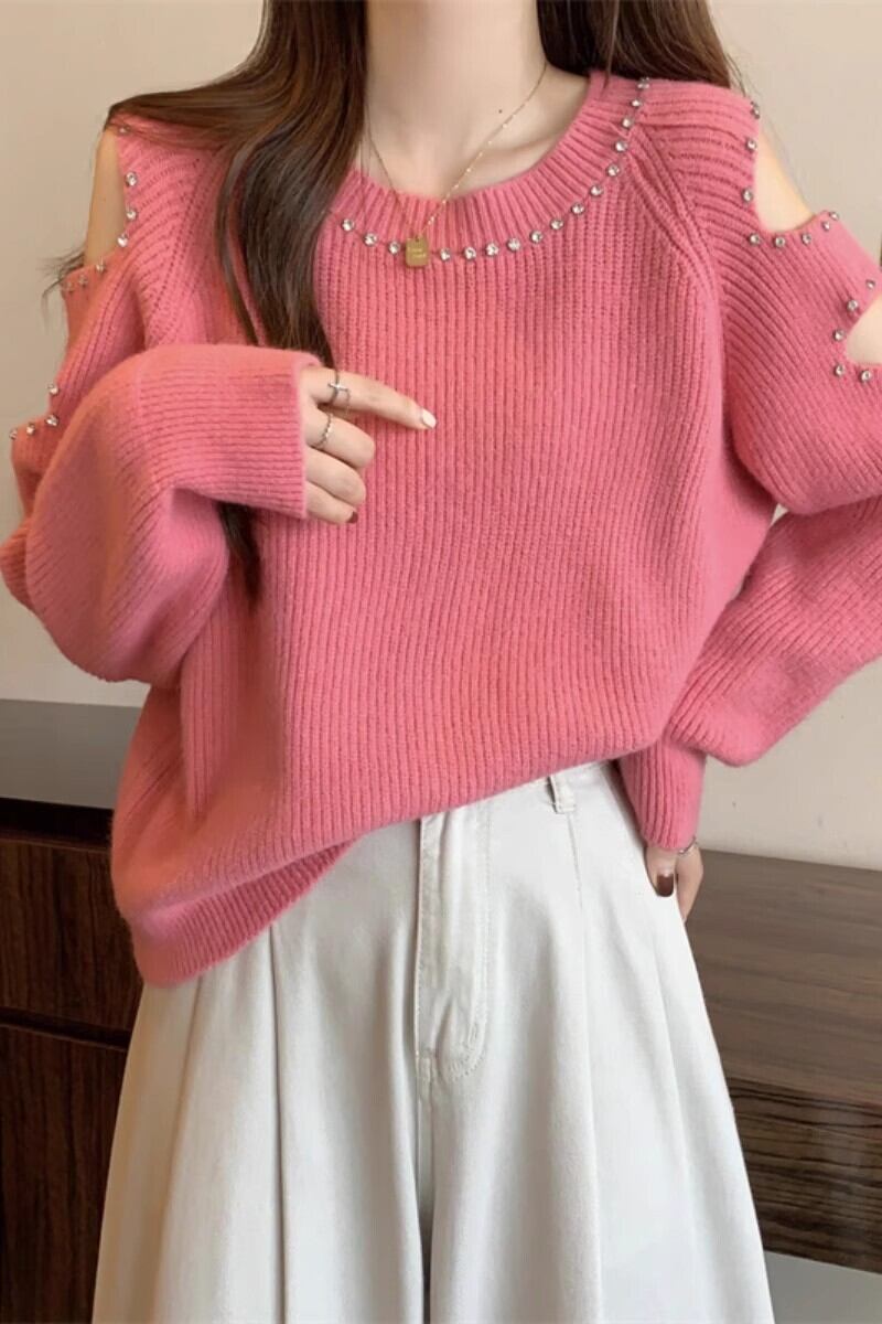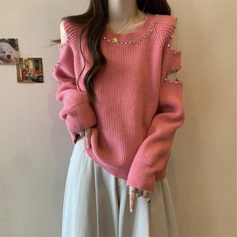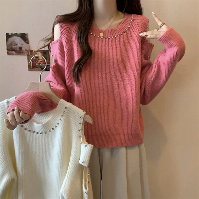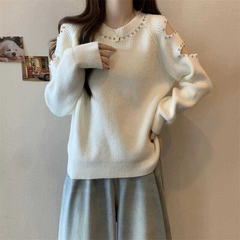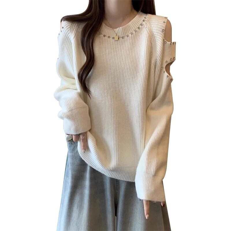 大きいサイズの女性のビーズプルオーバーセーター秋と冬の新 2023 ルーズ怠惰なスタイルプルオーバーオフショルダーセーター女性 大きめサイズ オータム 秋物 ウィンター 冬物 8884136531898564