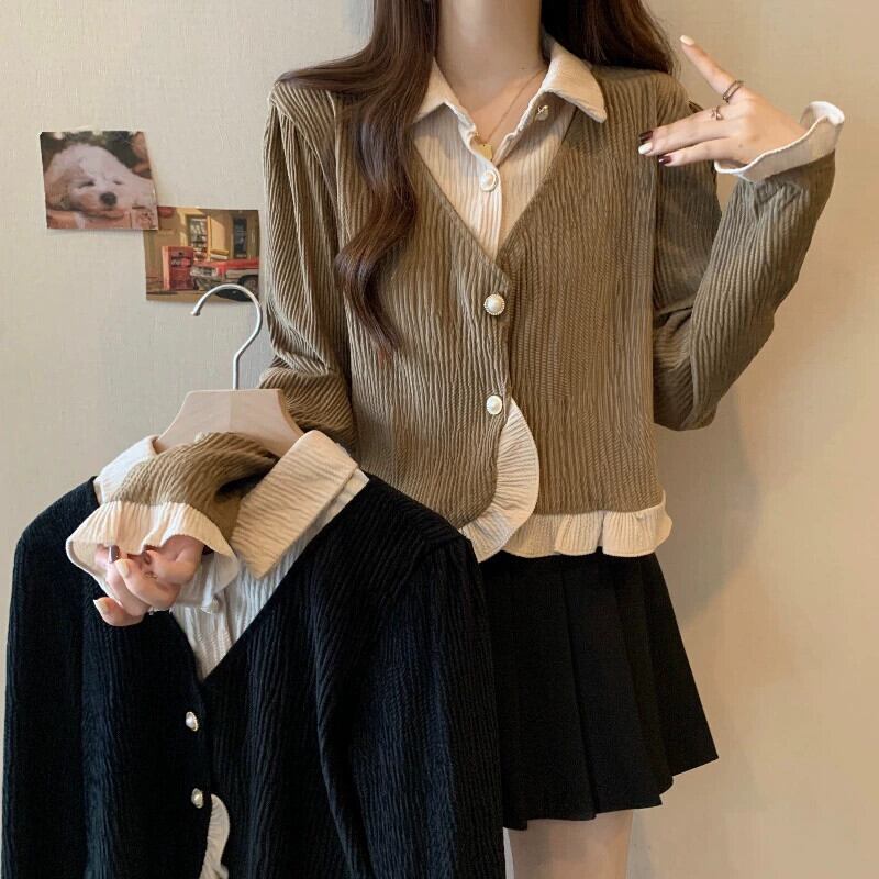 プラスサイズの婦人服 2023 秋と冬の新しいファット mm シングルブレストのポロカラー長袖コントラストステッチ多用途ファッショナブルなシャツ ロング 大きめサイズ オータム 秋物 ウィンター 冬物 8884193924878868