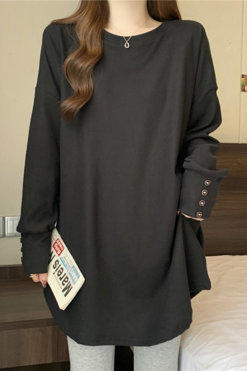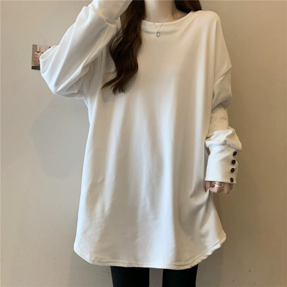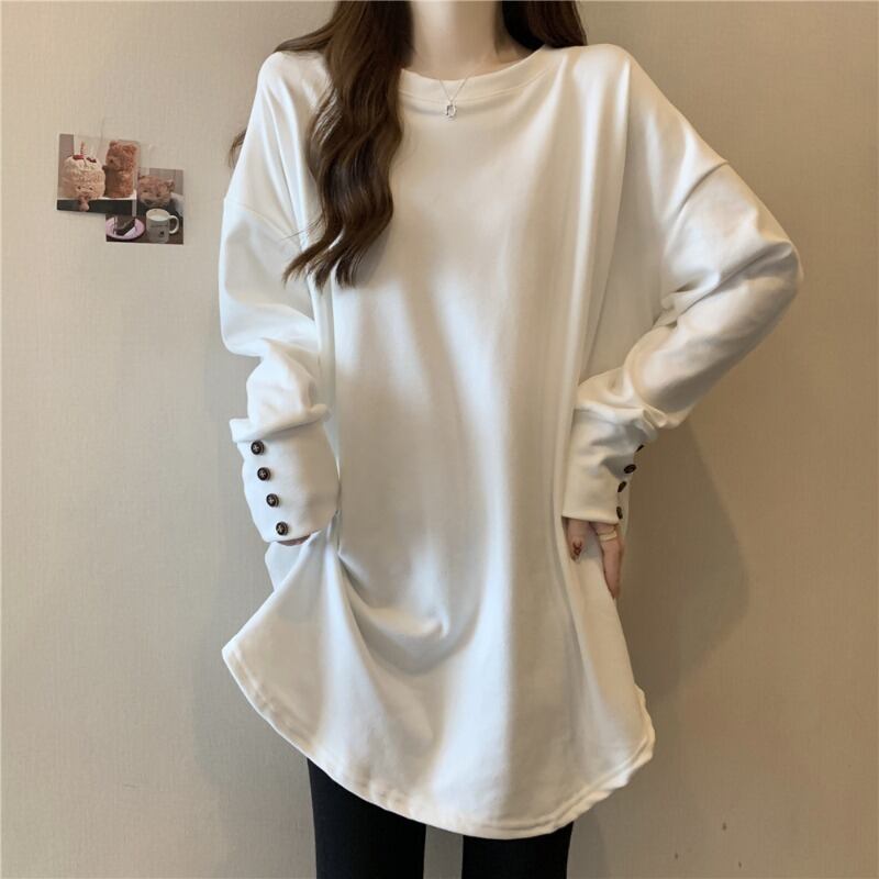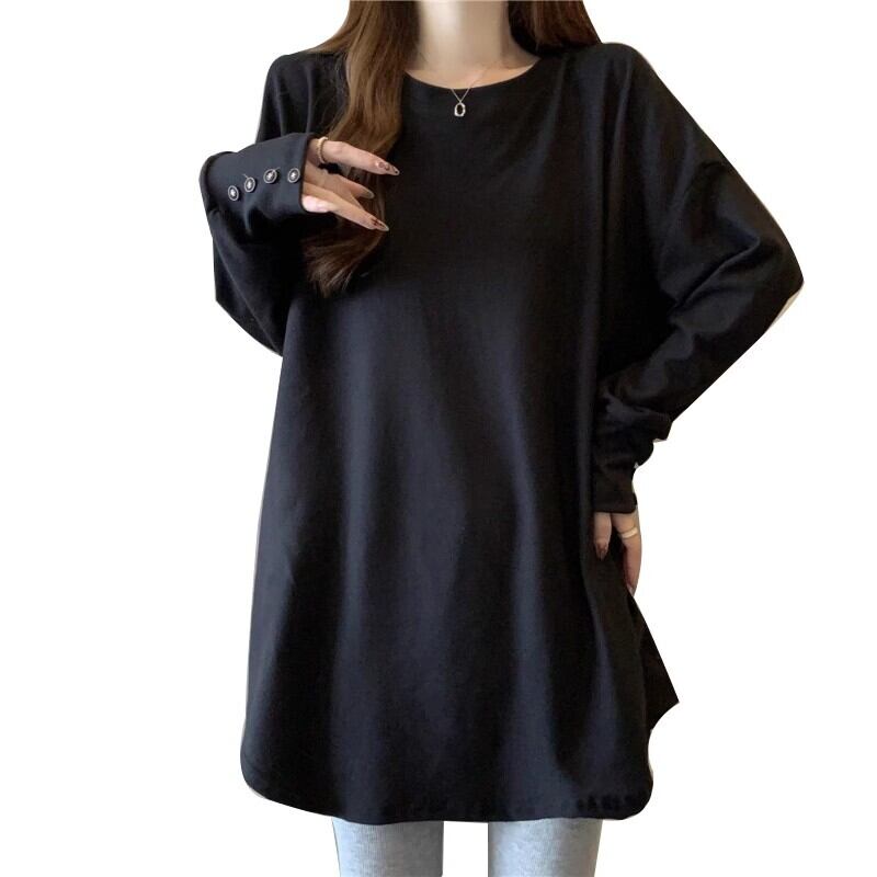 プラスサイズ 2023 秋冬新作ファットシスターレディースラウンドネック無地ファッショナブルなゆるいお腹カバースリム長袖トップトレンディ ロング 大きめサイズ オータム 秋物 ウィンター 冬物 Oネック ソリッドカラー 8884186068173030