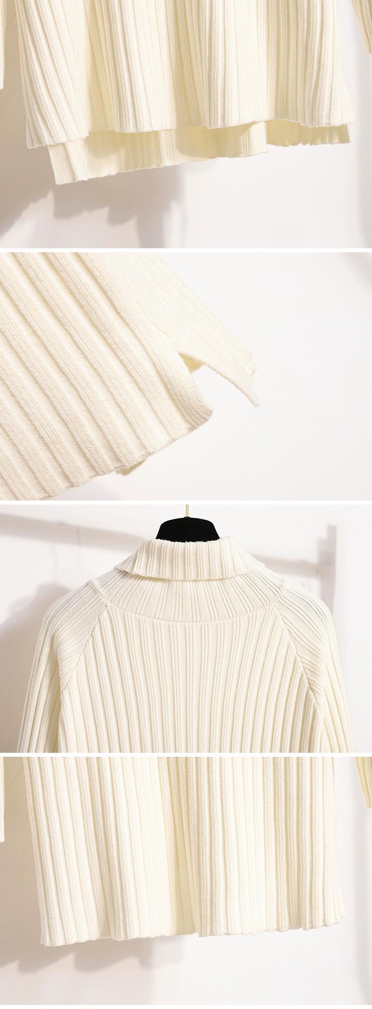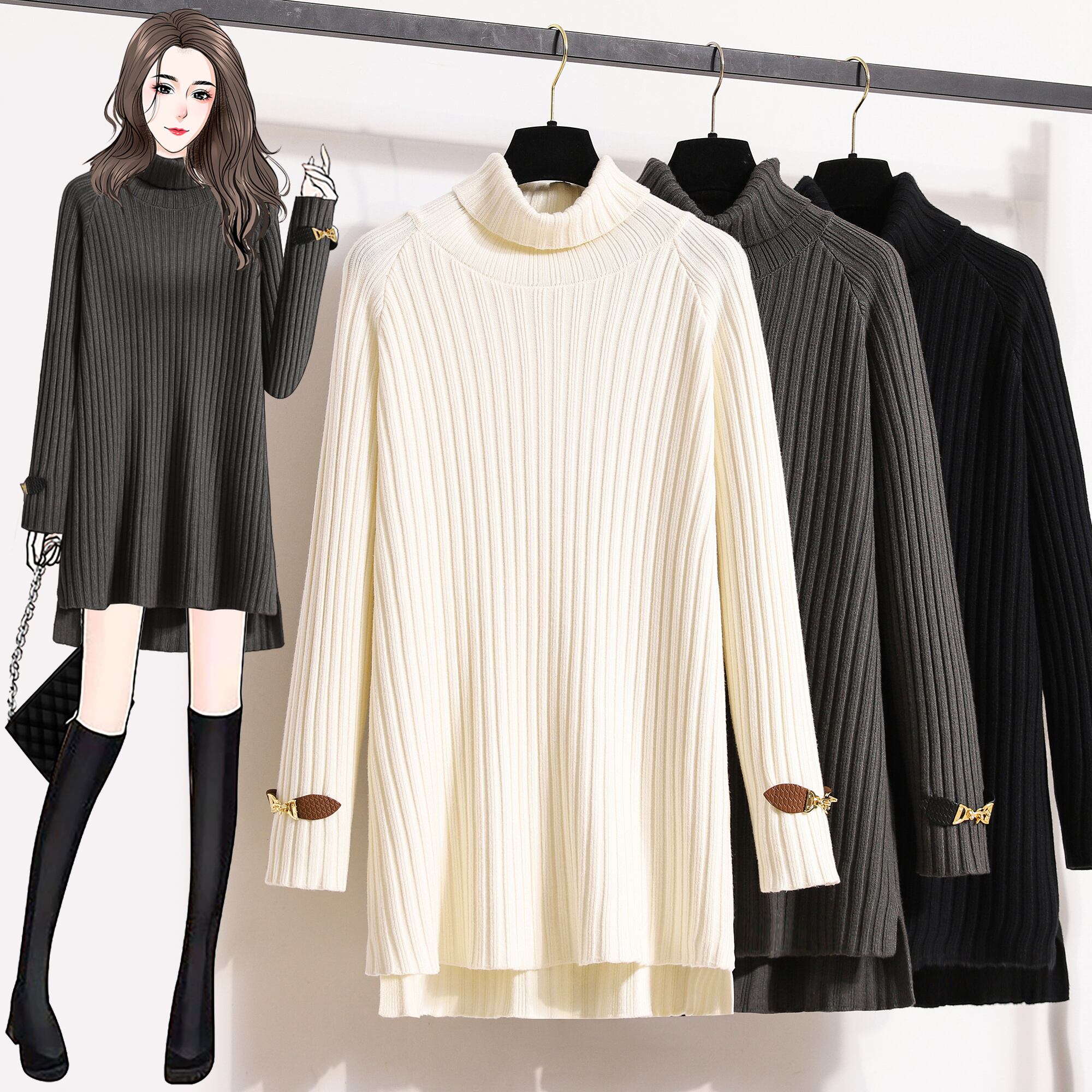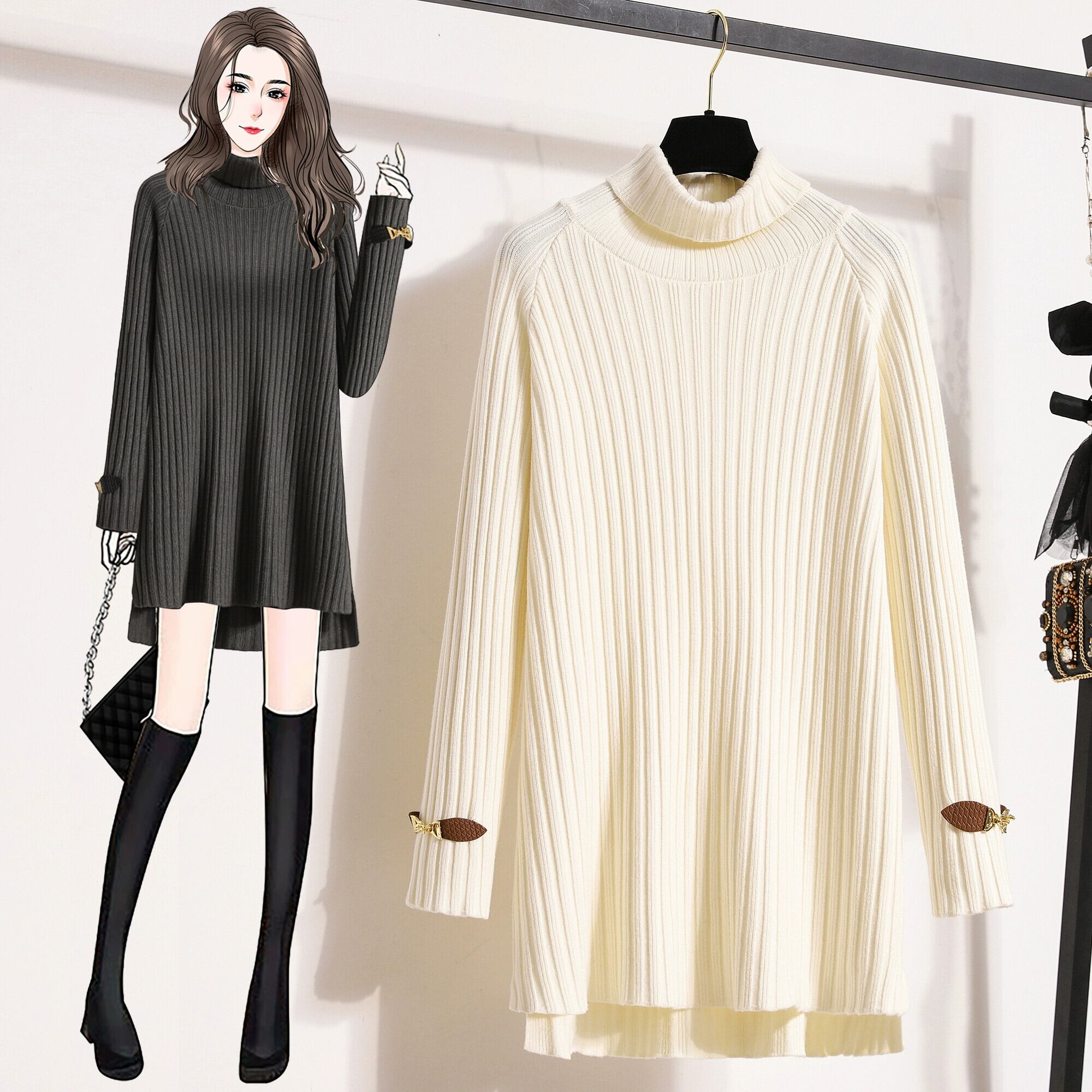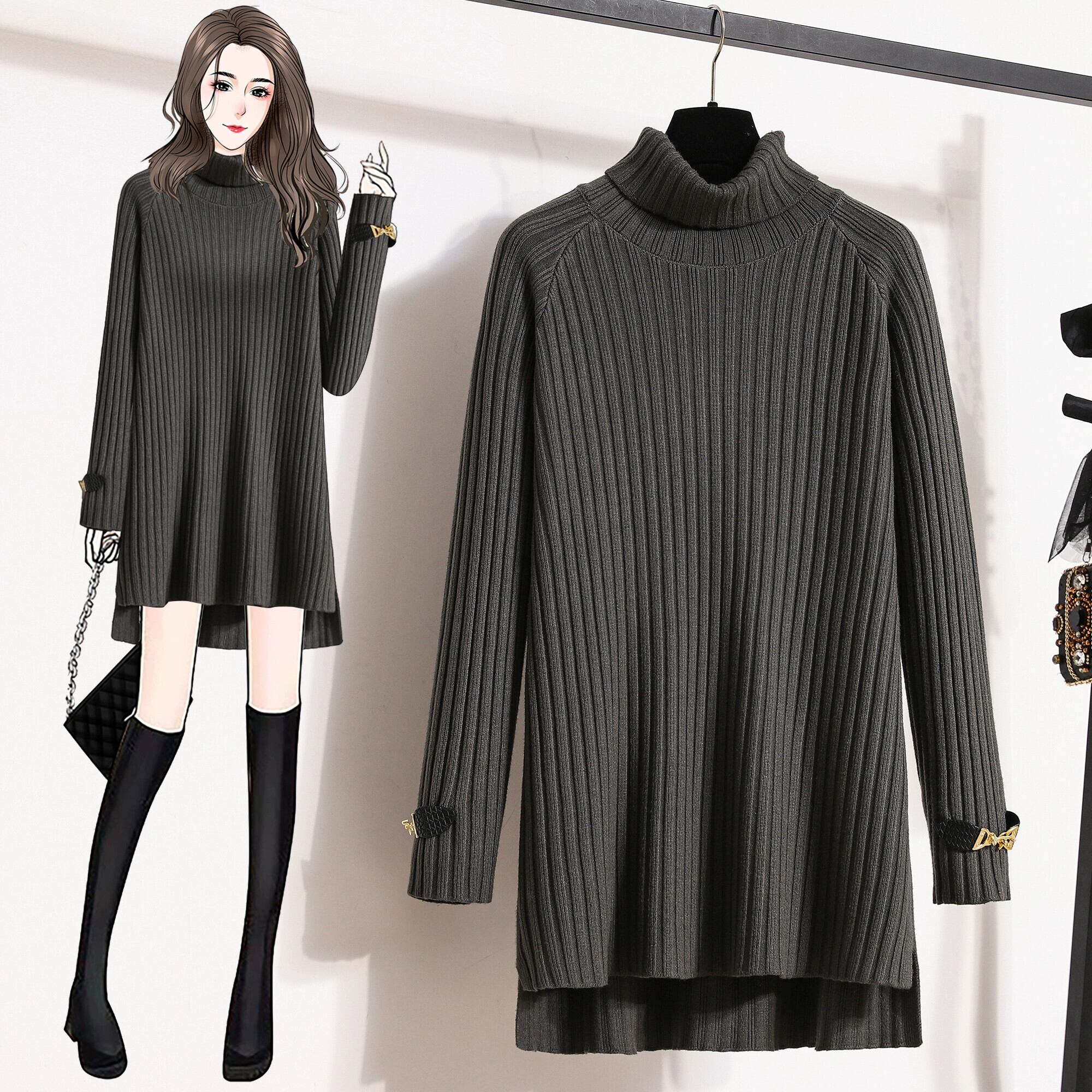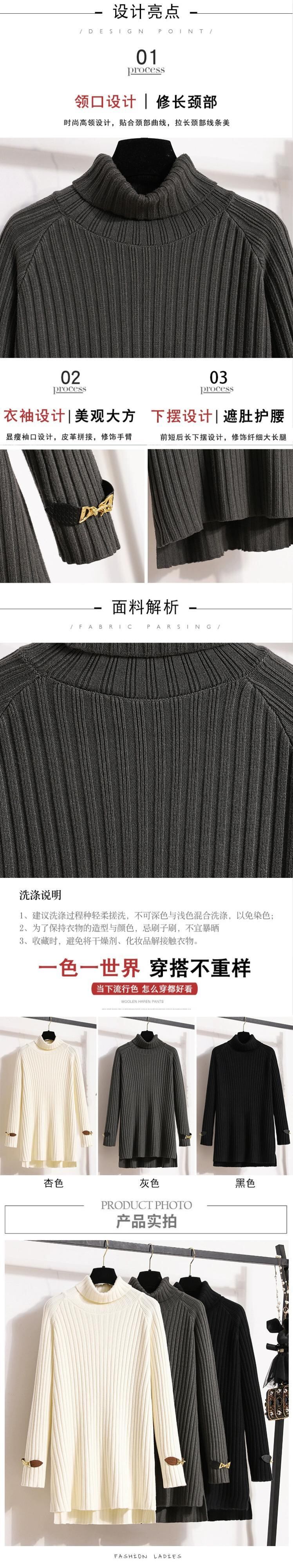 プラスサイズの女性の 2023 秋冬新スタイルスプライシングレザーバックルルーズソリッドカラータートルネックミッドレングスニットセーターボトミングシャツ 大きめサイズ オータム 秋物 ウィンター 冬物 8884151503118525