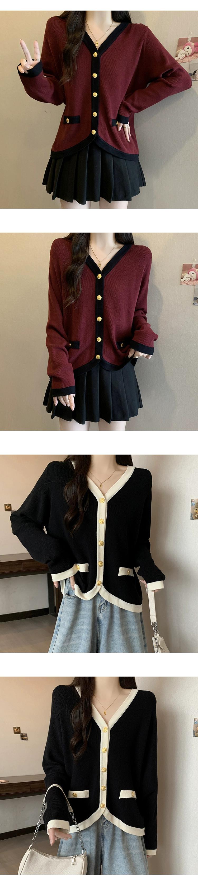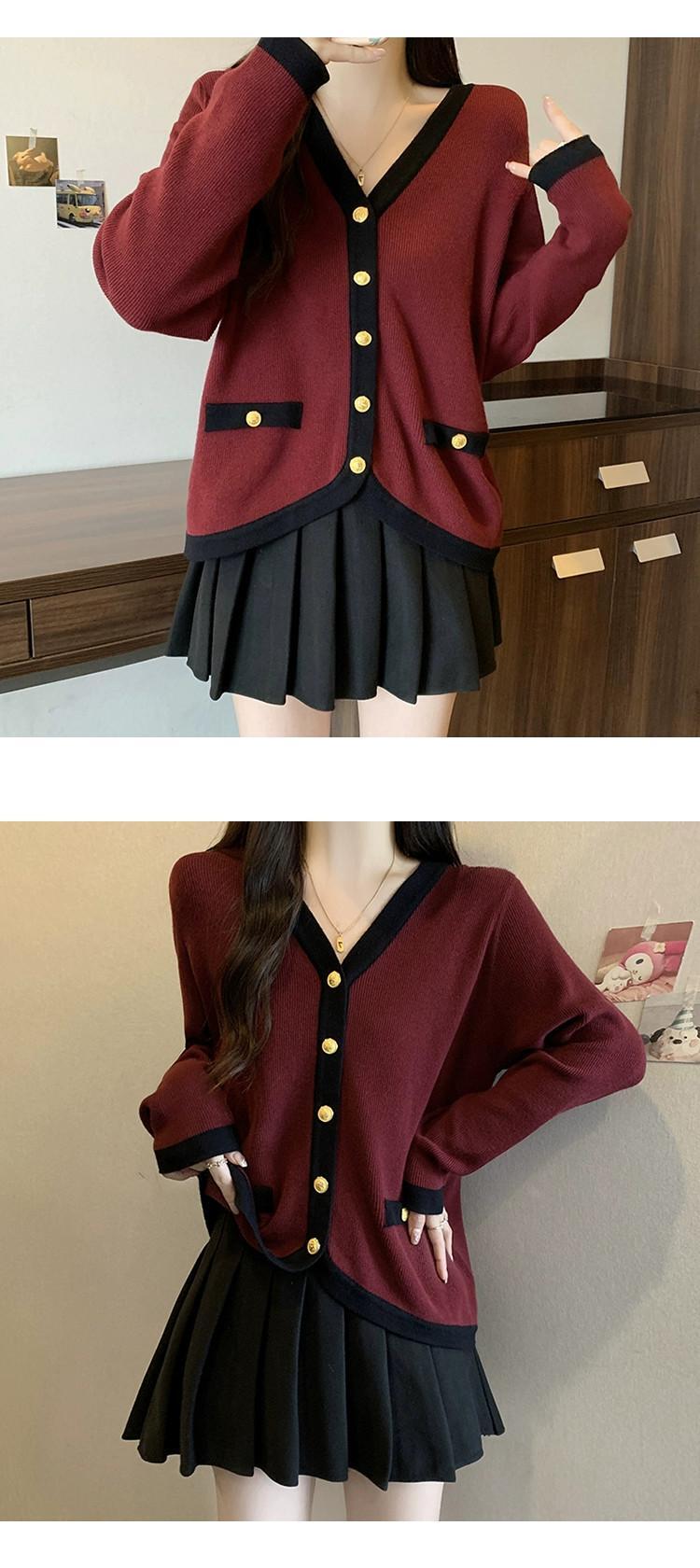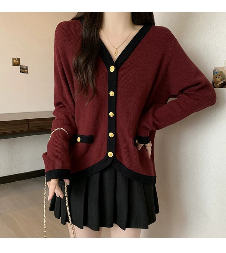 大きいサイズの V ネックカーディガン女性の秋と冬の新しいスタイルのファット MM ファッションスリムコントラストカラー多用途怠惰なニットレトロ赤セーター レッド 大きめサイズ オータム 秋物 ウィンター 冬物 Vネック 888415292509155