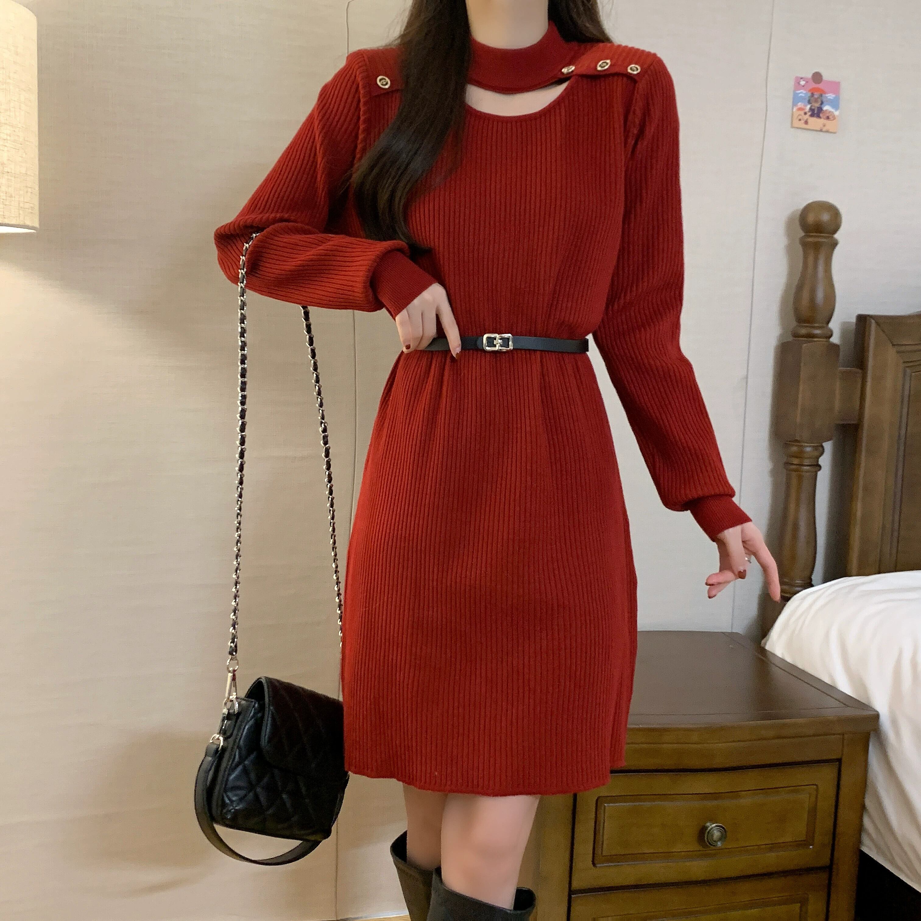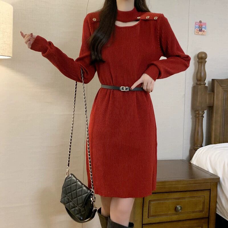 プラスサイズの婦人服 2023 トレンディな秋の新しい脂肪姉妹ニットドレス小さな赤いセーター小さな人々 とインナーベース レッド 大きめサイズ オータム 秋物 8884197871694928