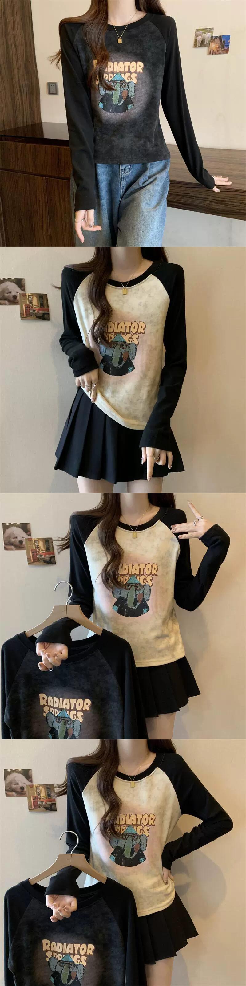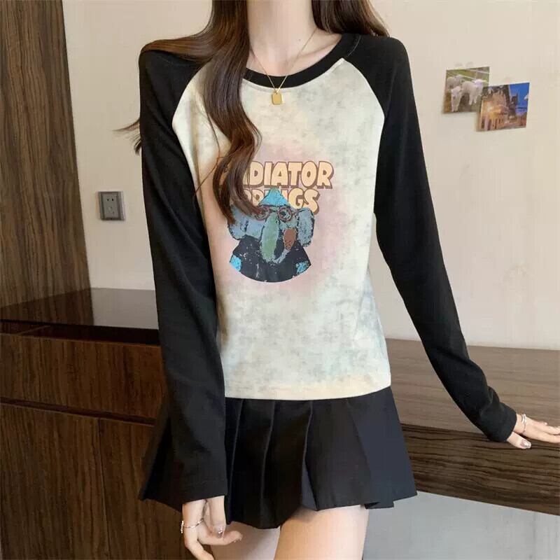 プラスサイズの女性の 2023 冬の新ファットシスターボトリングシャツスリムとスリムプリントカラーマッチングラグランスリーブ Tシャツ女性 大きめサイズ ウィンター 冬物 8884178859645438