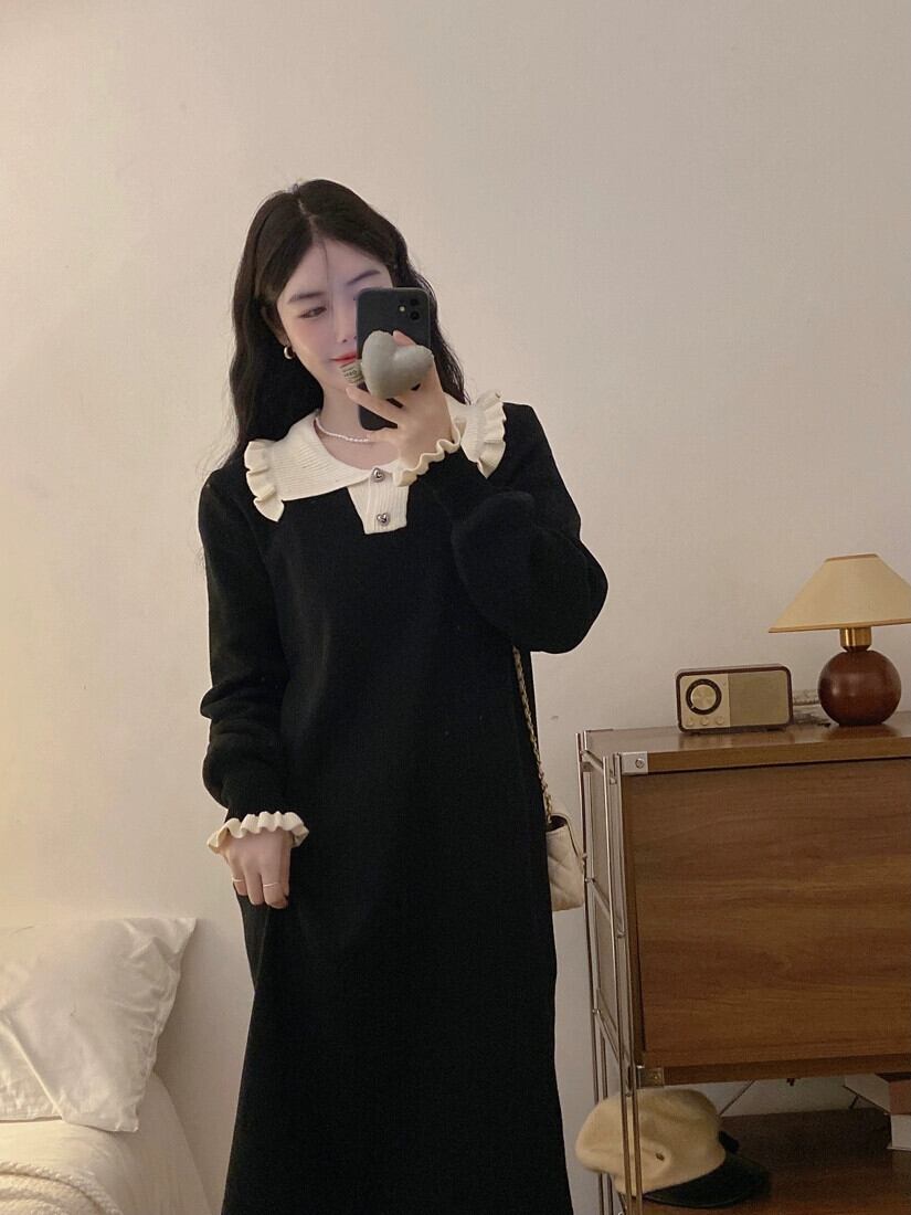 プラスサイズの女性の長袖ニットドレス秋と冬のハイエンド年齢を軽減する A ラインスカートヘップバーン スタイルのリトル ブラック ドレス ロング 大きめサイズ オータム 秋物 ウィンター 冬物 Aライン 8884111667932952