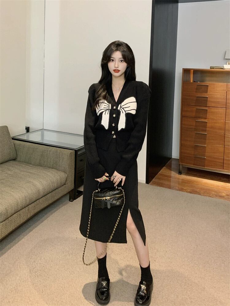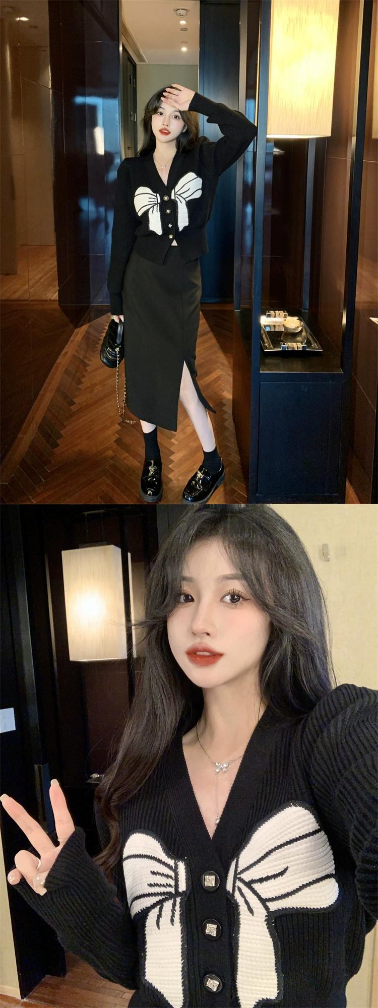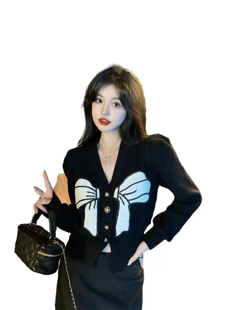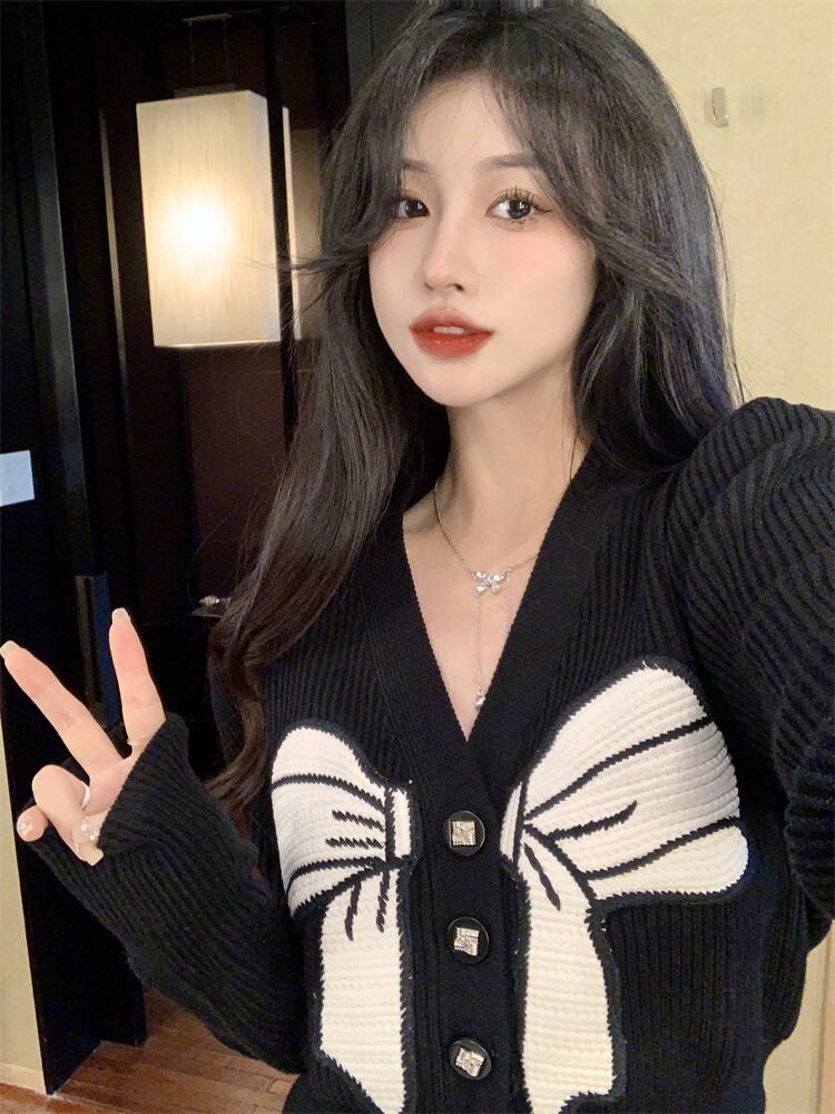 プラスサイズの女性の弓対照的な色 V ネックカーディガンセーター冬の新しい脂肪 mm 痩身長袖セータートップ ロング リボン 大きめサイズ ウィンター 冬物 Vネック 8884194743719389