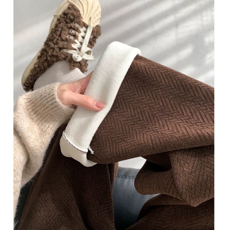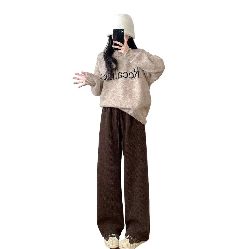ブラウンウールワイドレッグパンツ女性秋冬2023新しいハイウエストストレートヘリンボーンシェニールプラスベルベットカジュアルパンツ オータム 秋物 ウィンター 冬物 8884168313161109