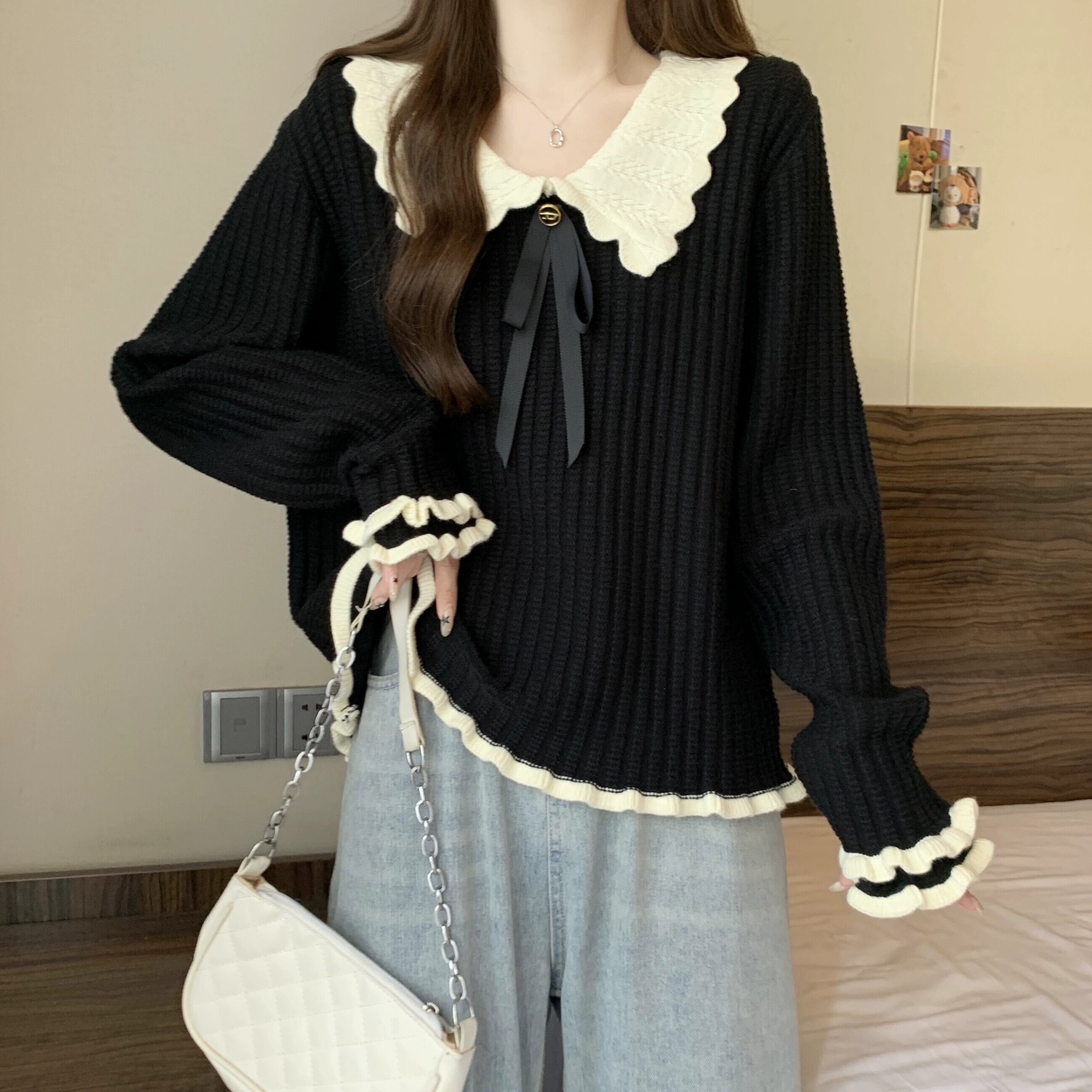 大きいサイズのセーターの女性 2023 新しい冬のデザイン、対照的な色、人形の襟、真菌エッジ、痩身、肉を覆うトップ、トレンディな 大きめサイズ ウィンター 冬物 8884132141070654