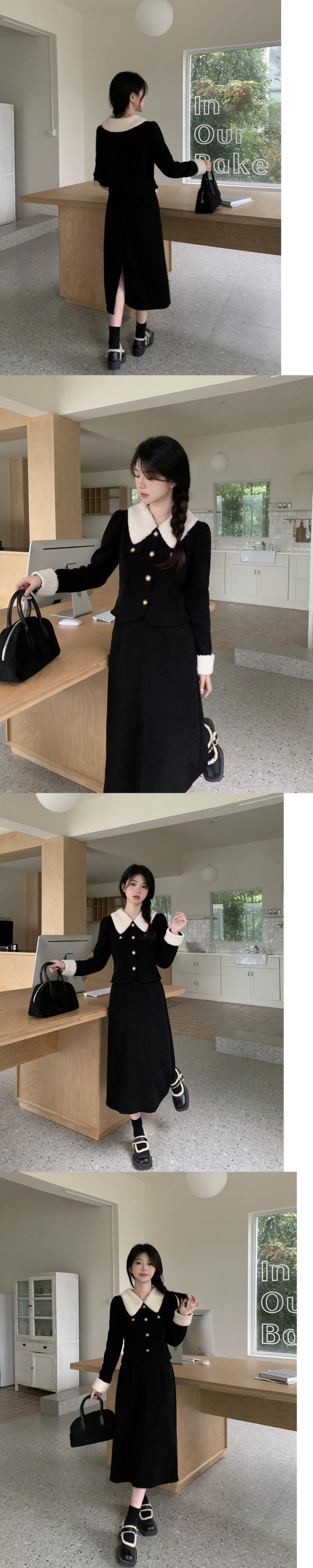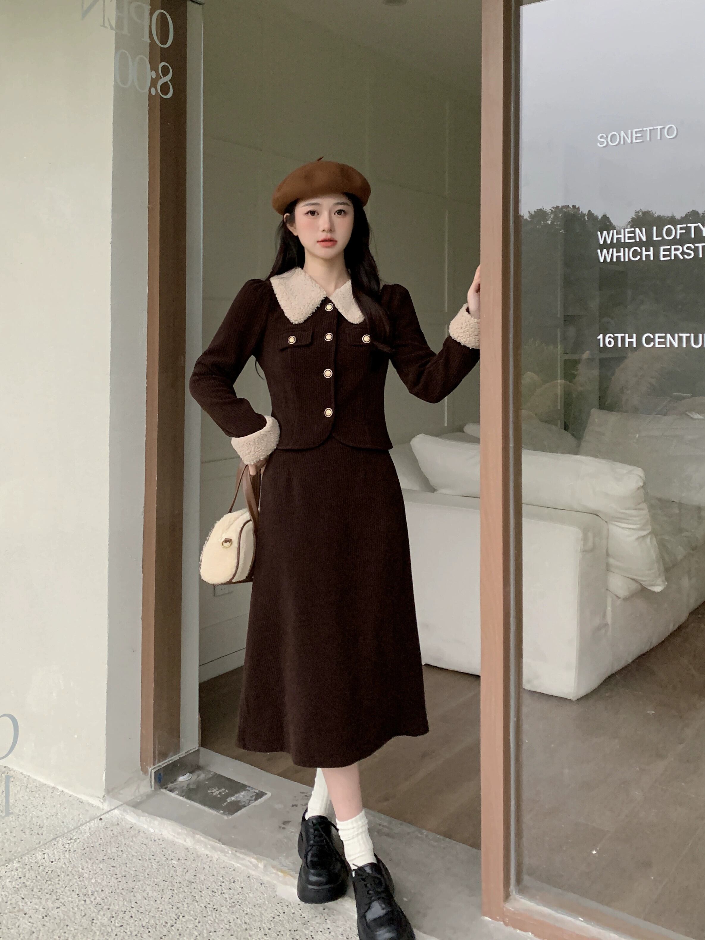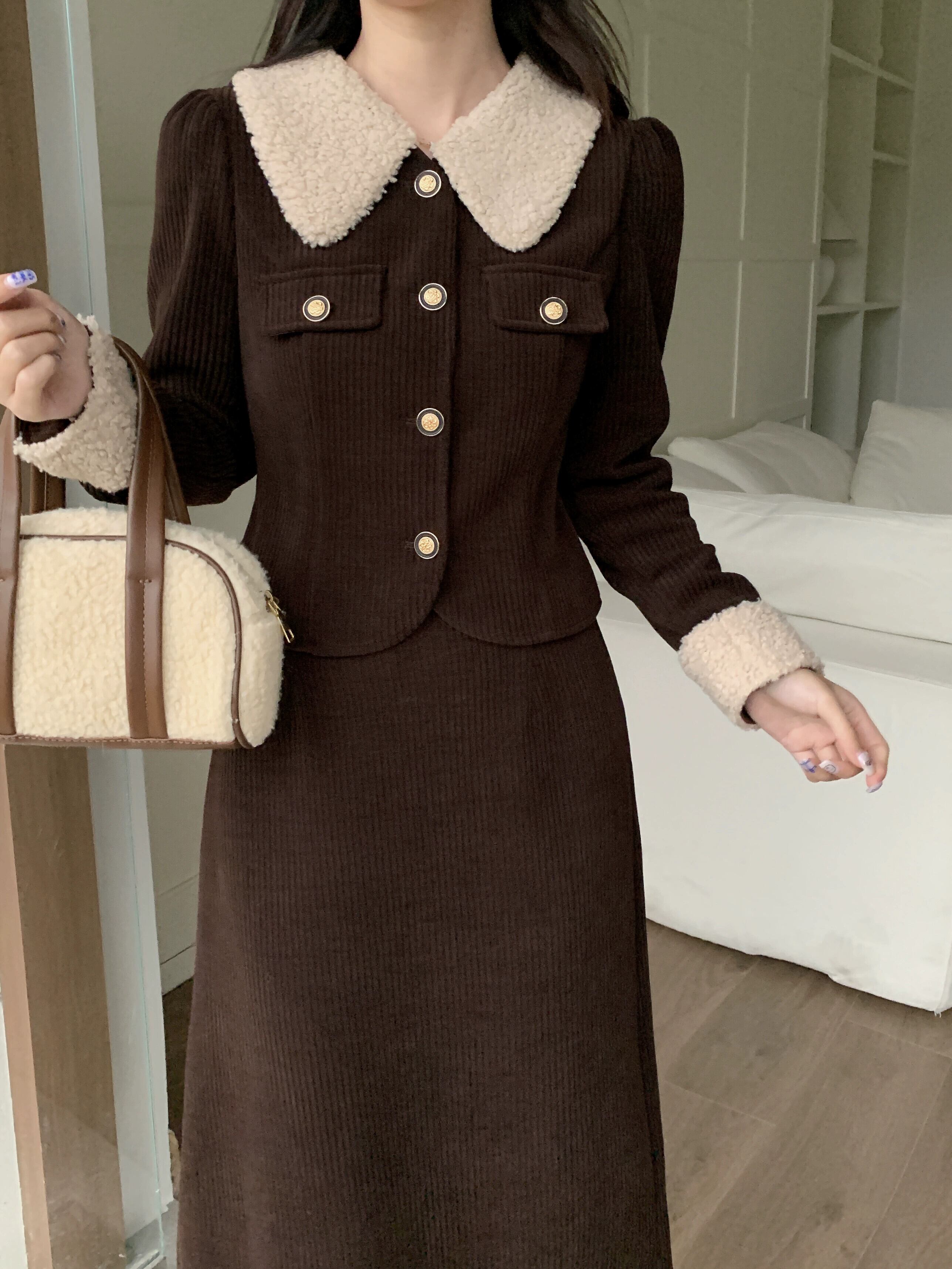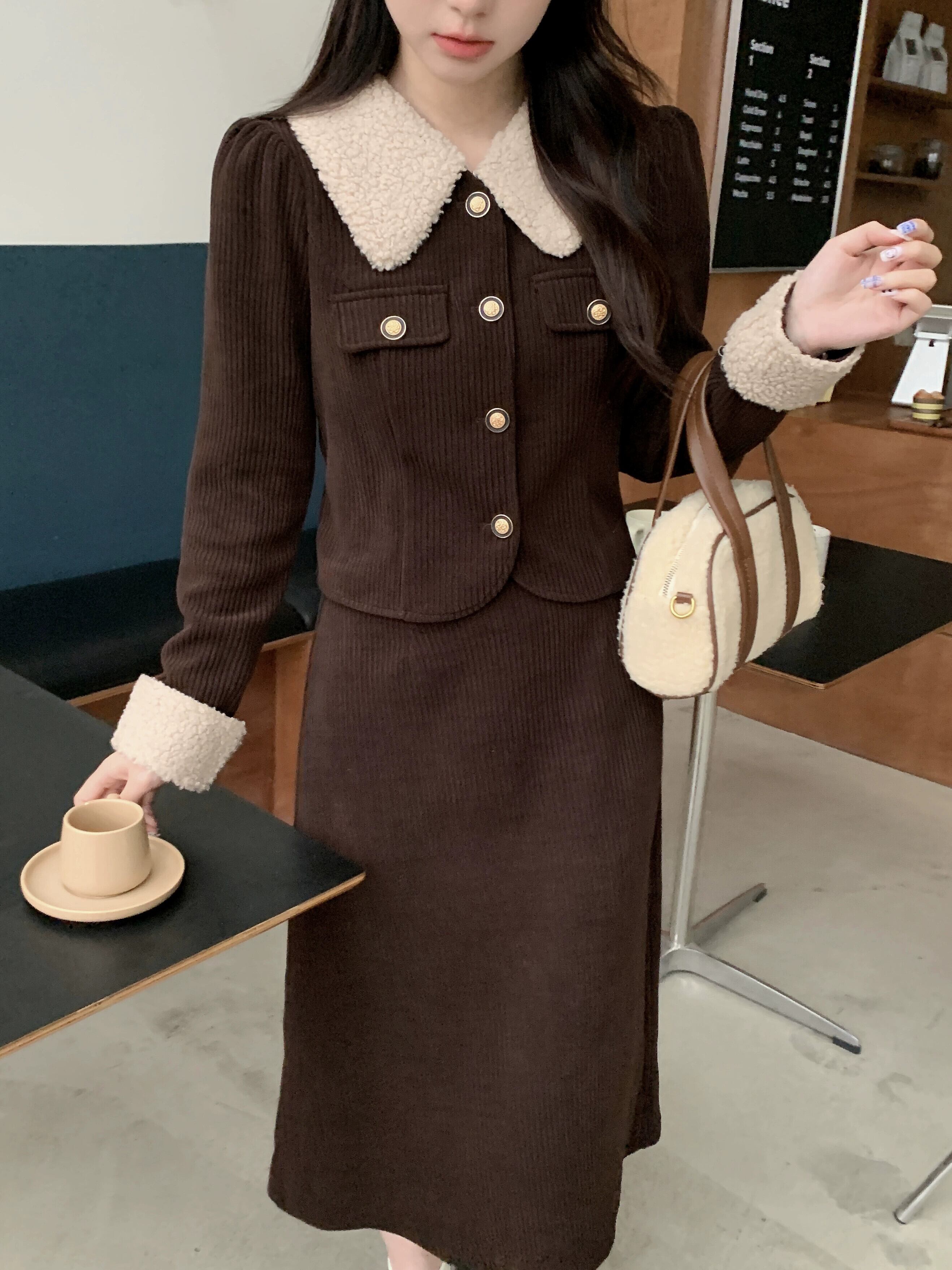 色:コーヒートップ,コーヒー色のスカート,ブラックトップ,黒スカート,コーヒーカラースーツ,黒いスーツ