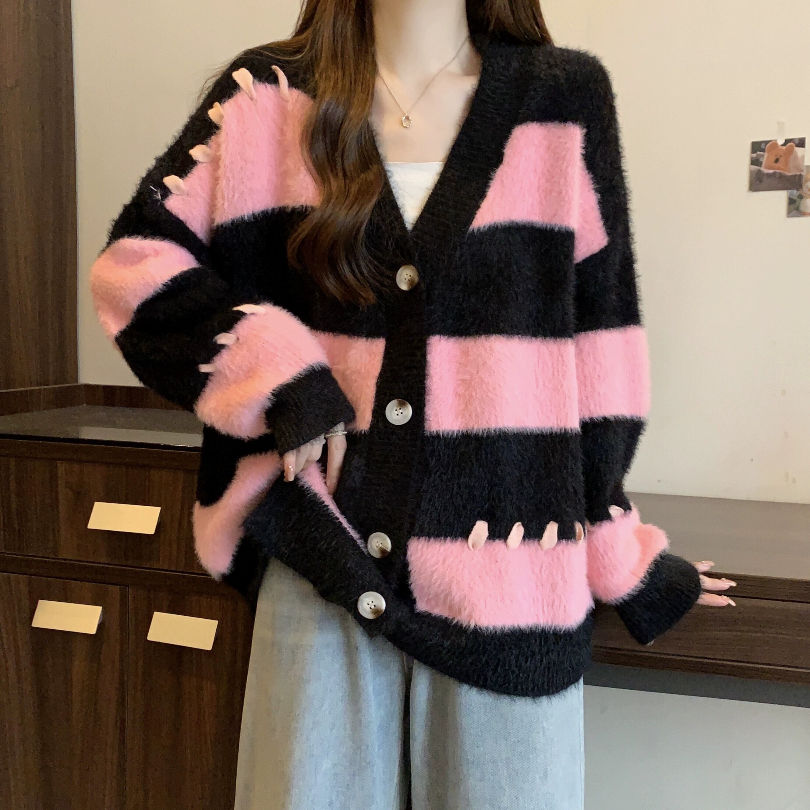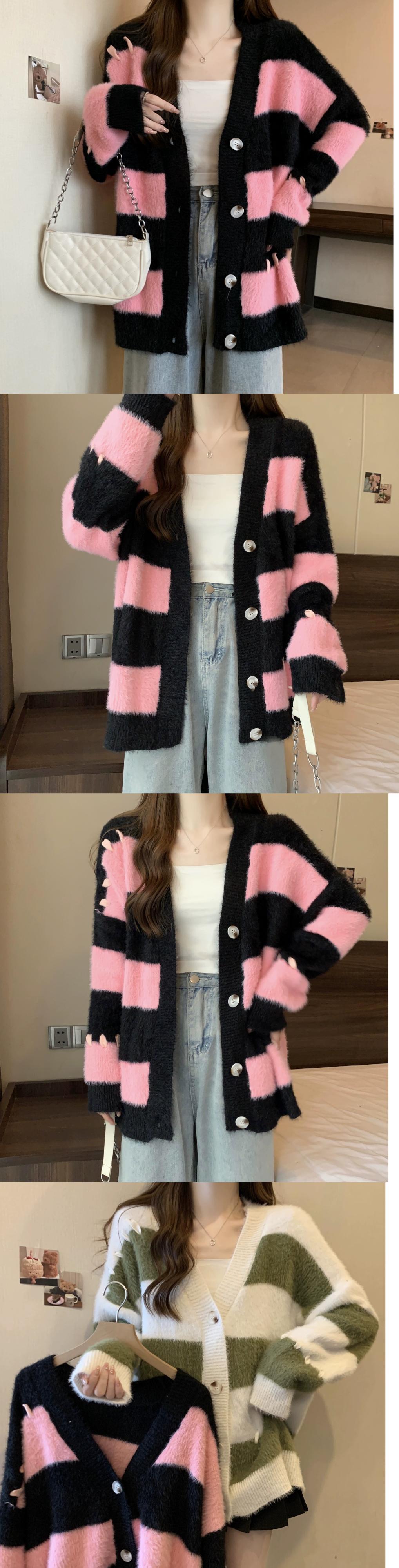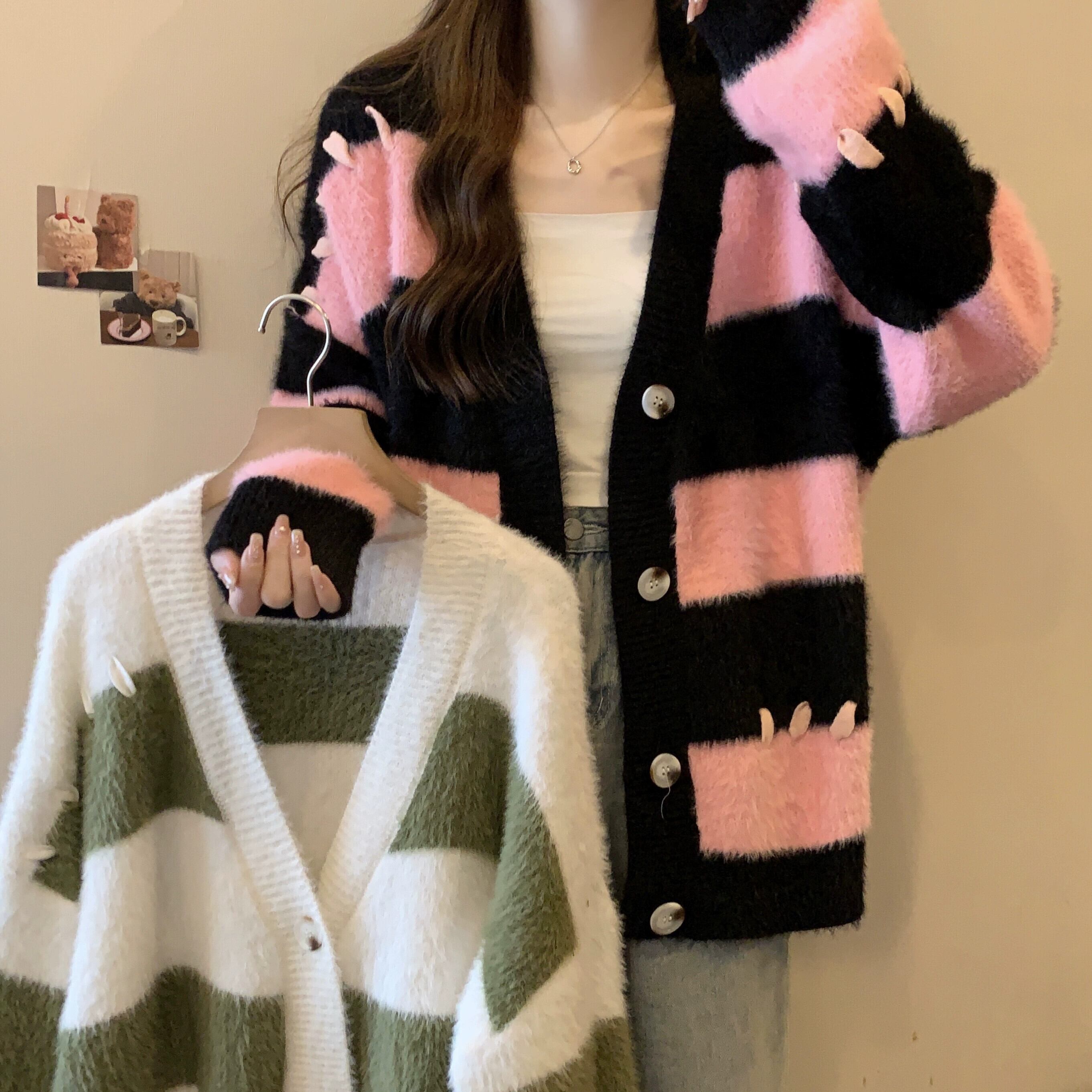 プラスサイズの婦人服ファットミリメートル秋の新スタイル 2023 ルーズストライプ対照的なニットセーター V ネック気質シックなトップ 大きめサイズ オータム 秋物 Vネック 8884139590335711