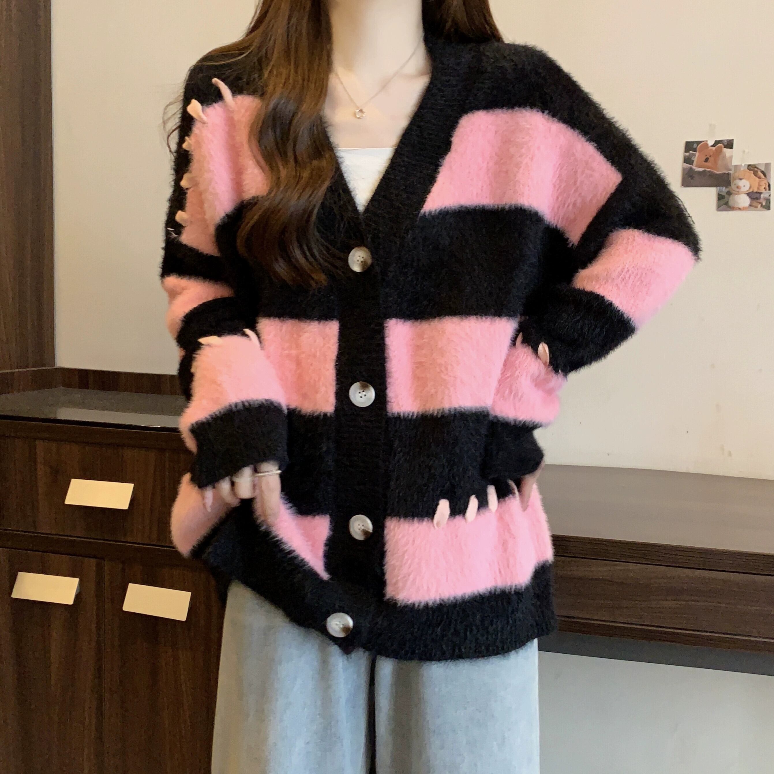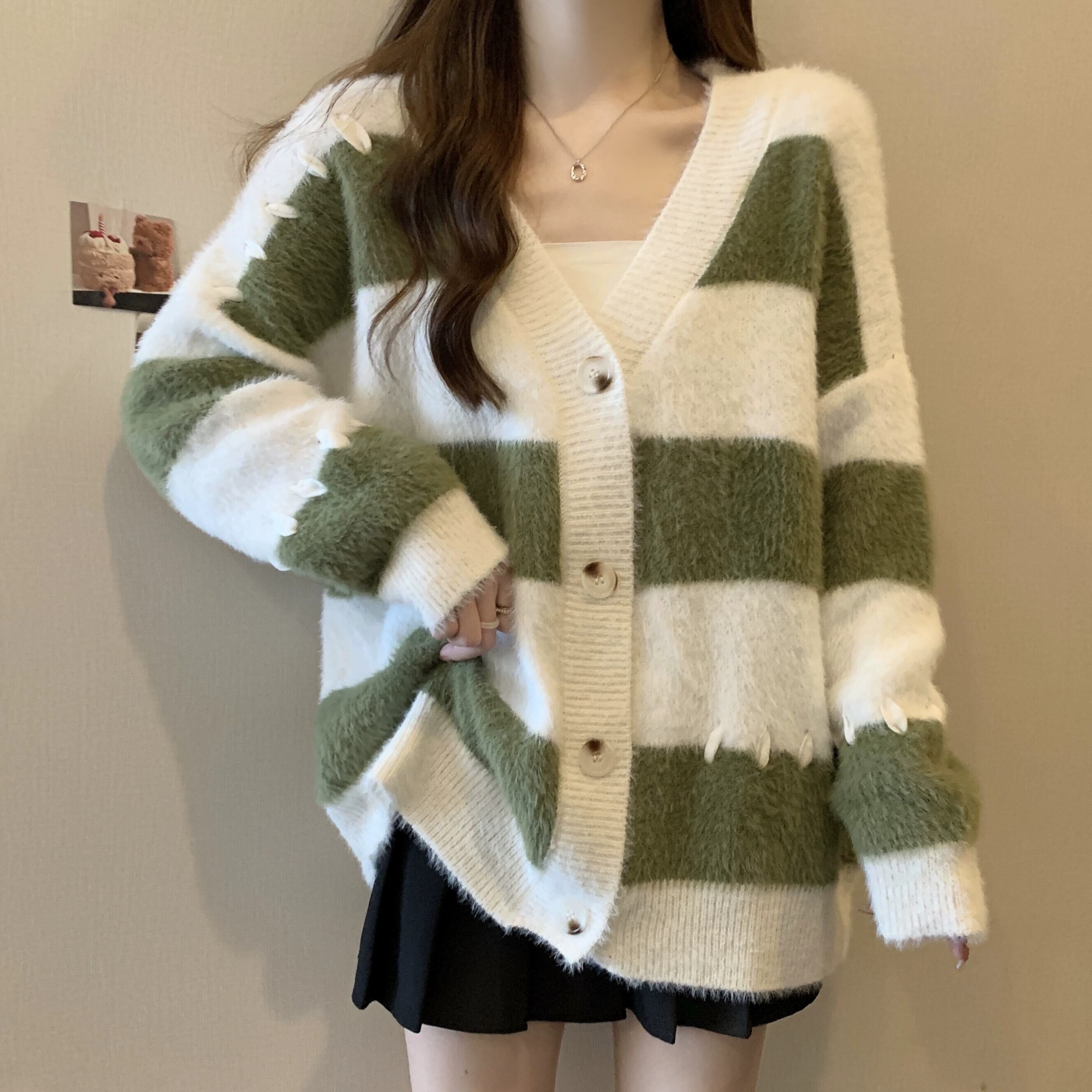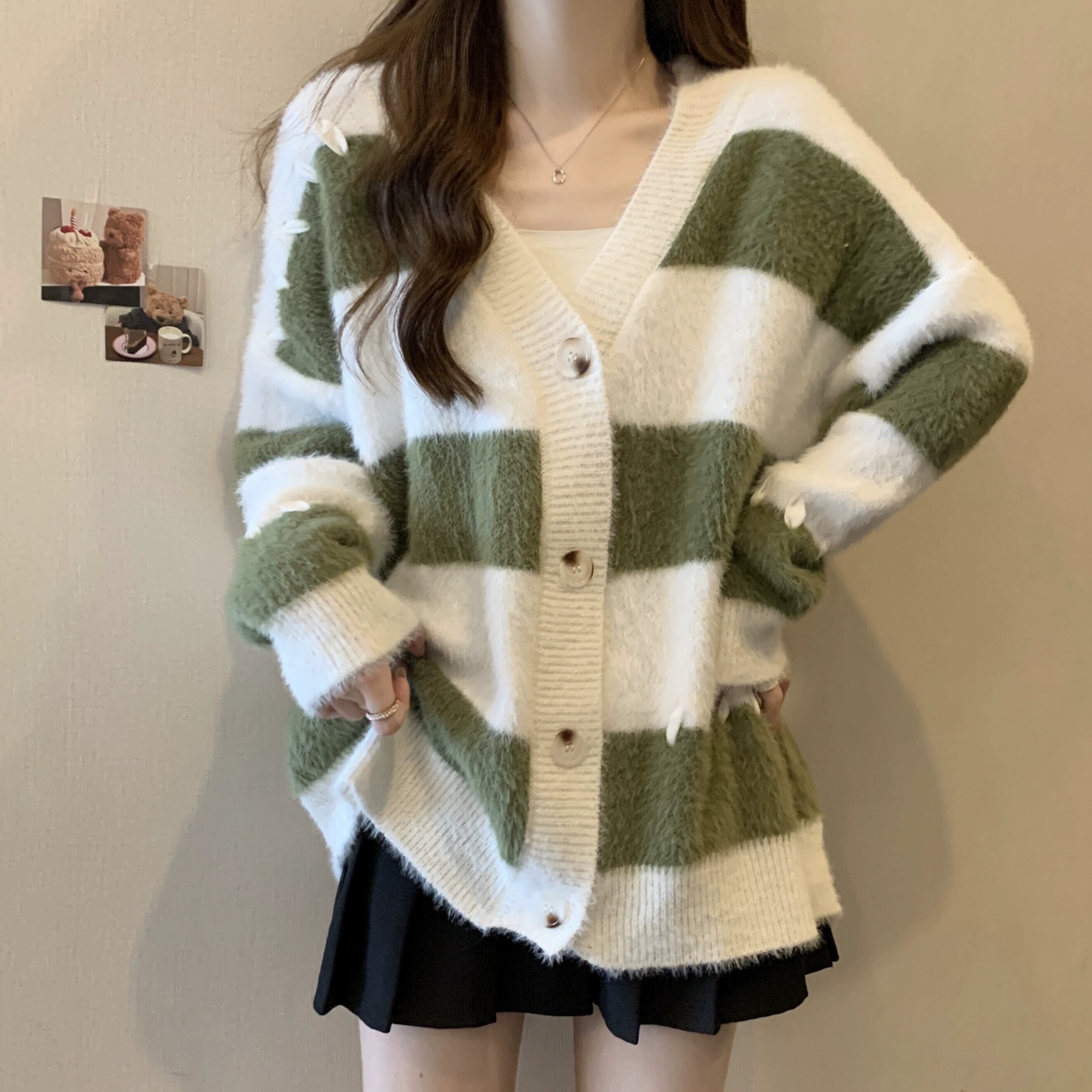 プラスサイズの婦人服ファットミリメートル秋の新スタイル 2023 ルーズストライプ対照的なニットセーター V ネック気質シックなトップ 大きめサイズ オータム 秋物 Vネック 8884139590335711