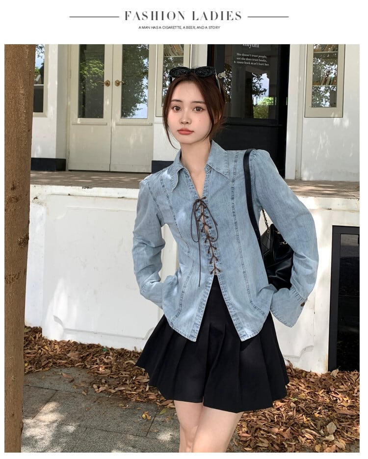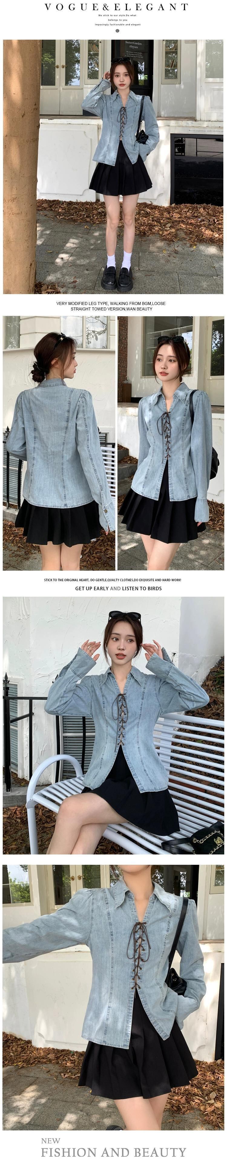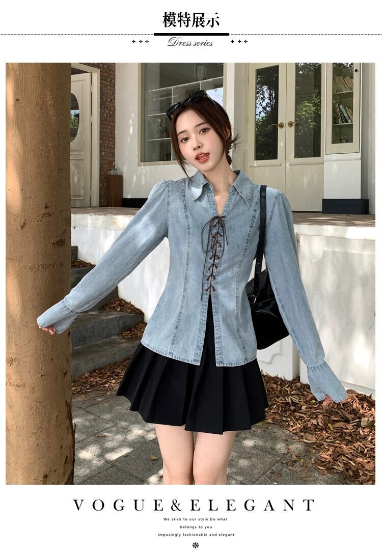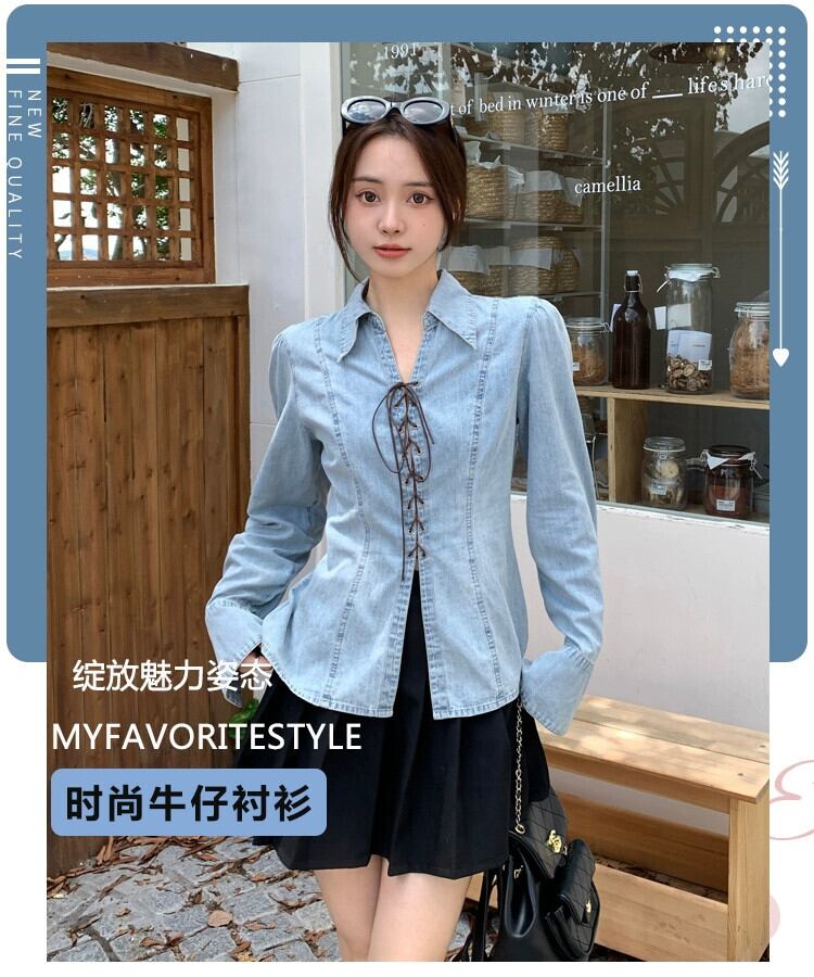 プラスサイズの婦人服 2023 秋服脂肪を減らす年齢気質デザインデニムシャツニッチクロスストラップトップ 大きめサイズ オータム 秋物 8884167634749952