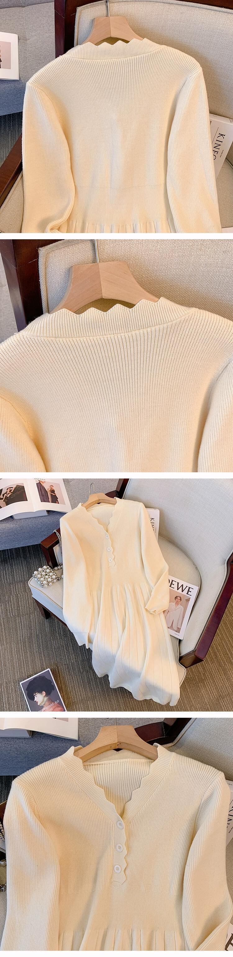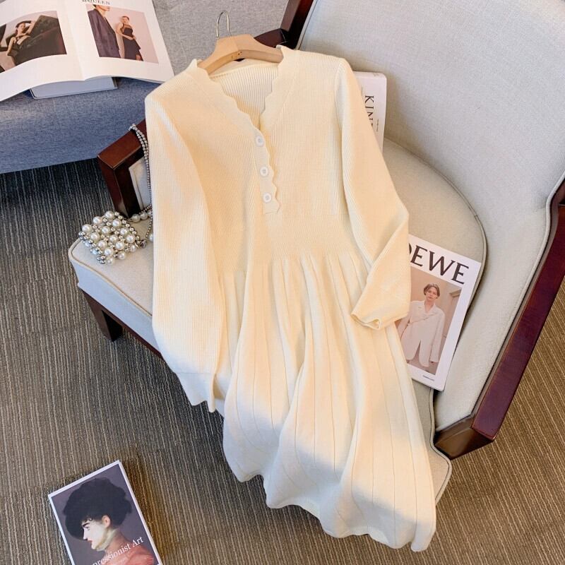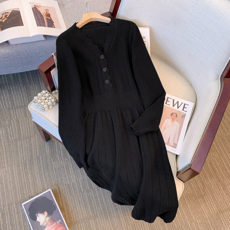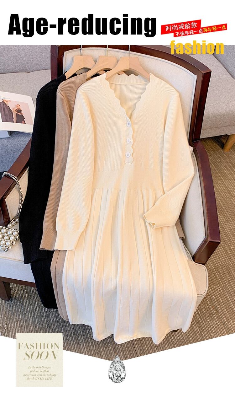 プラスサイズの女性の 2023 秋の新しいスタイルファット mm 気質 V ネック長袖ファッショナブルなスリムなソリッドカラーのニットドレストレンディ ロング 大きめサイズ オータム 秋物 Vネック 8884172838142167