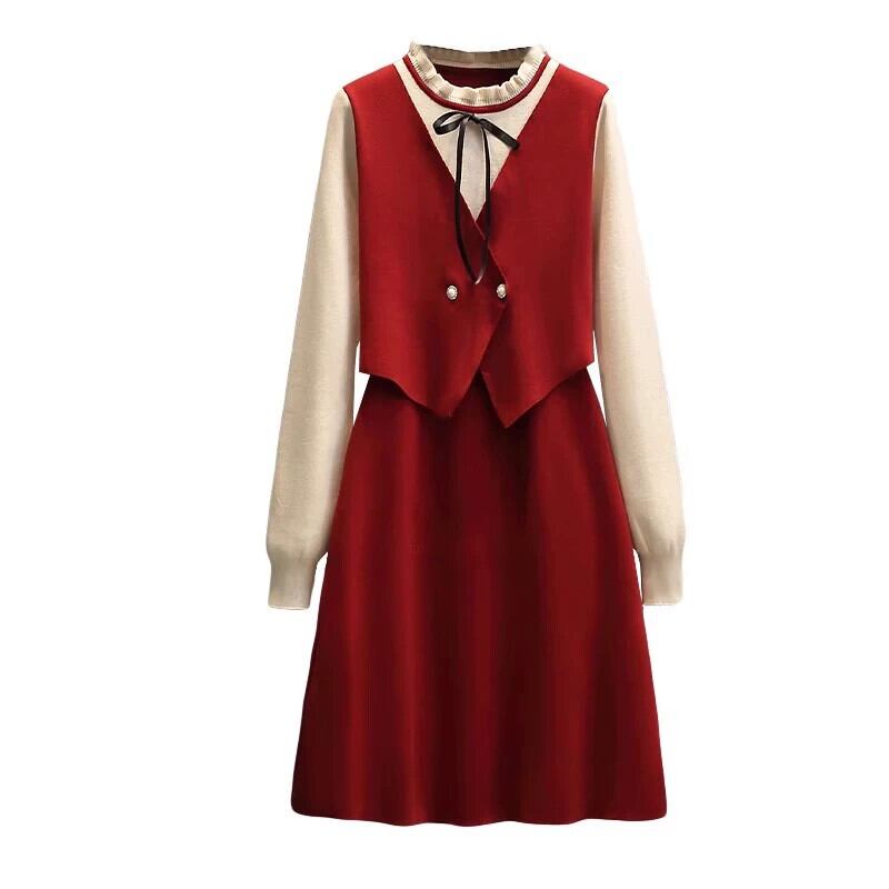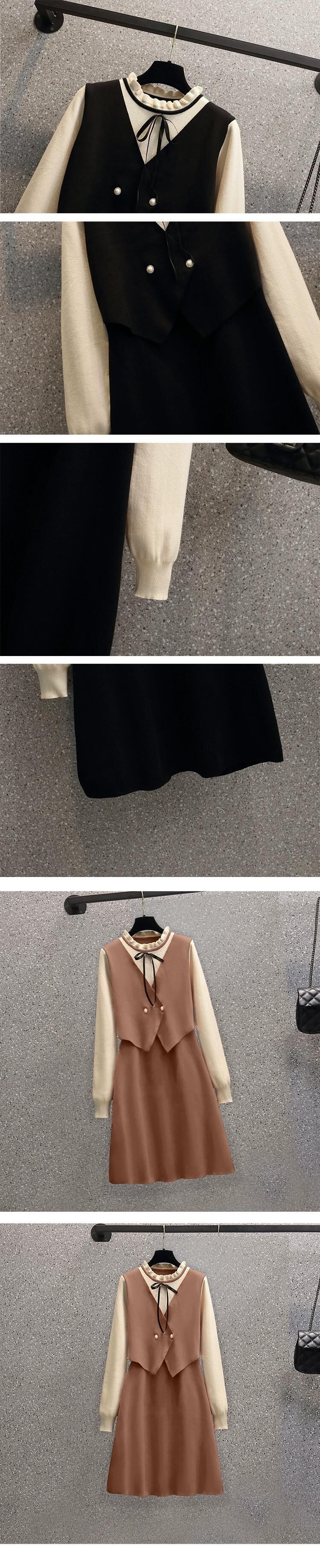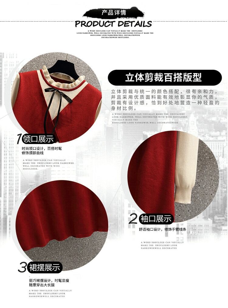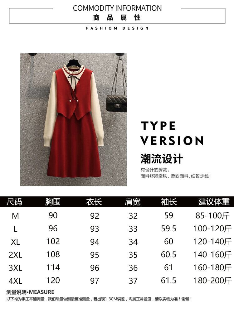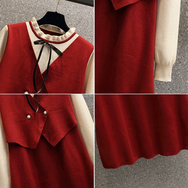 プラスサイズの女性の 2023 新しい秋スタイル脂肪 mm 気質フレンチフェイクツーピース年齢を減らすお腹カバー痩身ニットドレス 大きめサイズ オータム 秋物 8884158065067549