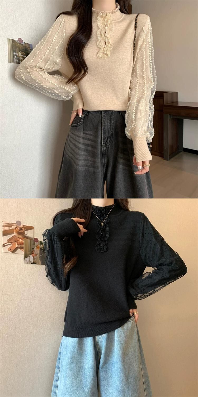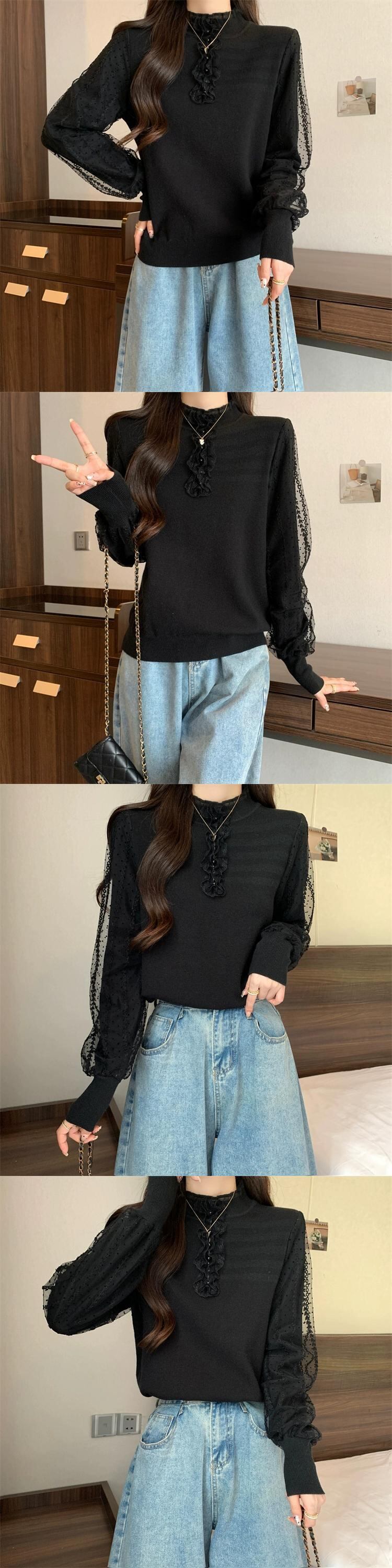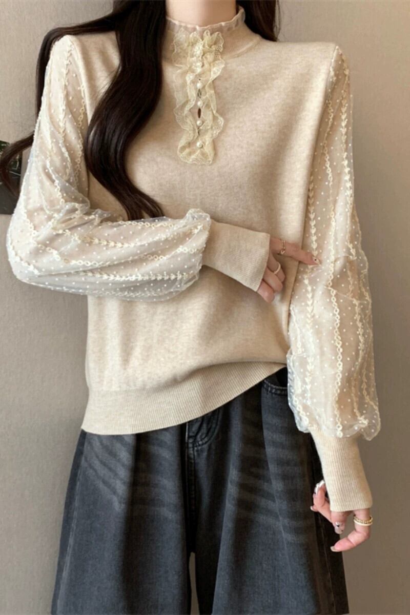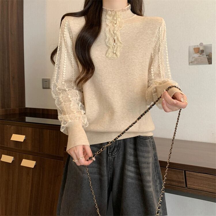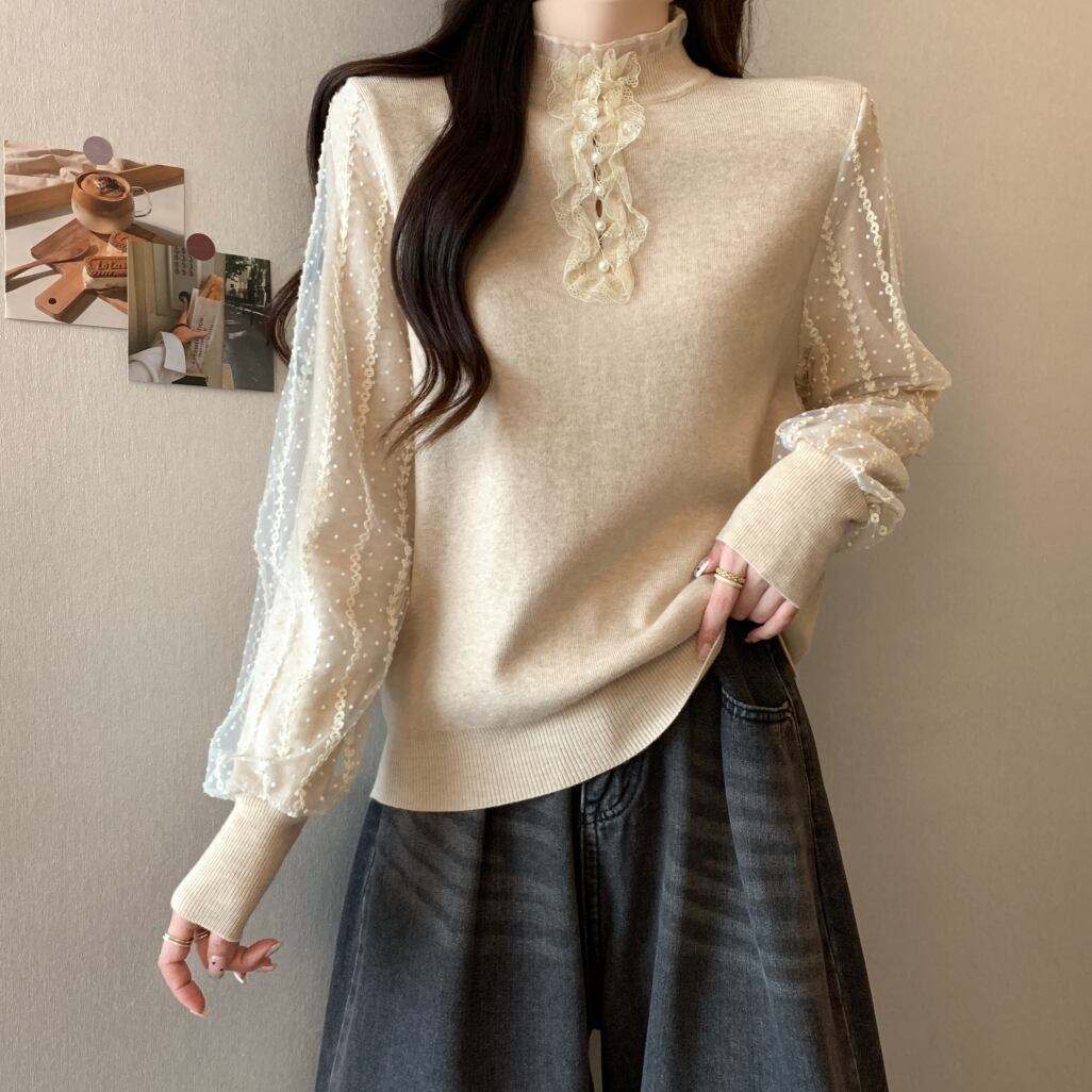 プラスサイズの女性の脂肪 mm 二重層スリーブレーススプライシングトップ秋の新 2023 eign スタイルボトミング多目的セーター 大きめサイズ オータム 秋物 8884190590848954