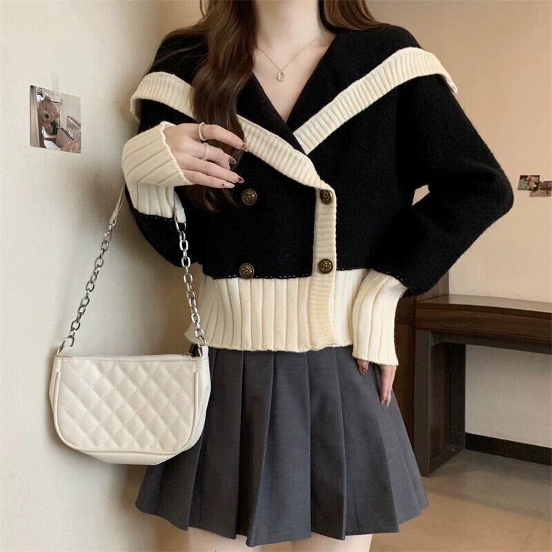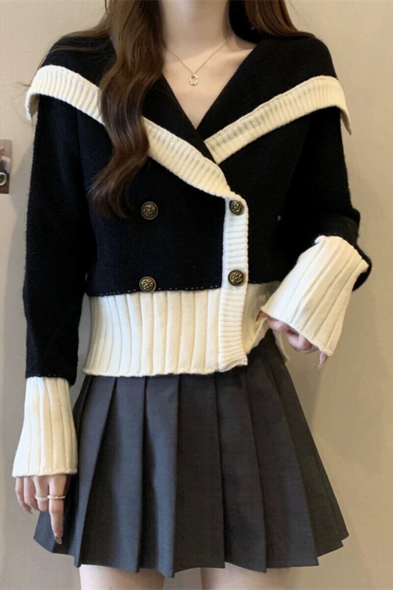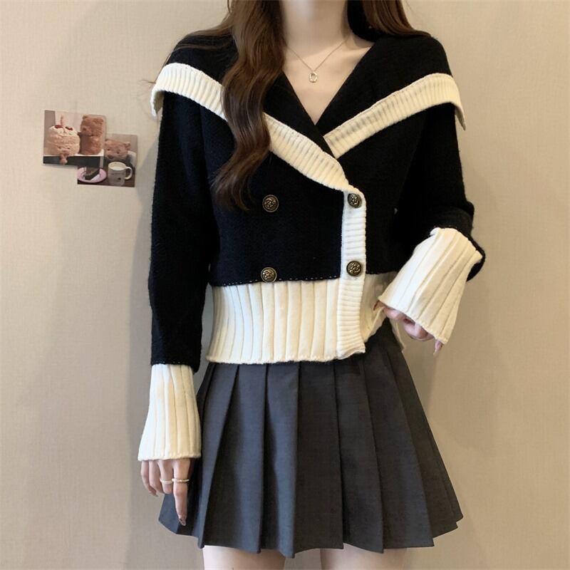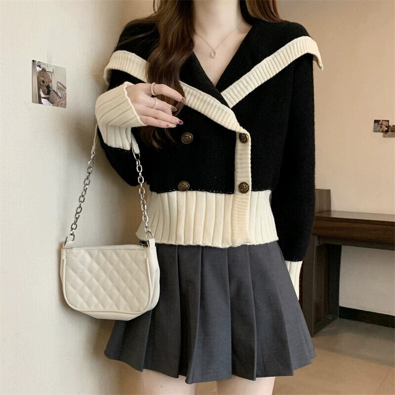 プラスサイズの女性のショートセーター女性の秋冬 2023 新デザインネイビーカラー配色レトロダブルブレストトップ 大きめサイズ オータム 秋物 ウィンター 冬物 8884126800688041