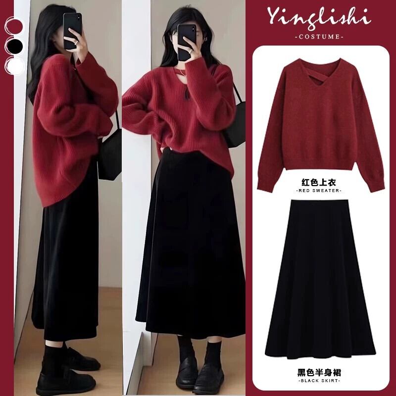 プラスサイズの婦人服 2023 トレンディな秋の新しい脂肪姉妹赤お祝い衣装完全なセットのわずかに脂肪のドレススーツ女性 レッド 大きめサイズ オータム 秋物 8884192475851103