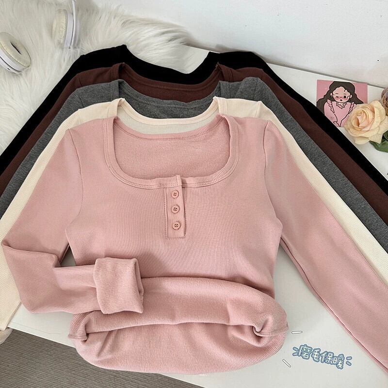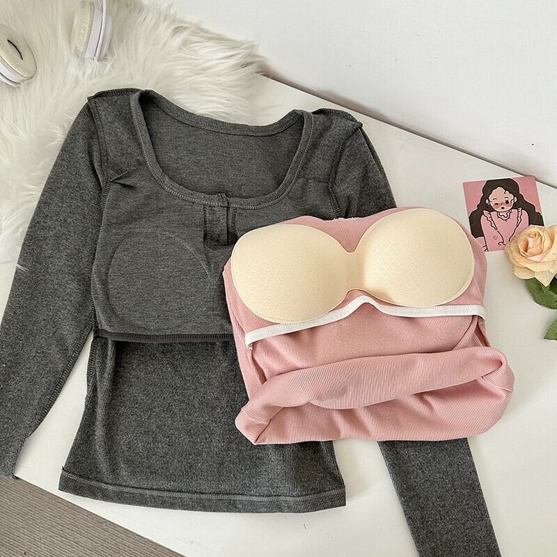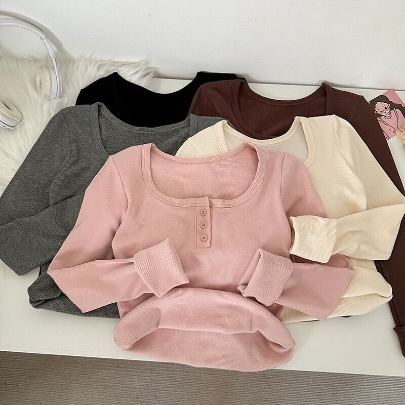 プラスサイズ秋の新スタイルプラスベルベットインナーボトリングシャツ女性脂肪 mm 痩身トップ胸パッド付きピンク長袖 T シャツトレンディ ロング 大きめサイズ オータム 秋物 Tシャツ 8884112110195509