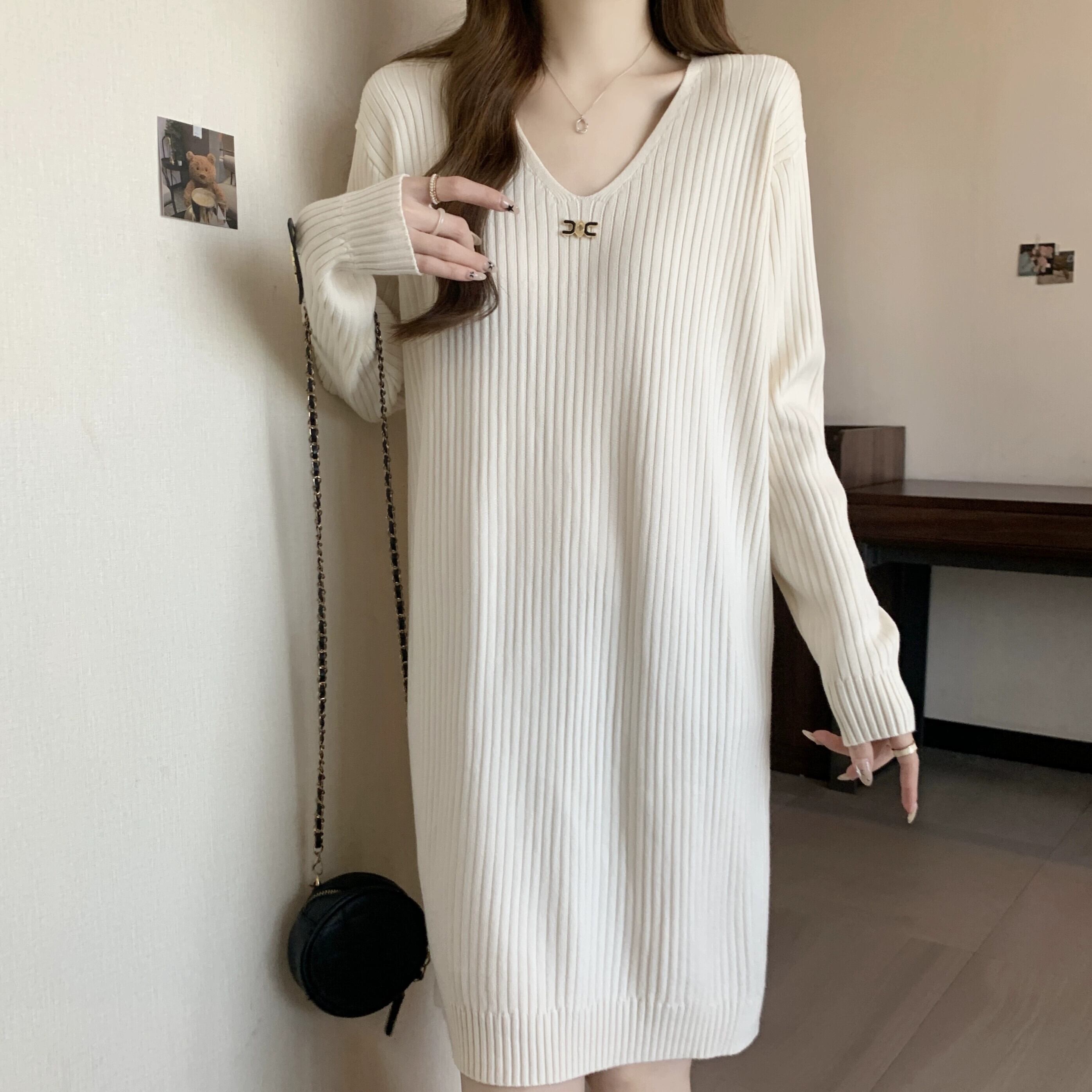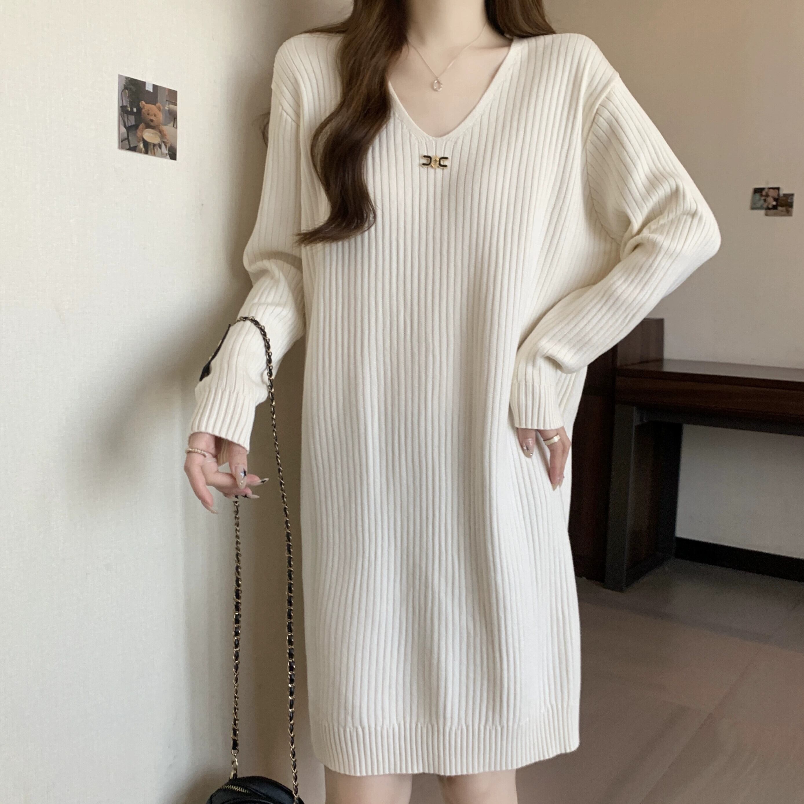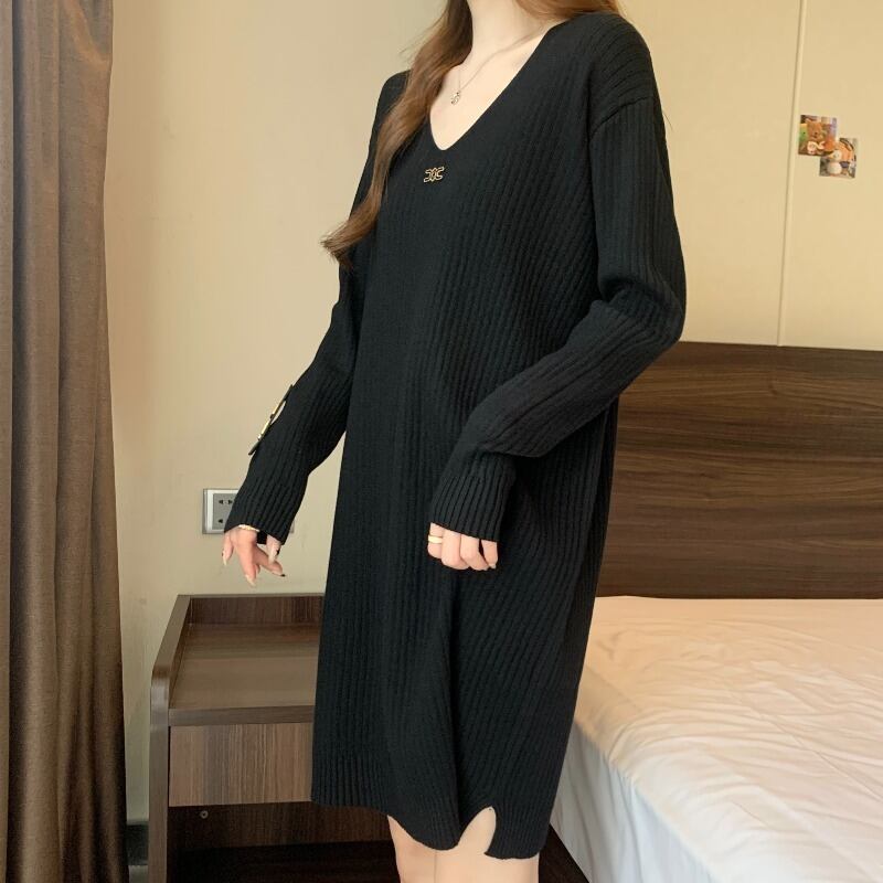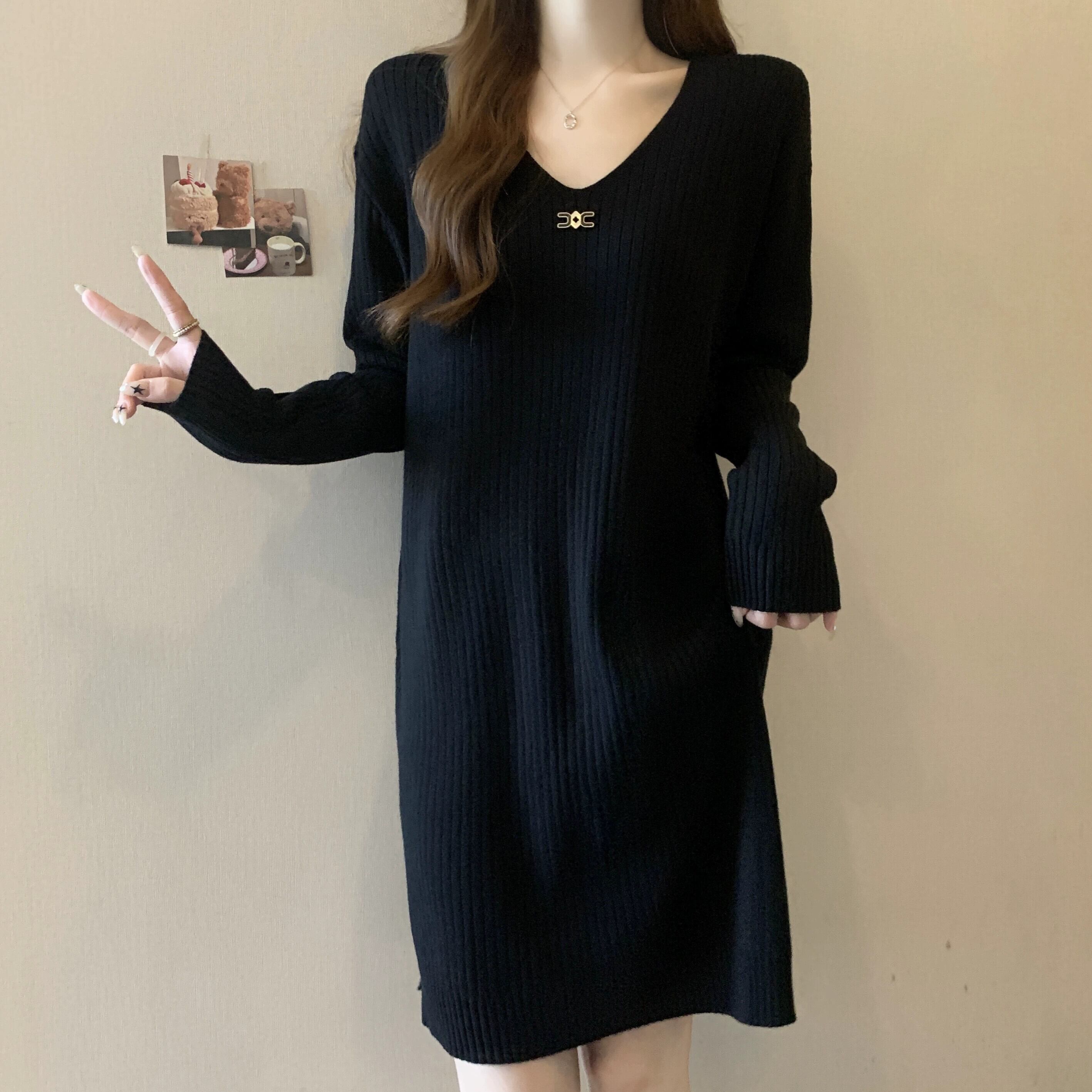 プラスサイズの婦人服 2023 冬の新スタイルファットシスターハイエンドシンプルな気質 V ネックスリムニットドレス女性 大きめサイズ ウィンター 冬物 Vネック 8884156632260451