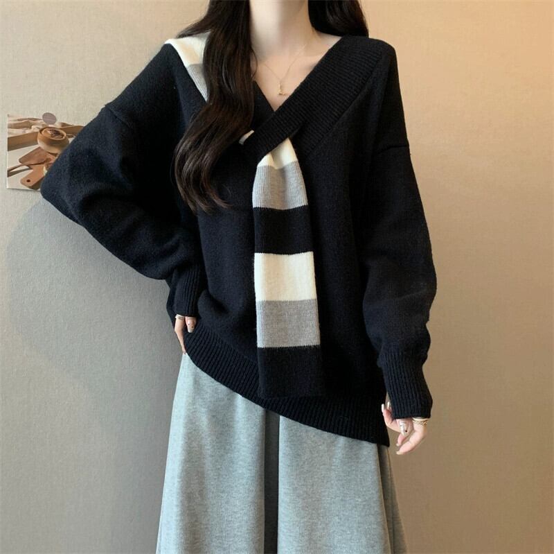 プラスサイズの女性の脂肪 mm 怠惰なスタイル腹カバートップ冬の新 2023 スプライシング偽ツーピースストライプセーター 大きめサイズ ウィンター 冬物 8884148414018471